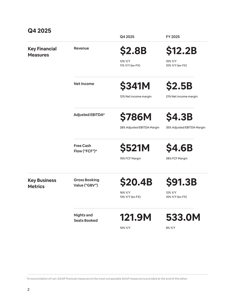 Q4 2025 Q4 2025 FY 2025 Revenue Key Financial $2.8B $12.2B Measures 12% Y/Y 10% Y/Y 11% Y/Y (ex-FX) 10% Y/Y (ex-FX) Net Income $341M $2.5B 12% Net income margin 21% Net income margin Adjusted EBITDA* $786M $4.3B 28% Adjusted EBITDA Margin 35% Adjusted EBITDA Margin Free Cash $521M $4.6B Flow (“FCF”)* 19% FCF Margin 38% FCF Margin Gross Booking Key Business $20.4B $91.3B Value (“GBV”) Metrics 16% Y/Y 12% Y/Y 13% Y/Y (ex-FX) 10% Y/Y (ex-FX) Nights and 121.9M 533.0M Seats Booked 10% Y/Y 8% Y/Y *A reconciliation of non-GAAP financial measures to the most comparable GAAP measures is provided at the end of this letter. 2