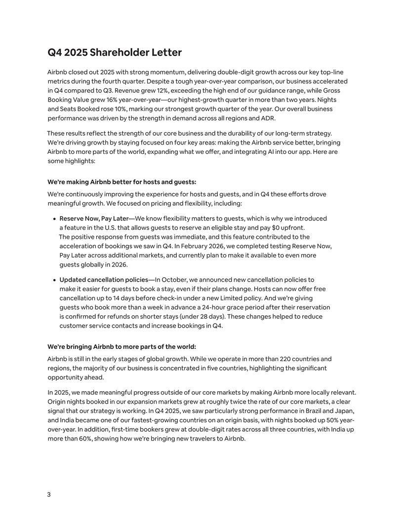 Q4 2025 Shareholder Letter Airbnb closed out 2025 with strong momentum, delivering double-digit growth across our key top-line metrics during the fourth quarter. Despite a tough year-over-year comparison, our business accelerated in Q4 compared to Q3. Revenue grew 12%, exceeding the high end of our guidance range, while Gross Booking Value grew 16% year-over-year—our highest-growth quarter in more than two years. Nights and Seats Booked rose 10%, marking our strongest growth quarter of the year. Our overall business performance was driven by the strength in demand across all regions and ADR. These results reflect the strength of our core business and the durability of our long-term strategy. We’re driving growth by staying focused on four key areas: making the Airbnb service better, bringing Airbnb to more parts of the world, expanding what we offer, and integrating AI into our app. Here are some highlights: We’re making Airbnb better for hosts and guests: We’re continuously improving the experience for hosts and guests, and in Q4 these eo ff rts drove meaningful growth. We focused on pricing and flexibility, including: ¦ Reserve Now, Pay Later—We know flexibility matters to guests, which is why we introduced a feature in the U.S. that allows guests to reserve an eligible stay and pay $0 upfront. The positive response from guests was immediate, and this feature contributed to the acceleration of bookings we saw in Q4. In February 2026, we completed testing Reserve Now, Pay Later across additional markets, and currently plan to make it available to even more guests globally in 2026. ¦ Updated cancellation policies—In October, we announced new cancellation policies to make it easier for guests to book a stay, even if their plans change. Hosts can now offer free cancellation up to 14 days before check-in under a new Limited policy. And we’re giving guests who book more than a week in advance a 24-hour grace period after their reservation is confirmed for refunds on shorter stays (under 28 days). These changes helped to reduce customer service contacts and increase bookings in Q4. We’re bringing Airbnb to more parts of the world: Airbnb is still in the early stages of global growth. While we operate in more than 220 countries and regions, the majority of our business is concentrated in five countries, highlighting the significant opportunity ahead. In 2025, we made meaningful progress outside of our core markets by making Airbnb more locally relevant. Origin nights booked in our expansion markets grew at roughly twice the rate of our core markets, a clear signal that our strategy is working. In Q4 2025, we saw particularly strong performance in Brazil and Japan, and India became one of our fastest-growing countries on an origin basis, with nights booked up 50% year- over-year. In addition, first-time bookers grew at double-digit rates across all three countries, with India up more than 60%, showing how we’re bringing new travelers to Airbnb. 3