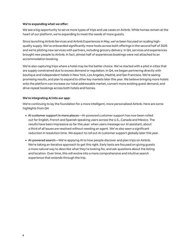 We’re expanding what we oe ff r: We see a big opportunity to serve more types of trips and use cases on Airbnb. While homes remain at the heart of our platform, we’re expanding to meet the needs of more guests. Since launching Airbnb Services and Airbnb Experiences in May, we’ve been focused on scaling high- quality supply. We’ve onboarded significantly more hosts across both offerings in the second half of 2025 and we’re piloting new services with partners, including grocery delivery. In Q4, services and experiences brought new people to Airbnb. In fact, almost half of experiences bookings were not attached to an accommodation booking. We’re also capturing trips where a hotel may be the better choice. We’ve started with a pilot in cities that are supply constrained due to excess demand or regulation. In Q4, we began partnering directly with boutique and independent hotels in New York, Los Angeles, Madrid, and San Francisco. We’re seeing promising results, and plan to expand to other key markets later this year. We believe bringing more hotels onto the platform can increase our total addressable market, convert more existing guest demand, and drive repeat bookings across both hotels and homes. We’re integrating AI into our app: We’re continuing to lay the foundation for a more intelligent, more personalized Airbnb. Here are some highlights from Q4: ¦ AI customer support in more places—AI-powered customer support has now been rolled out for English, French and Spanish speaking users across the U.S., Canada and Mexico. The results have been impressive so far this year: when users message our AI assistant, about a third of all issues are resolved without needing an agent. We’ve also seen a significant reduction in resolution time. We expect to roll out AI customer support globally later this year. ¦ AI-powered search—We’re applying AI to how people discover and plan trips on Airbnb. We’re taking an iterative approach to get this right. Early tests are focused on giving guests a more natural way to describe what they’re looking for, and ask questions about the listing and location. Over time, this will evolve into a more comprehensive and intuitive search experience that extends through the trip. 4