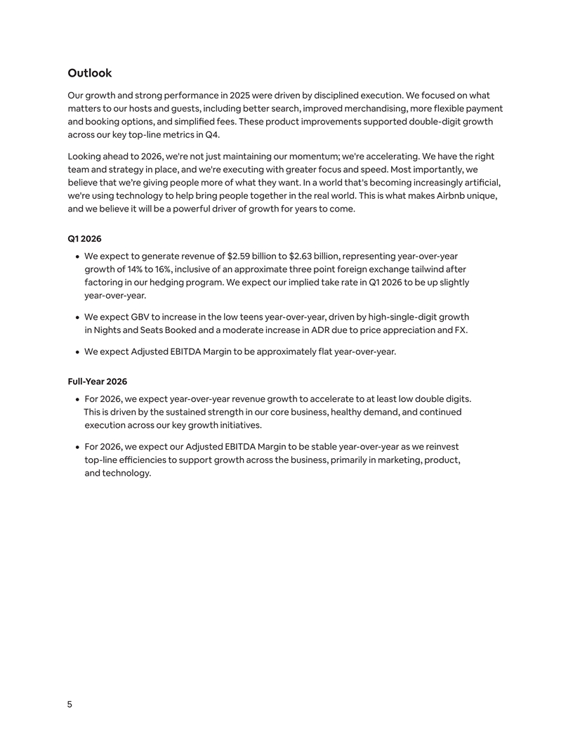 Outlook Our growth and strong performance in 2025 were driven by disciplined execution. We focused on what matters to our hosts and guests, including better search, improved merchandising, more flexible payment and booking options, and simplified fees. These product improvements supported double-digit growth across our key top-line metrics in Q4. Looking ahead to 2026, we're not just maintaining our momentum; we're accelerating. We have the right team and strategy in place, and we're executing with greater focus and speed. Most importantly, we believe that we’re giving people more of what they want. In a world that's becoming increasingly artificial, we're using technology to help bring people together in the real world. This is what makes Airbnb unique, and we believe it will be a powerful driver of growth for years to come. Q1 2026 ¦ We expect to generate revenue of $2.59 billion to $2.63 billion, representing year-over-year growth of 14% to 16%, inclusive of an approximate three point foreign exchange tailwind after factoring in our hedging program. We expect our implied take rate in Q1 2026 to be up slightly year-over-year. ¦ We expect GBV to increase in the low teens year-over-year, driven by high-single-digit growth in Nights and Seats Booked and a moderate increase in ADR due to price appreciation and FX. ¦ We expect Adjusted EBITDA Margin to be approximately flat year-over-year. Full-Year 2026 ¦ For 2026, we expect year-over-year revenue growth to accelerate to at least low double digits. This is driven by the sustained strength in our core business, healthy demand, and continued execution across our key growth initiatives. ¦ For 2026, we expect our Adjusted EBITDA Margin to be stable year-over-year as we reinvest top-line efficiencies to support growth across the business, primarily in marketing, product, and technology. 5