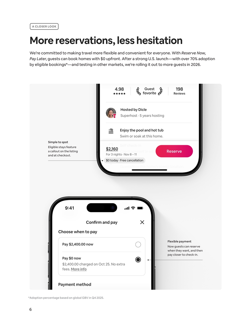 A CLOSER LOOK More reservations, less hesitation We’re committed to making travel more flexible and convenient for everyone. With Reserve Now, Pay Later, guests can book homes with $0 upfront. After a strong U.S. launch—with over 70% adoption by eligible bookings*—and testing in other markets, we’re rolling it out to more guests in 2026. Simple to spot Eligible stays feature a callout on the listing and at checkout. Flexible payment Now guests can reserve when they want, and then pay closer to check-in. *Adoption percentage based on global GBV in Q4 2025. 6
