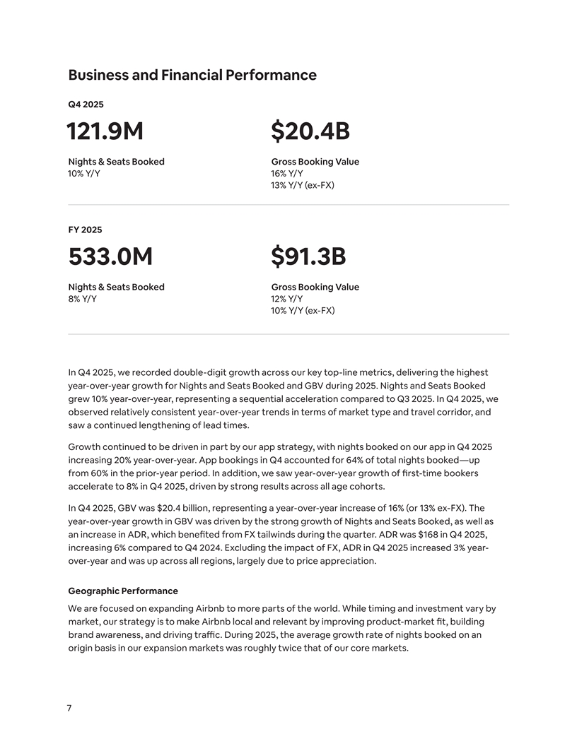 Business and Financial Performance Q4 2025 121.9M $20.4B Nights & Seats Booked Gross Booking Value 10% Y/Y 16% Y/Y 13% Y/Y (ex-FX) FY 2025 533.0M $91.3B Nights & Seats Booked Gross Booking Value 8% Y/Y 12% Y/Y 10% Y/Y (ex-FX) In Q4 2025, we recorded double-digit growth across our key top-line metrics, delivering the highest year-over-year growth for Nights and Seats Booked and GBV during 2025. Nights and Seats Booked grew 10% year-over-year, representing a sequential acceleration compared to Q3 2025. In Q4 2025, we observed relatively consistent year-over-year trends in terms of market type and travel corridor, and saw a continued lengthening of lead times. Growth continued to be driven in part by our app strategy, with nights booked on our app in Q4 2025 increasing 20% year-over-year. App bookings in Q4 accounted for 64% of total nights booked—up from 60% in the prior-year period. In addition, we saw year-over-year growth of first-time bookers accelerate to 8% in Q4 2025, driven by strong results across all age cohorts. In Q4 2025, GBV was $20.4 billion, representing a year-over-year increase of 16% (or 13% ex-FX). The year-over-year growth in GBV was driven by the strong growth of Nights and Seats Booked, as well as an increase in ADR, which benefited from FX tailwinds during the quarter. ADR was $168 in Q4 2025, increasing 6% compared to Q4 2024. Excluding the impact of FX, ADR in Q4 2025 increased 3% year- over-year and was up across all regions, largely due to price appreciation. Geographic Performance We are focused on expanding Airbnb to more parts of the world. While timing and investment vary by market, our strategy is to make Airbnb local and relevant by improving product-market fit, building brand awareness, and driving traffic. During 2025, the average growth rate of nights booked on an origin basis in our expansion markets was roughly twice that of our core markets. 7