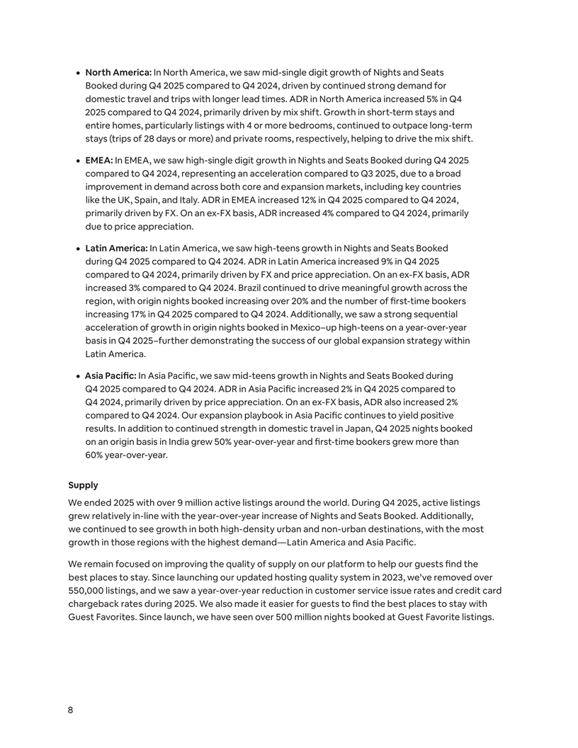 ¦ North America: In North America, we saw mid-single digit growth of Nights and Seats Booked during Q4 2025 compared to Q4 2024, driven by continued strong demand for domestic travel and trips with longer lead times. ADR in North America increased 5% in Q4 2025 compared to Q4 2024, primarily driven by mix shift. Growth in short-term stays and entire homes, particularly listings with 4 or more bedrooms, continued to outpace long-term stays (trips of 28 days or more) and private rooms, respectively, helping to drive the mix shift. ¦ EMEA: In EMEA, we saw high-single digit growth in Nights and Seats Booked during Q4 2025 compared to Q4 2024, representing an acceleration compared to Q3 2025, due to a broad improvement in demand across both core and expansion markets, including key countries like the UK, Spain, and Italy. ADR in EMEA increased 12% in Q4 2025 compared to Q4 2024, primarily driven by FX. On an ex-FX basis, ADR increased 4% compared to Q4 2024, primarily due to price appreciation. ¦ Latin America: In Latin America, we saw high-teens growth in Nights and Seats Booked during Q4 2025 compared to Q4 2024. ADR in Latin America increased 9% in Q4 2025 compared to Q4 2024, primarily driven by FX and price appreciation. On an ex-FX basis, ADR increased 3% compared to Q4 2024. Brazil continued to drive meaningful growth across the region, with origin nights booked increasing over 20% and the number of first-time bookers increasing 17% in Q4 2025 compared to Q4 2024. Additionally, we saw a strong sequential acceleration of growth in origin nights booked in Mexico–up high-teens on a year-over-year basis in Q4 2025–further demonstrating the success of our global expansion strategy within Latin America. ¦ Asia Pacific: In Asia Pacific, we saw mid-teens growth in Nights and Seats Booked during Q4 2025 compared to Q4 2024. ADR in Asia Pacific increased 2% in Q4 2025 compared to Q4 2024, primarily driven by price appreciation. On an ex-FX basis, ADR also increased 2% compared to Q4 2024. Our expansion playbook in Asia Pacific continues to yield positive results. In addition to continued strength in domestic travel in Japan, Q4 2025 nights booked on an origin basis in India grew 50% year-over-year and first-time bookers grew more than 60% year-over-year. Supply We ended 2025 with over 9 million active listings around the world. During Q4 2025, active listings grew relatively in-line with the year-over-year increase of Nights and Seats Booked. Additionally, we continued to see growth in both high-density urban and non-urban destinations, with the most growth in those regions with the highest demand—Latin America and Asia Pacific. We remain focused on improving the quality of supply on our platform to help our guests find the best places to stay. Since launching our updated hosting quality system in 2023, we’ve removed over 550,000 listings, and we saw a year-over-year reduction in customer service issue rates and credit card chargeback rates during 2025. We also made it easier for guests to find the best places to stay with Guest Favorites. Since launch, we have seen over 500 million nights booked at Guest Favorite listings. 8