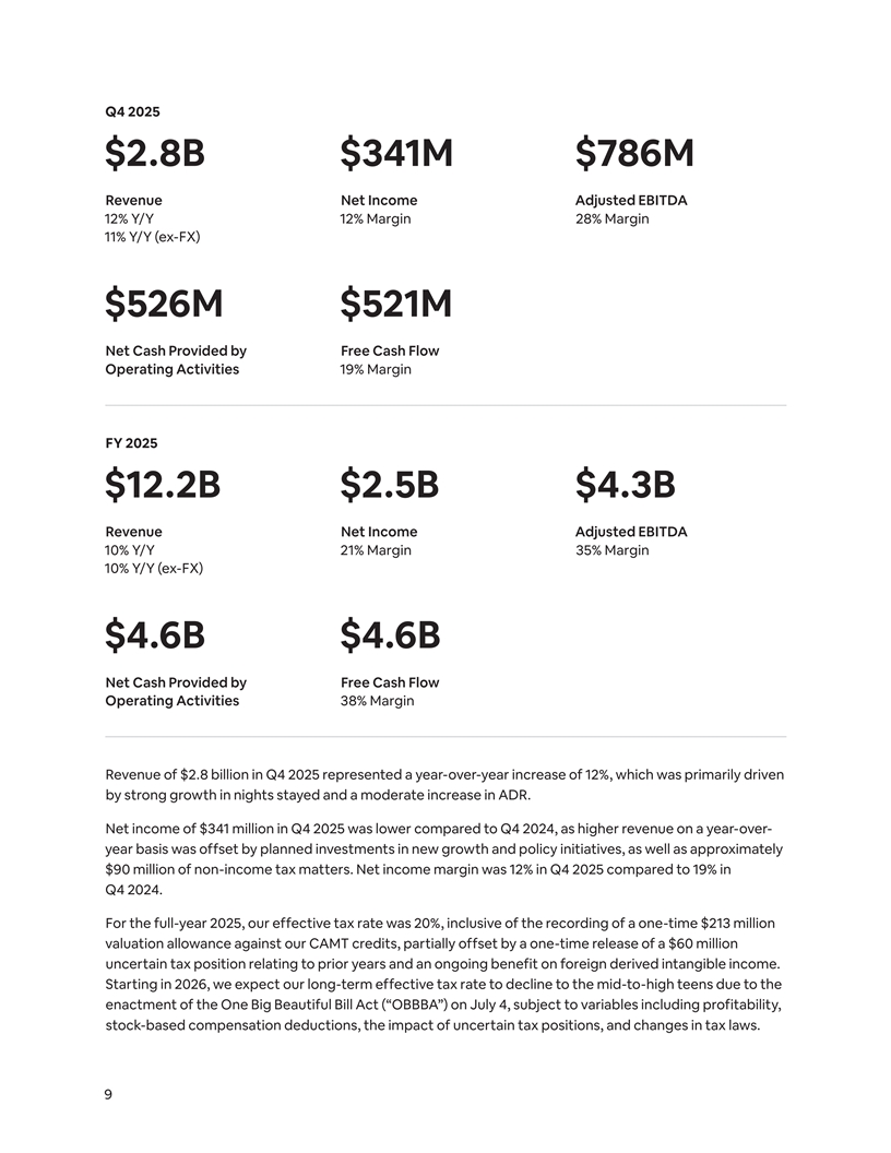 Q4 2025 $2.8B $341M $786M Revenue Net Income Adjusted EBITDA 12% Y/Y 12% Margin 28% Margin 11% Y/Y (ex-FX) $526M $521M Net Cash Provided by Free Cash Flow Operating Activities 19% Margin FY 2025 $12.2B $2.5B $4.3B Revenue Net Income Adjusted EBITDA 10% Y/Y 21% Margin 35% Margin 10% Y/Y (ex-FX) $4.6B $4.6B Net Cash Provided by Free Cash Flow Operating Activities 38% Margin Revenue of $2.8 billion in Q4 2025 represented a year-over-year increase of 12%, which was primarily driven by strong growth in nights stayed and a moderate increase in ADR. Net income of $341 million in Q4 2025 was lower compared to Q4 2024, as higher revenue on a year-over- year basis was offset by planned investments in new growth and policy initiatives, as well as approximately $90 million of non-income tax matters. Net income margin was 12% in Q4 2025 compared to 19% in Q4 2024. For the full-year 2025, our effective tax rate was 20%, inclusive of the recording of a one-time $213 million valuation allowance against our CAMT credits, partially offset by a one-time release of a $60 million uncertain tax position relating to prior years and an ongoing benefit on foreign derived intangible income. Starting in 2026, we expect our long-term effective tax rate to decline to the mid-to-high teens due to the enactment of the One Big Beautiful Bill Act (“OBBBA”) on July 4, subject to variables including profitability, stock-based compensation deductions, the impact of uncertain tax positions, and changes in tax laws. 9