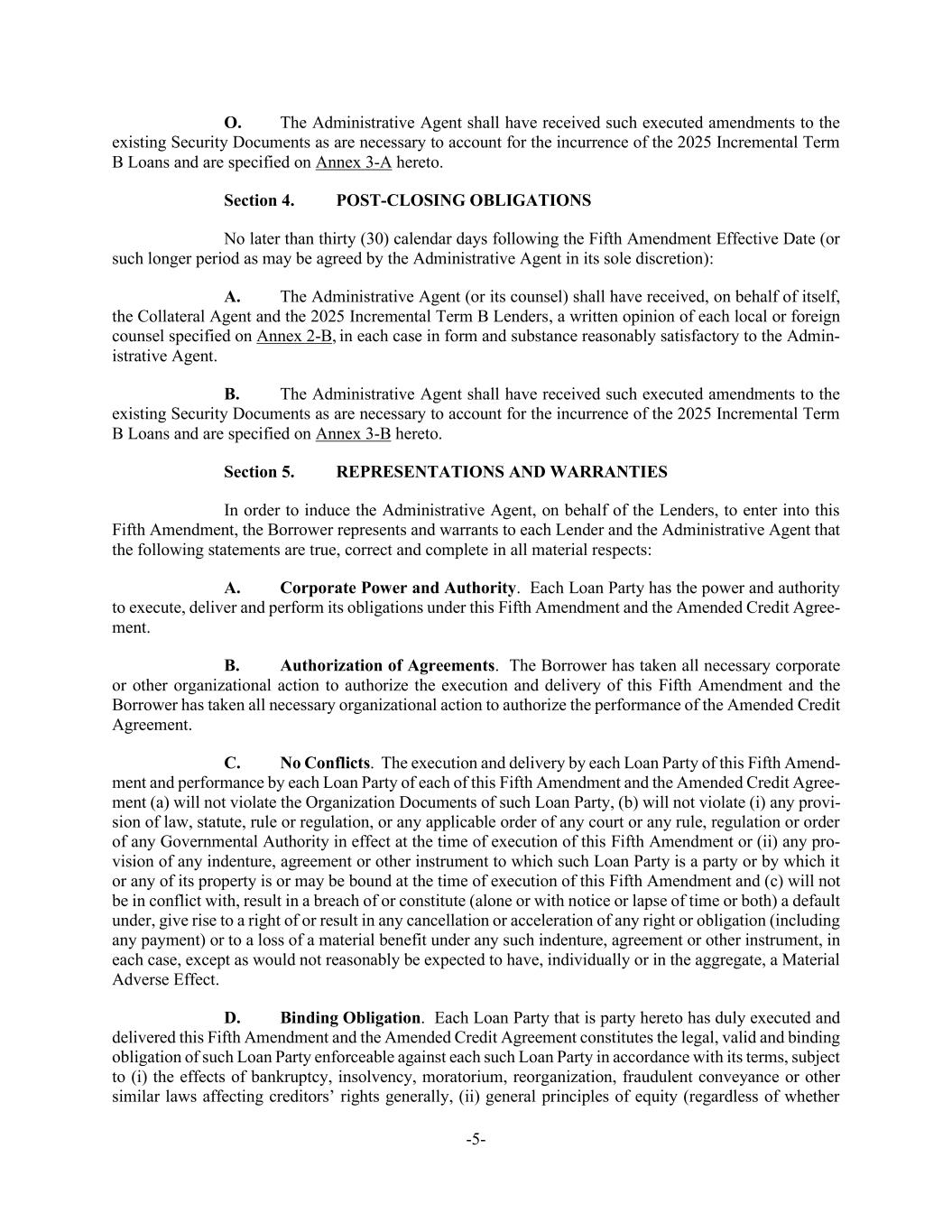 -5- O. The Administrative Agent shall have received such executed amendments to the existing Security Documents as are necessary to account for the incurrence of the 2025 Incremental Term B Loans and are specified on Annex 3-A hereto. Section 4. POST-CLOSING OBLIGATIONS No later than thirty (30) calendar days following the Fifth Amendment Effective Date (or such longer period as may be agreed by the Administrative Agent in its sole discretion): A. The Administrative Agent (or its counsel) shall have received, on behalf of itself, the Collateral Agent and the 2025 Incremental Term B Lenders, a written opinion of each local or foreign counsel specified on Annex 2-B, in each case in form and substance reasonably satisfactory to the Admin- istrative Agent. B. The Administrative Agent shall have received such executed amendments to the existing Security Documents as are necessary to account for the incurrence of the 2025 Incremental Term B Loans and are specified on Annex 3-B hereto. Section 5. REPRESENTATIONS AND WARRANTIES In order to induce the Administrative Agent, on behalf of the Lenders, to enter into this Fifth Amendment, the Borrower represents and warrants to each Lender and the Administrative Agent that the following statements are true, correct and complete in all material respects: A. Corporate Power and Authority. Each Loan Party has the power and authority to execute, deliver and perform its obligations under this Fifth Amendment and the Amended Credit Agree- ment. B. Authorization of Agreements. The Borrower has taken all necessary corporate or other organizational action to authorize the execution and delivery of this Fifth Amendment and the Borrower has taken all necessary organizational action to authorize the performance of the Amended Credit Agreement. C. No Conflicts. The execution and delivery by each Loan Party of this Fifth Amend- ment and performance by each Loan Party of each of this Fifth Amendment and the Amended Credit Agree- ment (a) will not violate the Organization Documents of such Loan Party, (b) will not violate (i) any provi- sion of law, statute, rule or regulation, or any applicable order of any court or any rule, regulation or order of any Governmental Authority in effect at the time of execution of this Fifth Amendment or (ii) any pro- vision of any indenture, agreement or other instrument to which such Loan Party is a party or by which it or any of its property is or may be bound at the time of execution of this Fifth Amendment and (c) will not be in conflict with, result in a breach of or constitute (alone or with notice or lapse of time or both) a default under, give rise to a right of or result in any cancellation or acceleration of any right or obligation (including any payment) or to a loss of a material benefit under any such indenture, agreement or other instrument, in each case, except as would not reasonably be expected to have, individually or in the aggregate, a Material Adverse Effect. D. Binding Obligation. Each Loan Party that is party hereto has duly executed and delivered this Fifth Amendment and the Amended Credit Agreement constitutes the legal, valid and binding obligation of such Loan Party enforceable against each such Loan Party in accordance with its terms, subject to (i) the effects of bankruptcy, insolvency, moratorium, reorganization, fraudulent conveyance or other similar laws affecting creditors’ rights generally, (ii) general principles of equity (regardless of whether