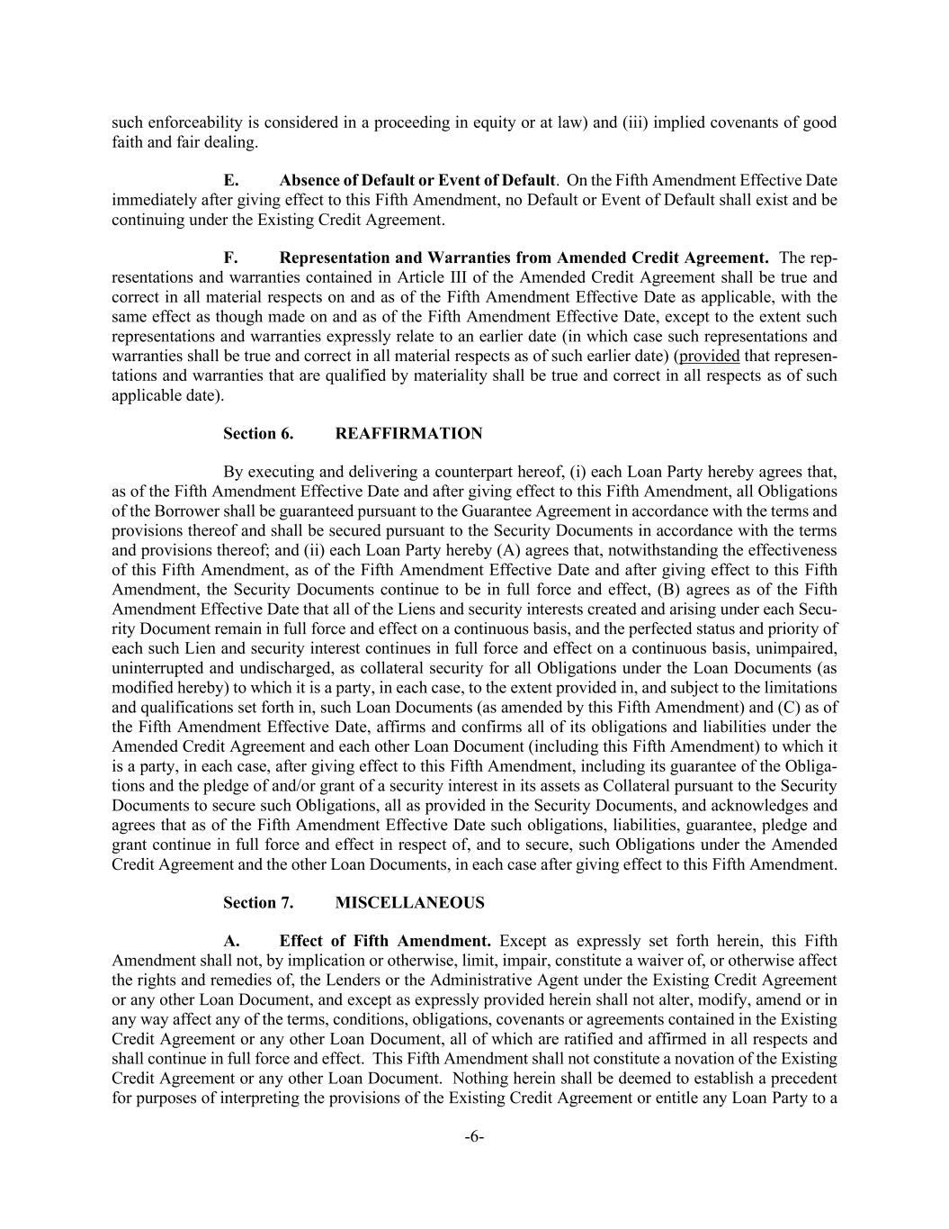 -6- such enforceability is considered in a proceeding in equity or at law) and (iii) implied covenants of good faith and fair dealing. E. Absence of Default or Event of Default. On the Fifth Amendment Effective Date immediately after giving effect to this Fifth Amendment, no Default or Event of Default shall exist and be continuing under the Existing Credit Agreement. F. Representation and Warranties from Amended Credit Agreement. The rep- resentations and warranties contained in Article III of the Amended Credit Agreement shall be true and correct in all material respects on and as of the Fifth Amendment Effective Date as applicable, with the same effect as though made on and as of the Fifth Amendment Effective Date, except to the extent such representations and warranties expressly relate to an earlier date (in which case such representations and warranties shall be true and correct in all material respects as of such earlier date) (provided that represen- tations and warranties that are qualified by materiality shall be true and correct in all respects as of such applicable date). Section 6. REAFFIRMATION By executing and delivering a counterpart hereof, (i) each Loan Party hereby agrees that, as of the Fifth Amendment Effective Date and after giving effect to this Fifth Amendment, all Obligations of the Borrower shall be guaranteed pursuant to the Guarantee Agreement in accordance with the terms and provisions thereof and shall be secured pursuant to the Security Documents in accordance with the terms and provisions thereof; and (ii) each Loan Party hereby (A) agrees that, notwithstanding the effectiveness of this Fifth Amendment, as of the Fifth Amendment Effective Date and after giving effect to this Fifth Amendment, the Security Documents continue to be in full force and effect, (B) agrees as of the Fifth Amendment Effective Date that all of the Liens and security interests created and arising under each Secu- rity Document remain in full force and effect on a continuous basis, and the perfected status and priority of each such Lien and security interest continues in full force and effect on a continuous basis, unimpaired, uninterrupted and undischarged, as collateral security for all Obligations under the Loan Documents (as modified hereby) to which it is a party, in each case, to the extent provided in, and subject to the limitations and qualifications set forth in, such Loan Documents (as amended by this Fifth Amendment) and (C) as of the Fifth Amendment Effective Date, affirms and confirms all of its obligations and liabilities under the Amended Credit Agreement and each other Loan Document (including this Fifth Amendment) to which it is a party, in each case, after giving effect to this Fifth Amendment, including its guarantee of the Obliga- tions and the pledge of and/or grant of a security interest in its assets as Collateral pursuant to the Security Documents to secure such Obligations, all as provided in the Security Documents, and acknowledges and agrees that as of the Fifth Amendment Effective Date such obligations, liabilities, guarantee, pledge and grant continue in full force and effect in respect of, and to secure, such Obligations under the Amended Credit Agreement and the other Loan Documents, in each case after giving effect to this Fifth Amendment. Section 7. MISCELLANEOUS A. Effect of Fifth Amendment. Except as expressly set forth herein, this Fifth Amendment shall not, by implication or otherwise, limit, impair, constitute a waiver of, or otherwise affect the rights and remedies of, the Lenders or the Administrative Agent under the Existing Credit Agreement or any other Loan Document, and except as expressly provided herein shall not alter, modify, amend or in any way affect any of the terms, conditions, obligations, covenants or agreements contained in the Existing Credit Agreement or any other Loan Document, all of which are ratified and affirmed in all respects and shall continue in full force and effect. This Fifth Amendment shall not constitute a novation of the Existing Credit Agreement or any other Loan Document. Nothing herein shall be deemed to establish a precedent for purposes of interpreting the provisions of the Existing Credit Agreement or entitle any Loan Party to a
