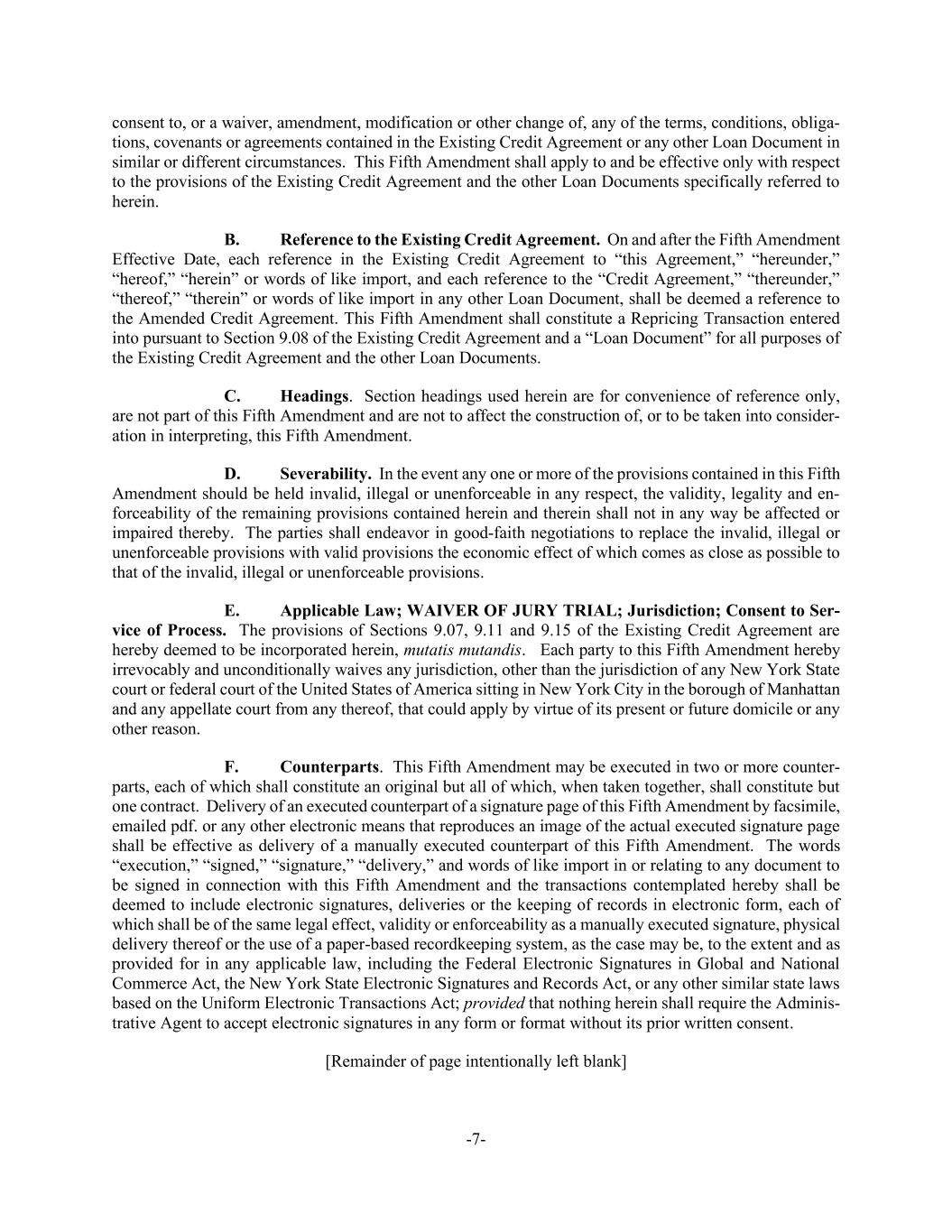 -7- consent to, or a waiver, amendment, modification or other change of, any of the terms, conditions, obliga- tions, covenants or agreements contained in the Existing Credit Agreement or any other Loan Document in similar or different circumstances. This Fifth Amendment shall apply to and be effective only with respect to the provisions of the Existing Credit Agreement and the other Loan Documents specifically referred to herein. B. Reference to the Existing Credit Agreement. On and after the Fifth Amendment Effective Date, each reference in the Existing Credit Agreement to “this Agreement,” “hereunder,” “hereof,” “herein” or words of like import, and each reference to the “Credit Agreement,” “thereunder,” “thereof,” “therein” or words of like import in any other Loan Document, shall be deemed a reference to the Amended Credit Agreement. This Fifth Amendment shall constitute a Repricing Transaction entered into pursuant to Section 9.08 of the Existing Credit Agreement and a “Loan Document” for all purposes of the Existing Credit Agreement and the other Loan Documents. C. Headings. Section headings used herein are for convenience of reference only, are not part of this Fifth Amendment and are not to affect the construction of, or to be taken into consider- ation in interpreting, this Fifth Amendment. D. Severability. In the event any one or more of the provisions contained in this Fifth Amendment should be held invalid, illegal or unenforceable in any respect, the validity, legality and en- forceability of the remaining provisions contained herein and therein shall not in any way be affected or impaired thereby. The parties shall endeavor in good-faith negotiations to replace the invalid, illegal or unenforceable provisions with valid provisions the economic effect of which comes as close as possible to that of the invalid, illegal or unenforceable provisions. E. Applicable Law; WAIVER OF JURY TRIAL; Jurisdiction; Consent to Ser- vice of Process. The provisions of Sections 9.07, 9.11 and 9.15 of the Existing Credit Agreement are hereby deemed to be incorporated herein, mutatis mutandis. Each party to this Fifth Amendment hereby irrevocably and unconditionally waives any jurisdiction, other than the jurisdiction of any New York State court or federal court of the United States of America sitting in New York City in the borough of Manhattan and any appellate court from any thereof, that could apply by virtue of its present or future domicile or any other reason. F. Counterparts. This Fifth Amendment may be executed in two or more counter- parts, each of which shall constitute an original but all of which, when taken together, shall constitute but one contract. Delivery of an executed counterpart of a signature page of this Fifth Amendment by facsimile, emailed pdf. or any other electronic means that reproduces an image of the actual executed signature page shall be effective as delivery of a manually executed counterpart of this Fifth Amendment. The words “execution,” “signed,” “signature,” “delivery,” and words of like import in or relating to any document to be signed in connection with this Fifth Amendment and the transactions contemplated hereby shall be deemed to include electronic signatures, deliveries or the keeping of records in electronic form, each of which shall be of the same legal effect, validity or enforceability as a manually executed signature, physical delivery thereof or the use of a paper-based recordkeeping system, as the case may be, to the extent and as provided for in any applicable law, including the Federal Electronic Signatures in Global and National Commerce Act, the New York State Electronic Signatures and Records Act, or any other similar state laws based on the Uniform Electronic Transactions Act; provided that nothing herein shall require the Adminis- trative Agent to accept electronic signatures in any form or format without its prior written consent. [Remainder of page intentionally left blank]