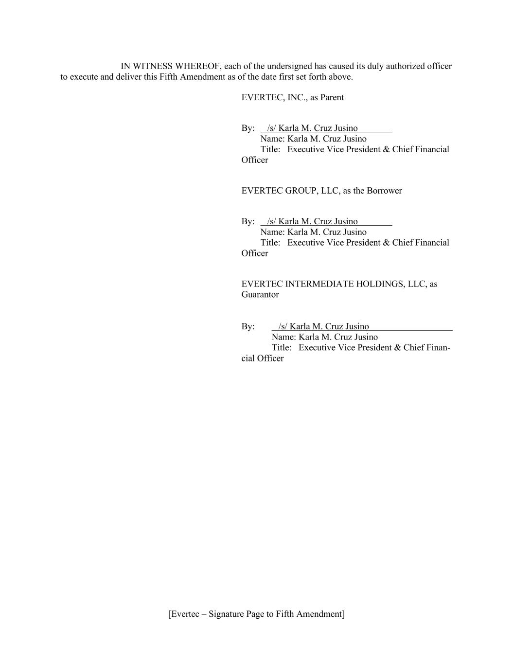 [Evertec – Signature Page to Fifth Amendment] IN WITNESS WHEREOF, each of the undersigned has caused its duly authorized officer to execute and deliver this Fifth Amendment as of the date first set forth above. EVERTEC, INC., as Parent By: /s/ Karla M. Cruz Jusino Name: Karla M. Cruz Jusino Title: Executive Vice President & Chief Financial Officer EVERTEC GROUP, LLC, as the Borrower By: /s/ Karla M. Cruz Jusino Name: Karla M. Cruz Jusino Title: Executive Vice President & Chief Financial Officer EVERTEC INTERMEDIATE HOLDINGS, LLC, as Guarantor By: /s/ Karla M. Cruz Jusino Name: Karla M. Cruz Jusino Title: Executive Vice President & Chief Finan- cial Officer