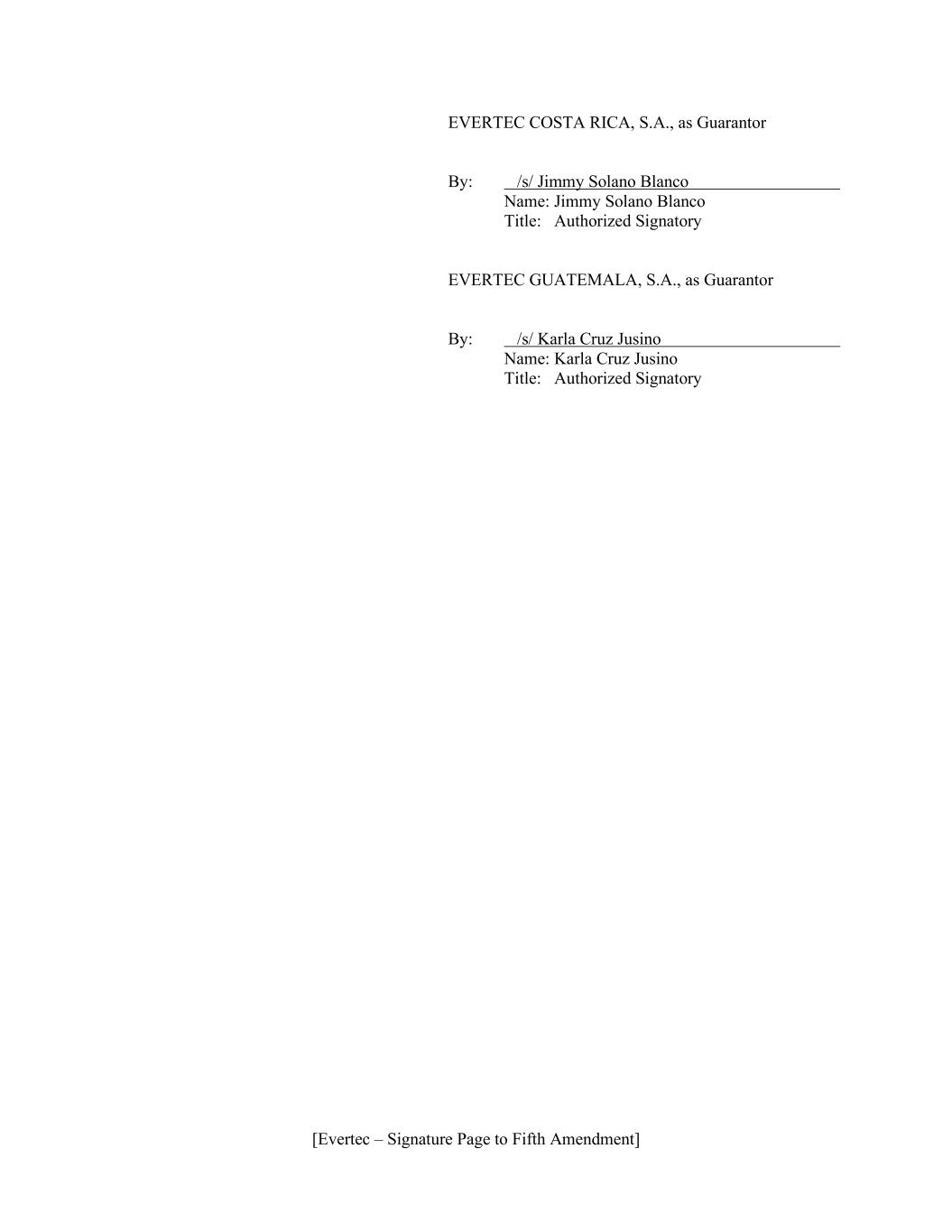 [Evertec – Signature Page to Fifth Amendment] EVERTEC COSTA RICA, S.A., as Guarantor By: /s/ Jimmy Solano Blanco Name: Jimmy Solano Blanco Title: Authorized Signatory EVERTEC GUATEMALA, S.A., as Guarantor By: /s/ Karla Cruz Jusino Name: Karla Cruz Jusino Title: Authorized Signatory