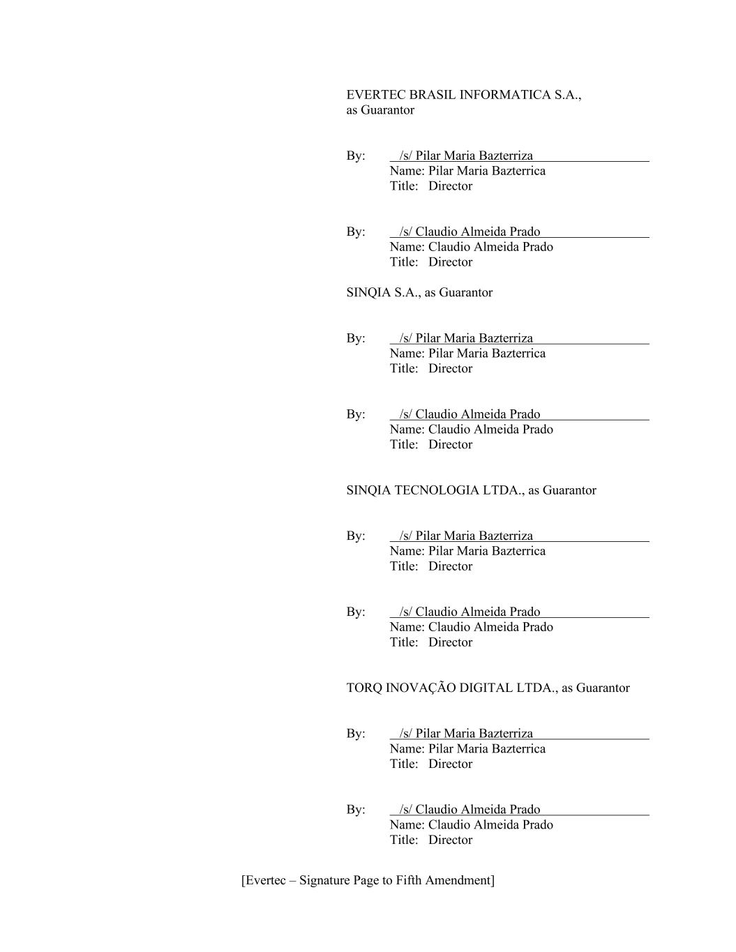 [Evertec – Signature Page to Fifth Amendment] EVERTEC BRASIL INFORMATICA S.A., as Guarantor By: /s/ Pilar Maria Bazterriza Name: Pilar Maria Bazterrica Title: Director By: /s/ Claudio Almeida Prado Name: Claudio Almeida Prado Title: Director SINQIA S.A., as Guarantor By: /s/ Pilar Maria Bazterriza Name: Pilar Maria Bazterrica Title: Director By: /s/ Claudio Almeida Prado Name: Claudio Almeida Prado Title: Director SINQIA TECNOLOGIA LTDA., as Guarantor By: /s/ Pilar Maria Bazterriza Name: Pilar Maria Bazterrica Title: Director By: /s/ Claudio Almeida Prado Name: Claudio Almeida Prado Title: Director TORQ INOVAÇÃO DIGITAL LTDA., as Guarantor By: /s/ Pilar Maria Bazterriza Name: Pilar Maria Bazterrica Title: Director By: /s/ Claudio Almeida Prado Name: Claudio Almeida Prado Title: Director
