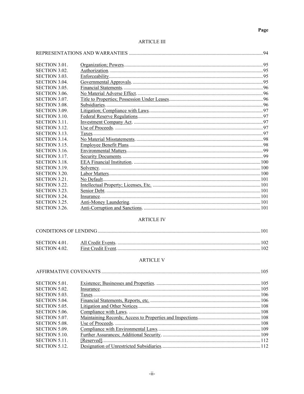 Page -ii- ARTICLE III REPRESENTATIONS AND WARRANTIES ........................................................................................................... 94 SECTION 3.01. Organization; Powers. .............................................................................................................. 95 SECTION 3.02. Authorization. .......................................................................................................................... 95 SECTION 3.03. Enforceability........................................................................................................................... 95 SECTION 3.04. Governmental Approvals. ........................................................................................................ 95 SECTION 3.05. Financial Statements. ............................................................................................................... 96 SECTION 3.06. No Material Adverse Effect. .................................................................................................... 96 SECTION 3.07. Title to Properties; Possession Under Leases. .......................................................................... 96 SECTION 3.08. Subsidiaries. ............................................................................................................................. 96 SECTION 3.09. Litigation; Compliance with Laws. .......................................................................................... 97 SECTION 3.10. Federal Reserve Regulations. ................................................................................................... 97 SECTION 3.11. Investment Company Act. ....................................................................................................... 97 SECTION 3.12. Use of Proceeds. ...................................................................................................................... 97 SECTION 3.13. Taxes. ....................................................................................................................................... 97 SECTION 3.14. No Material Misstatements. ..................................................................................................... 98 SECTION 3.15. Employee Benefit Plans. .......................................................................................................... 98 SECTION 3.16. Environmental Matters............................................................................................................. 99 SECTION 3.17. Security Documents. ................................................................................................................ 99 SECTION 3.18. EEA Financial Institution. ..................................................................................................... 100 SECTION 3.19. Solvency. ............................................................................................................................... 100 SECTION 3.20. Labor Matters. ........................................................................................................................ 100 SECTION 3.21. No Default.............................................................................................................................. 101 SECTION 3.22. Intellectual Property; Licenses, Etc. ...................................................................................... 101 SECTION 3.23. Senior Debt. ........................................................................................................................... 101 SECTION 3.24. Insurance. ............................................................................................................................... 101 SECTION 3.25. Anti-Money Laundering. ....................................................................................................... 101 SECTION 3.26. Anti-Corruption and Sanctions. ............................................................................................. 101 ARTICLE IV CONDITIONS OF LENDING .................................................................................................................................. 101 SECTION 4.01. All Credit Events. .................................................................................................................. 102 SECTION 4.02. First Credit Event. .................................................................................................................. 102 ARTICLE V AFFIRMATIVE COVENANTS ............................................................................................................................... 105 SECTION 5.01. Existence; Businesses and Properties. ................................................................................... 105 SECTION 5.02. Insurance. ............................................................................................................................... 105 SECTION 5.03. Taxes. ..................................................................................................................................... 106 SECTION 5.04. Financial Statements, Reports, etc. ........................................................................................ 106 SECTION 5.05. Litigation and Other Notices. ................................................................................................. 108 SECTION 5.06. Compliance with Laws. ......................................................................................................... 108 SECTION 5.07. Maintaining Records; Access to Properties and Inspections. ................................................. 108 SECTION 5.08. Use of Proceeds. .................................................................................................................... 108 SECTION 5.09. Compliance with Environmental Laws. ................................................................................. 109 SE