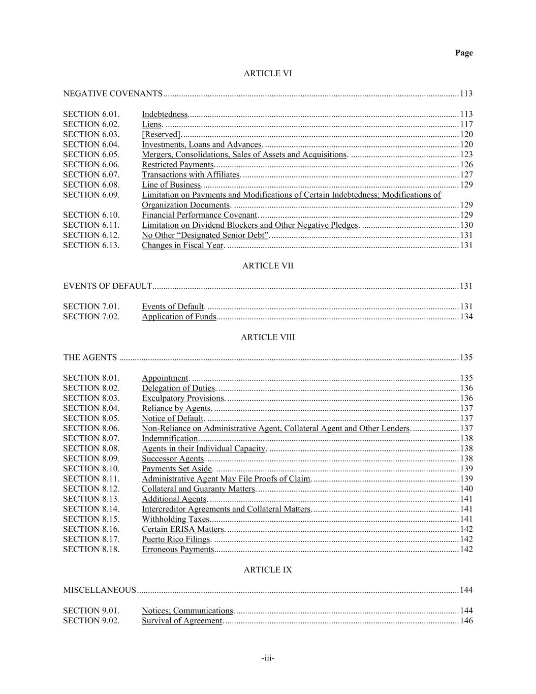 Page -iii- ARTICLE VI NEGATIVE COVENANTS ...................................................................................................................................... 113 SECTION 6.01. Indebtedness........................................................................................................................... 113 SECTION 6.02. Liens. ..................................................................................................................................... 117 SECTION 6.03. [Reserved]. ............................................................................................................................. 120 SECTION 6.04. Investments, Loans and Advances. ........................................................................................ 120 SECTION 6.05. Mergers, Consolidations, Sales of Assets and Acquisitions. ................................................. 123 SECTION 6.06. Restricted Payments. .............................................................................................................. 126 SECTION 6.07. Transactions with Affiliates. .................................................................................................. 127 SECTION 6.08. Line of Business. .................................................................................................................... 129 SECTION 6.09. Limitation on Payments and Modifications of Certain Indebtedness; Modifications of Organization Documents. ...................................................................................................... 129 SECTION 6.10. Financial Performance Covenant. .......................................................................................... 129 SECTION 6.11. Limitation on Dividend Blockers and Other Negative Pledges. ............................................ 130 SECTION 6.12. No Other “Designated Senior Debt”. ..................................................................................... 131 SECTION 6.13. Changes in Fiscal Year. ......................................................................................................... 131 ARTICLE VII EVENTS OF DEFAULT........................................................................................................................................... 131 SECTION 7.01. Events of Default. .................................................................................................................. 131 SECTION 7.02. Application of Funds.............................................................................................................. 134 ARTICLE VIII THE AGENTS .......................................................................................................................................................... 135 SECTION 8.01. Appointment. ......................................................................................................................... 135 SECTION 8.02. Delegation of Duties. ............................................................................................................. 136 SECTION 8.03. Exculpatory Provisions. ......................................................................................................... 136 SECTION 8.04. Reliance by Agents. ............................................................................................................... 137 SECTION 8.05. Notice of Default. .................................................................................................................. 137 SECTION 8.06. Non-Reliance on Administrative Agent, Collateral Agent and Other Lenders. ..................... 137 SECTION 8.07. Indemnification. ..................................................................................................................... 138 SECTION 8.08. Agents in their Individual Capacity. ...................................................................................... 138 SECTION 8.09. Successor Agents. .................................................................................................................. 138 SECTION 8.10. Payments Set Aside. .............................................................................................................. 139 SECTION 8.11. Administrative Agent May File Proofs of Claim. .................................................................. 139 SECTION 8.12. Collateral and Guaranty Matters. ........................................................................................... 140 SECTION 8.13. Additional Agents. ................................................................................................................. 141 SECTION 8.14. Intercreditor Agreements and Collateral Matters. .................................................................. 141 SECTION 8.15. Withholding Taxes. ................................................................................................................ 141 SECTION 8.16. Certain ERISA Matters. ......................................................................................................... 142 SECTION 8.17. Puerto Rico Filings. ............................................................................................................... 142 SECTION 8.18. Erroneous Payments............................................................................................................... 142 ARTICLE IX MISCELLANEOUS .................................................................................................................................................. 144 SECTION 9.01. Notices; Communications. ..................................................................................................... 144 SECTION 9.02. Survival of Agreement. .......................................................................................................... 146