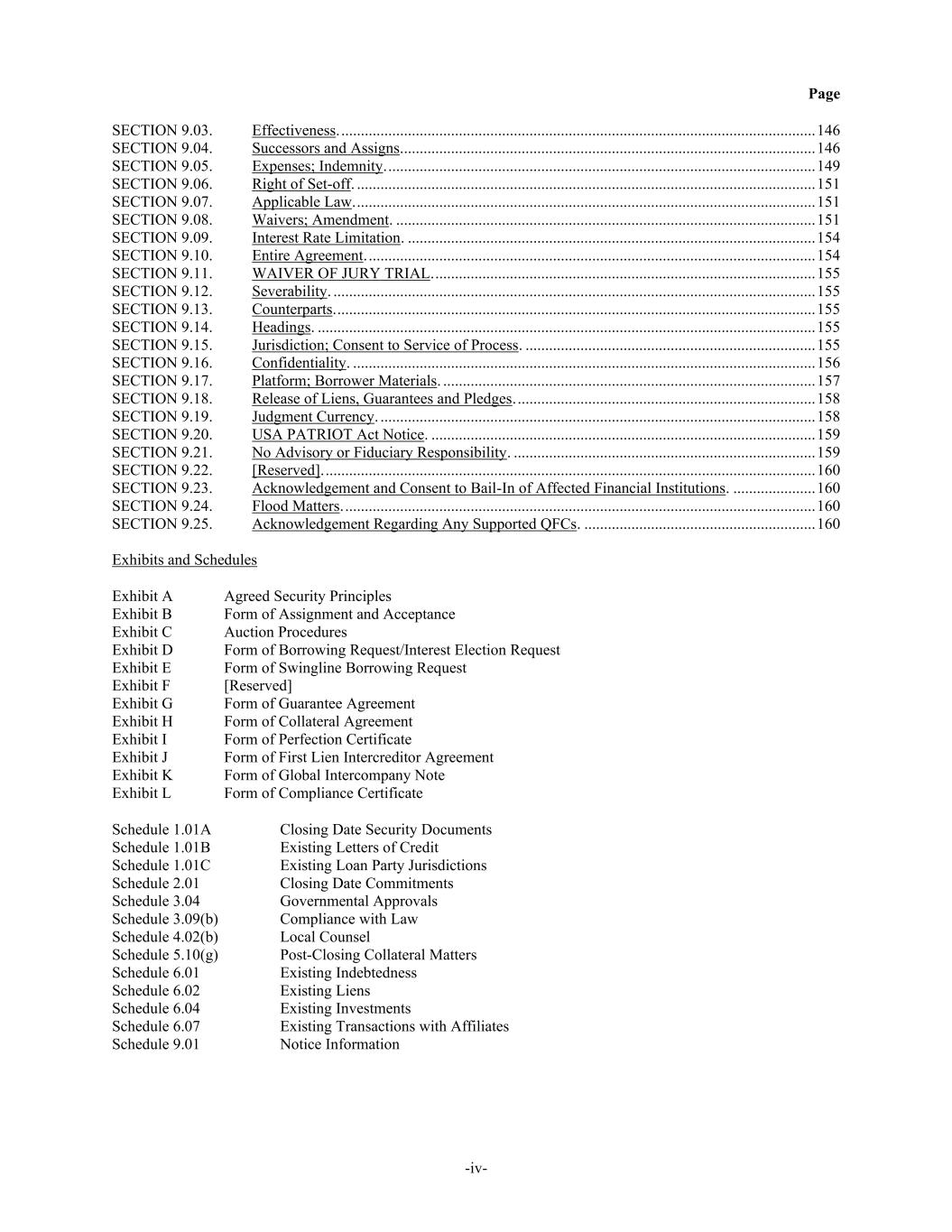 Page -iv- SECTION 9.03. Effectiveness. ......................................................................................................................... 146 SECTION 9.04. Successors and Assigns.......................................................................................................... 146 SECTION 9.05. Expenses; Indemnity. ............................................................................................................. 149 SECTION 9.06. Right of Set-off. ..................................................................................................................... 151 SECTION 9.07. Applicable Law. ..................................................................................................................... 151 SECTION 9.08. Waivers; Amendment. ........................................................................................................... 151 SECTION 9.09. Interest Rate Limitation. ........................................................................................................ 154 SECTION 9.10. Entire Agreement. .................................................................................................................. 154 SECTION 9.11. WAIVER OF JURY TRIAL. ................................................................................................. 155 SECTION 9.12. Severability. ........................................................................................................................... 155 SECTION 9.13. Counterparts. .......................................................................................................................... 155 SECTION 9.14. Headings. ............................................................................................................................... 155 SECTION 9.15. Jurisdiction; Consent to Service of Process. .......................................................................... 155 SECTION 9.16. Confidentiality. ...................................................................................................................... 156 SECTION 9.17. Platform; Borrower Materials. ............................................................................................... 157 SECTION 9.18. Release of Liens, Guarantees and Pledges. ............................................................................ 158 SECTION 9.19. Judgment Currency. ............................................................................................................... 158 SECTION 9.20. USA PATRIOT Act Notice. .................................................................................................. 159 SECTION 9.21. No Advisory or Fiduciary Responsibility. ............................................................................. 159 SECTION 9.22. [Reserved]. ............................................................................................................................. 160 SECTION 9.23. Acknowledgement and Consent to Bail-In of Affected Financial Institutions. ..................... 160 SECTION 9.24. Flood Matters. ........................................................................................................................ 160 SECTION 9.25. Acknowledgement Regarding Any Supported QFCs. ........................................................... 160 Exhibits and Schedules Exhibit A Agreed Security Principles Exhibit B Form of Assignment and Acceptance Exhibit C Auction Procedures Exhibit D Form of Borrowing Request/Interest Election Request Exhibit E Form of Swingline Borrowing Request Exhibit F [Reserved] Exhibit G Form of Guarantee Agreement Exhibit H Form of Collateral Agreement Exhibit I Form of Perfection Certificate Exhibit J Form of First Lien Intercreditor Agreement Exhibit K Form of Global Intercompany Note Exhibit L Form of Compliance Certificate Schedule 1.01A Closing Date Security Documents Schedule 1.01B Existing Letters of Credit Schedule 1.01C Existing Loan Party Jurisdictions Schedule 2.01 Closing Date Commitments Schedule 3.04 Governmental Approvals Schedule 3.09(b) Compliance with Law Schedule 4.02(b) Local Counsel Schedule 5.10(g) Post-Closing Collateral Matters Schedule 6.01 Existing Indebtedness Schedule 6.02 Existing Liens Schedule 6.04 Existing Investments Schedule 6.07 Existing Transactions with Affiliates Schedule 9.01 Notice Information