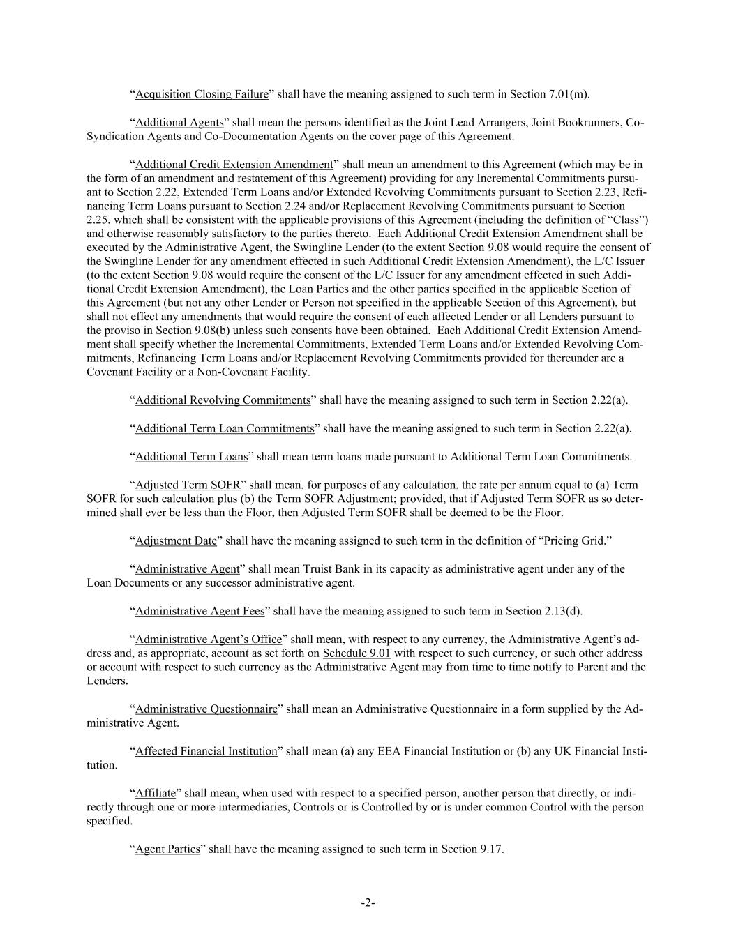 -2- “Acquisition Closing Failure” shall have the meaning assigned to such term in Section 7.01(m). “Additional Agents” shall mean the persons identified as the Joint Lead Arrangers, Joint Bookrunners, Co- Syndication Agents and Co-Documentation Agents on the cover page of this Agreement. “Additional Credit Extension Amendment” shall mean an amendment to this Agreement (which may be in the form of an amendment and restatement of this Agreement) providing for any Incremental Commitments pursu- ant to Section 2.22, Extended Term Loans and/or Extended Revolving Commitments pursuant to Section 2.23, Refi- nancing Term Loans pursuant to Section 2.24 and/or Replacement Revolving Commitments pursuant to Section 2.25, which shall be consistent with the applicable provisions of this Agreement (including the definition of “Class”) and otherwise reasonably satisfactory to the parties thereto. Each Additional Credit Extension Amendment shall be executed by the Administrative Agent, the Swingline Lender (to the extent Section 9.08 would require the consent of the Swingline Lender for any amendment effected in such Additional Credit Extension Amendment), the L/C Issuer (to the extent Section 9.08 would require the consent of the L/C Issuer for any amendment effected in such Addi- tional Credit Extension Amendment), the Loan Parties and the other parties specified in the applicable Section of this Agreement (but not any other Lender or Person not specified in the applicable Section of this Agreement), but shall not effect any amendments that would require the consent of each affected Lender or all Lenders pursuant to the proviso in Section 9.08(b) unless such consents have been obtained. Each Additional Credit Extension Amend- ment shall specify whether the Incremental Commitments, Extended Term Loans and/or Extended Revolving Com- mitments, Refinancing Term Loans and/or Replacement Revolving Commitments provided for thereunder are a Covenant Facility or a Non-Covenant Facility. “Additional Revolving Commitments” shall have the meaning assigned to such term in Section 2.22(a). “Additional Term Loan Commitments” shall have the meaning assigned to such term in Section 2.22(a). “Additional Term Loans” shall mean term loans made pursuant to Additional Term Loan Commitments. “Adjusted Term SOFR” shall mean, for purposes of any calculation, the rate per annum equal to (a) Term SOFR for such calculation plus (b) the Term SOFR Adjustment; provided, that if Adjusted Term SOFR as so deter- mined shall ever be less than the Floor, then Adjusted Term SOFR shall be deemed to be the Floor. “Adjustment Date” shall have the meaning assigned to such term in the definition of “Pricing Grid.” “Administrative Agent” shall mean Truist Bank in its capacity as administrative agent under any of the Loan Documents or any successor administrative agent. “Administrative Agent Fees” shall have the meaning assigned to such term in Section 2.13(d). “Administrative Agent’s Office” shall mean, with respect to any currency, the Administrative Agent’s ad- dress and, as appropriate, account as set forth on Schedule 9.01 with respect to such currency, or such other address or account with respect to such currency as the Administrative Agent may from time to time notify to Parent and the Lenders. “Administrative Questionnaire” shall mean an Administrative Questionnaire in a form supplied by the Ad- ministrative Agent. “Affected Financial Institution” shall mean (a) any EEA Financial Institution or (b) any UK Financial Insti- tution. “Affiliate” shall mean, when used with respect to a specified person, another person that directly, or indi- rectly through one or more intermediaries, Controls or is Controlled by or is under common Control with the person specified. “Agent Parties” shall have the meaning assigned to such term in Section 9.17.