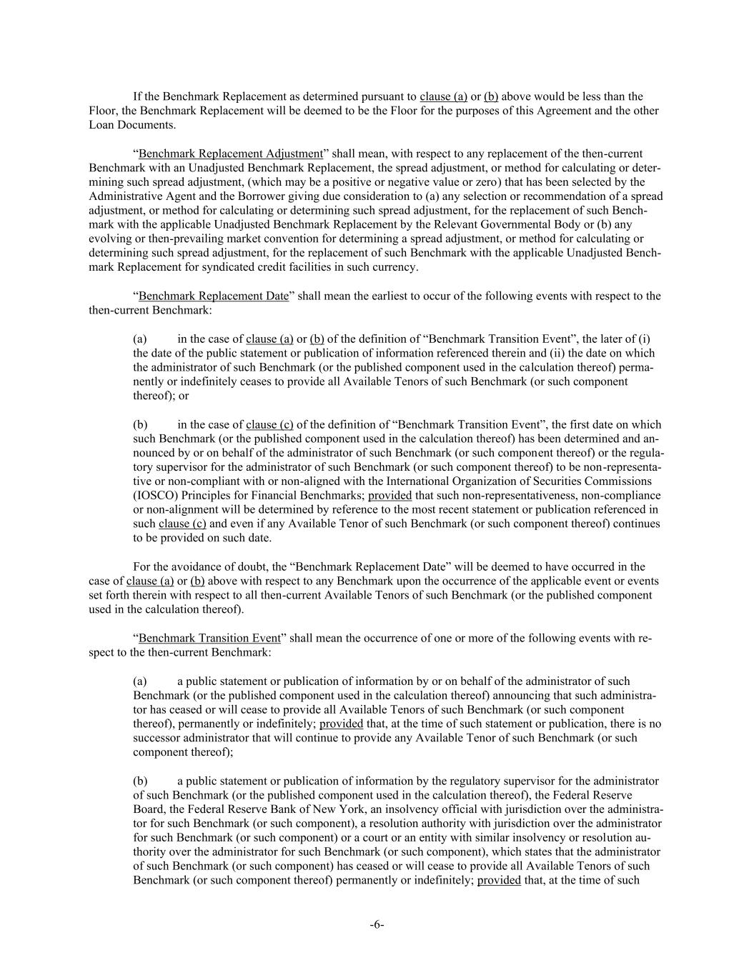 -6- If the Benchmark Replacement as determined pursuant to clause (a) or (b) above would be less than the Floor, the Benchmark Replacement will be deemed to be the Floor for the purposes of this Agreement and the other Loan Documents. “Benchmark Replacement Adjustment” shall mean, with respect to any replacement of the then-current Benchmark with an Unadjusted Benchmark Replacement, the spread adjustment, or method for calculating or deter- mining such spread adjustment, (which may be a positive or negative value or zero) that has been selected by the Administrative Agent and the Borrower giving due consideration to (a) any selection or recommendation of a spread adjustment, or method for calculating or determining such spread adjustment, for the replacement of such Bench- mark with the applicable Unadjusted Benchmark Replacement by the Relevant Governmental Body or (b) any evolving or then-prevailing market convention for determining a spread adjustment, or method for calculating or determining such spread adjustment, for the replacement of such Benchmark with the applicable Unadjusted Bench- mark Replacement for syndicated credit facilities in such currency. “Benchmark Replacement Date” shall mean the earliest to occur of the following events with respect to the then-current Benchmark: (a) in the case of clause (a) or (b) of the definition of “Benchmark Transition Event”, the later of (i) the date of the public statement or publication of information referenced therein and (ii) the date on which the administrator of such Benchmark (or the published component used in the calculation thereof) perma- nently or indefinitely ceases to provide all Available Tenors of such Benchmark (or such component thereof); or (b) in the case of clause (c) of the definition of “Benchmark Transition Event”, the first date on which such Benchmark (or the published component used in the calculation thereof) has been determined and an- nounced by or on behalf of the administrator of such Benchmark (or such component thereof) or the regula- tory supervisor for the administrator of such Benchmark (or such component thereof) to be non-representa- tive or non-compliant with or non-aligned with the International Organization of Securities Commissions (IOSCO) Principles for Financial Benchmarks; provided that such non-representativeness, non-compliance or non-alignment will be determined by reference to the most recent statement or publication referenced in such clause (c) and even if any Available Tenor of such Benchmark (or such component thereof) continues to be provided on such date. For the avoidance of doubt, the “Benchmark Replacement Date” will be deemed to have occurred in the case of clause (a) or (b) above with respect to any Benchmark upon the occurrence of the applicable event or events set forth therein with respect to all then-current Available Tenors of such Benchmark (or the published component used in the calculation thereof). “Benchmark Transition Event” shall mean the occurrence of one or more of the following events with re- spect to the then-current Benchmark: (a) a public statement or publication of information by or on behalf of the administrator of such Benchmark (or the published component used in the calculation thereof) announcing that such administra- tor has ceased or will cease to provide all Available Tenors of such Benchmark (or such component thereof), permanently or indefinitely; provided that, at the time of such statement or publication, there is no successor administrator that will continue to provide any Available Tenor of such Benchmark (or such component thereof); (b) a public statement or publication of information by the regulatory supervisor for the administrator of such Benchmark (or the published component used in the calculation thereof), the Federal Reserve Board, the Federal Reserve Bank of New York, an insolvency official with jurisdiction over the administra- tor for such Benchmark (or such component), a resolution authority with jurisdiction over the administrator for such Benchmark (or such component) or a court or an entity with similar insolvency or resolution au- thority over the administrator for such Benchmark (or such component), which states that the administrator of such Benchmark (or such component) has ceased or will cease to provide all Available Tenors of such Benchmark (or such component thereof) permanently or indefinitely; provided that, at the time of such
