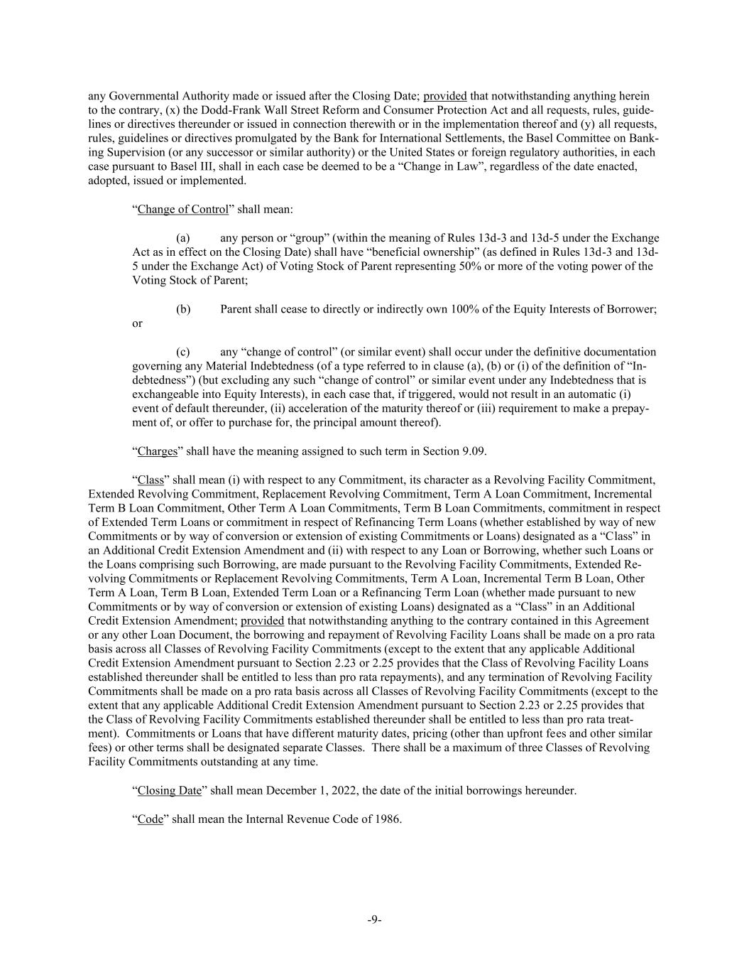 -9- any Governmental Authority made or issued after the Closing Date; provided that notwithstanding anything herein to the contrary, (x) the Dodd-Frank Wall Street Reform and Consumer Protection Act and all requests, rules, guide- lines or directives thereunder or issued in connection therewith or in the implementation thereof and (y) all requests, rules, guidelines or directives promulgated by the Bank for International Settlements, the Basel Committee on Bank- ing Supervision (or any successor or similar authority) or the United States or foreign regulatory authorities, in each case pursuant to Basel III, shall in each case be deemed to be a “Change in Law”, regardless of the date enacted, adopted, issued or implemented. “Change of Control” shall mean: (a) any person or “group” (within the meaning of Rules 13d-3 and 13d-5 under the Exchange Act as in effect on the Closing Date) shall have “beneficial ownership” (as defined in Rules 13d-3 and 13d- 5 under the Exchange Act) of Voting Stock of Parent representing 50% or more of the voting power of the Voting Stock of Parent; (b) Parent shall cease to directly or indirectly own 100% of the Equity Interests of Borrower; or (c) any “change of control” (or similar event) shall occur under the definitive documentation governing any Material Indebtedness (of a type referred to in clause (a), (b) or (i) of the definition of “In- debtedness”) (but excluding any such “change of control” or similar event under any Indebtedness that is exchangeable into Equity Interests), in each case that, if triggered, would not result in an automatic (i) event of default thereunder, (ii) acceleration of the maturity thereof or (iii) requirement to make a prepay- ment of, or offer to purchase for, the principal amount thereof). “Charges” shall have the meaning assigned to such term in Section 9.09. “Class” shall mean (i) with respect to any Commitment, its character as a Revolving Facility Commitment, Extended Revolving Commitment, Replacement Revolving Commitment, Term A Loan Commitment, Incremental Term B Loan Commitment, Other Term A Loan Commitments, Term B Loan Commitments, commitment in respect of Extended Term Loans or commitment in respect of Refinancing Term Loans (whether established by way of new Commitments or by way of conversion or extension of existing Commitments or Loans) designated as a “Class” in an Additional Credit Extension Amendment and (ii) with respect to any Loan or Borrowing, whether such Loans or the Loans comprising such Borrowing, are made pursuant to the Revolving Facility Commitments, Extended Re- volving Commitments or Replacement Revolving Commitments, Term A Loan, Incremental Term B Loan, Other Term A Loan, Term B Loan, Extended Term Loan or a Refinancing Term Loan (whether made pursuant to new Commitments or by way of conversion or extension of existing Loans) designated as a “Class” in an Additional Credit Extension Amendment; provided that notwithstanding anything to the contrary contained in this Agreement or any other Loan Document, the borrowing and repayment of Revolving Facility Loans shall be made on a pro rata basis across all Classes of Revolving Facility Commitments (except to the extent that any applicable Additional Credit Extension Amendment pursuant to Section 2.23 or 2.25 provides that the Class of Revolving Facility Loans established thereunder shall be entitled to less than pro rata repayments), and any termination of Revolving Facility Commitments shall be made on a pro rata basis across all Classes of Revolving Facility Commitments (except to the extent that any applicable Additional Credit Extension Amendment pursuant to Section 2.23 or 2.25 provides that the Class of Revolving Facility Commitments established thereunder shall be entitled to less than pro rata treat- ment). Commitments or Loans that have different maturity dates, pricing (other than upfront fees and other similar fees) or other terms shall be designated separate Classes. There shall be a maximum of three Classes of Revolving Facility Commitments outstanding at any time. “Closing Date” shall mean December 1, 2022, the date of the initial borrowings hereunder. “Code” shall mean the Internal Revenue Code of 1986.