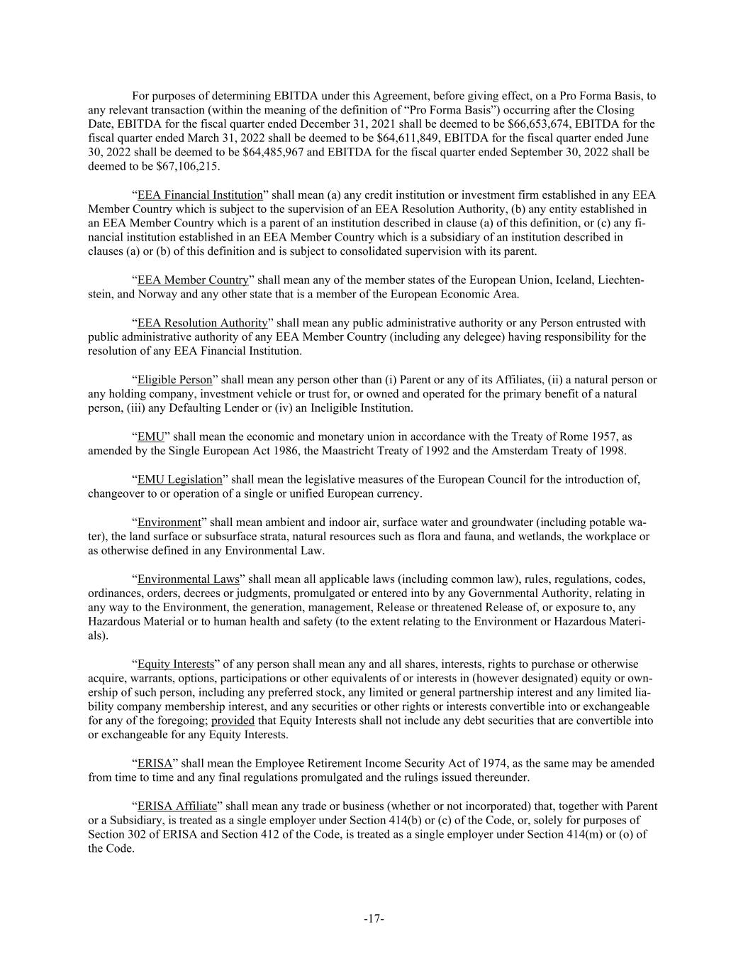 -17- For purposes of determining EBITDA under this Agreement, before giving effect, on a Pro Forma Basis, to any relevant transaction (within the meaning of the definition of “Pro Forma Basis”) occurring after the Closing Date, EBITDA for the fiscal quarter ended December 31, 2021 shall be deemed to be $66,653,674, EBITDA for the fiscal quarter ended March 31, 2022 shall be deemed to be $64,611,849, EBITDA for the fiscal quarter ended June 30, 2022 shall be deemed to be $64,485,967 and EBITDA for the fiscal quarter ended September 30, 2022 shall be deemed to be $67,106,215. “EEA Financial Institution” shall mean (a) any credit institution or investment firm established in any EEA Member Country which is subject to the supervision of an EEA Resolution Authority, (b) any entity established in an EEA Member Country which is a parent of an institution described in clause (a) of this definition, or (c) any fi- nancial institution established in an EEA Member Country which is a subsidiary of an institution described in clauses (a) or (b) of this definition and is subject to consolidated supervision with its parent. “EEA Member Country” shall mean any of the member states of the European Union, Iceland, Liechten- stein, and Norway and any other state that is a member of the European Economic Area. “EEA Resolution Authority” shall mean any public administrative authority or any Person entrusted with public administrative authority of any EEA Member Country (including any delegee) having responsibility for the resolution of any EEA Financial Institution. “Eligible Person” shall mean any person other than (i) Parent or any of its Affiliates, (ii) a natural person or any holding company, investment vehicle or trust for, or owned and operated for the primary benefit of a natural person, (iii) any Defaulting Lender or (iv) an Ineligible Institution. “EMU” shall mean the economic and monetary union in accordance with the Treaty of Rome 1957, as amended by the Single European Act 1986, the Maastricht Treaty of 1992 and the Amsterdam Treaty of 1998. “EMU Legislation” shall mean the legislative measures of the European Council for the introduction of, changeover to or operation of a single or unified European currency. “Environment” shall mean ambient and indoor air, surface water and groundwater (including potable wa- ter), the land surface or subsurface strata, natural resources such as flora and fauna, and wetlands, the workplace or as otherwise defined in any Environmental Law. “Environmental Laws” shall mean all applicable laws (including common law), rules, regulations, codes, ordinances, orders, decrees or judgments, promulgated or entered into by any Governmental Authority, relating in any way to the Environment, the generation, management, Release or threatened Release of, or exposure to, any Hazardous Material or to human health and safety (to the extent relating to the Environment or Hazardous Materi- als). “Equity Interests” of any person shall mean any and all shares, interests, rights to purchase or otherwise acquire, warrants, options, participations or other equivalents of or interests in (however designated) equity or own- ership of such person, including any preferred stock, any limited or general partnership interest and any limited lia- bility company membership interest, and any securities or other rights or interests convertible into or exchangeable for any of the foregoing; provided that Equity Interests shall not include any debt securities that are convertible into or exchangeable for any Equity Interests. “ERISA” shall mean the Employee Retirement Income Security Act of 1974, as the same may be amended from time to time and any final regulations promulgated and the rulings issued thereunder. “ERISA Affiliate” shall mean any trade or business (whether or not incorporated) that, together with Parent or a Subsidiary, is treated as a single employer under Section 414(b) or (c) of the Code, or, solely for purposes of Section 302 of ERISA and Section 412 of the Code, is treated as a single employer under Section 414(m) or (o) of the Code.