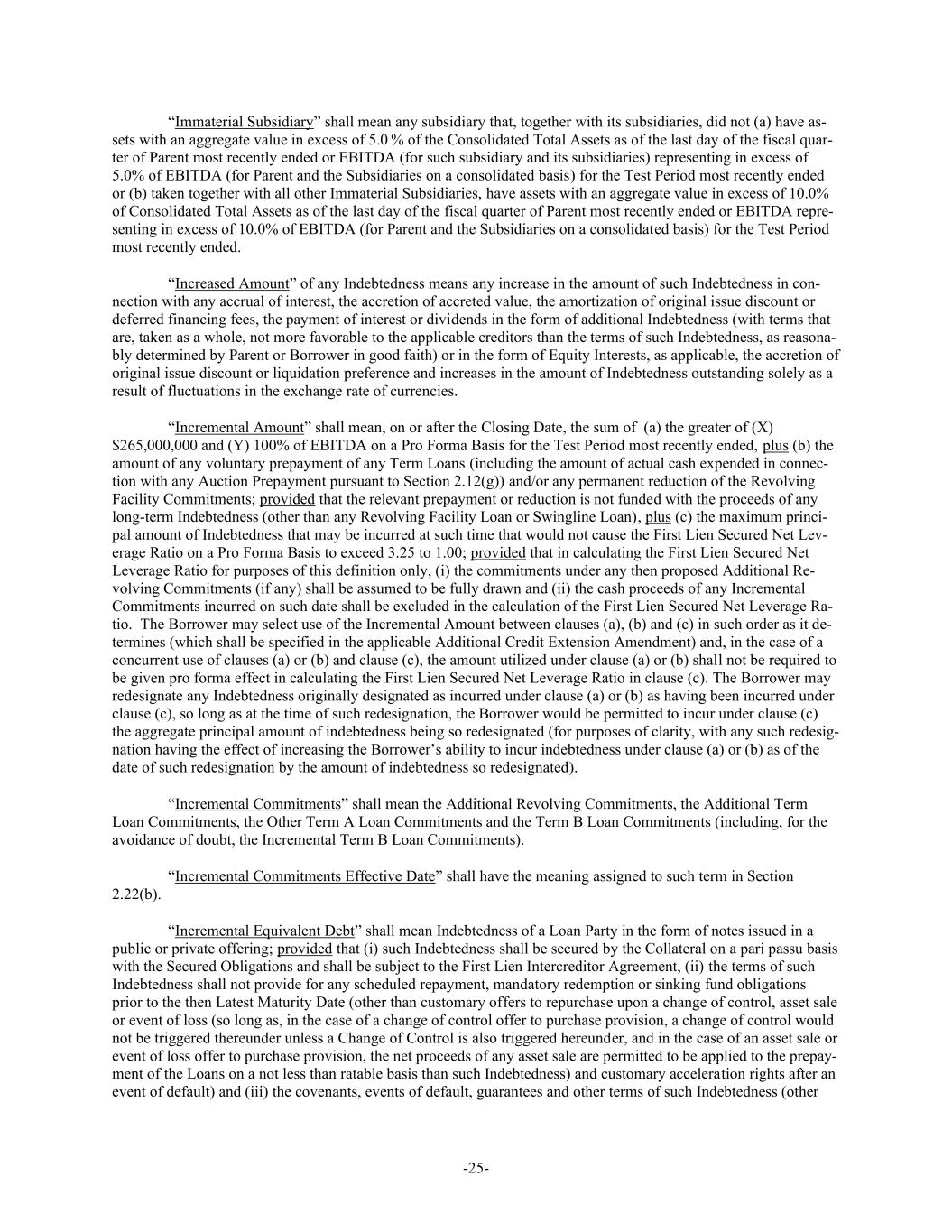 -25- “Immaterial Subsidiary” shall mean any subsidiary that, together with its subsidiaries, did not (a) have as- sets with an aggregate value in excess of 5.0 % of the Consolidated Total Assets as of the last day of the fiscal quar- ter of Parent most recently ended or EBITDA (for such subsidiary and its subsidiaries) representing in excess of 5.0% of EBITDA (for Parent and the Subsidiaries on a consolidated basis) for the Test Period most recently ended or (b) taken together with all other Immaterial Subsidiaries, have assets with an aggregate value in excess of 10.0% of Consolidated Total Assets as of the last day of the fiscal quarter of Parent most recently ended or EBITDA repre- senting in excess of 10.0% of EBITDA (for Parent and the Subsidiaries on a consolidated basis) for the Test Period most recently ended. “Increased Amount” of any Indebtedness means any increase in the amount of such Indebtedness in con- nection with any accrual of interest, the accretion of accreted value, the amortization of original issue discount or deferred financing fees, the payment of interest or dividends in the form of additional Indebtedness (with terms that are, taken as a whole, not more favorable to the applicable creditors than the terms of such Indebtedness, as reasona- bly determined by Parent or Borrower in good faith) or in the form of Equity Interests, as applicable, the accretion of original issue discount or liquidation preference and increases in the amount of Indebtedness outstanding solely as a result of fluctuations in the exchange rate of currencies. “Incremental Amount” shall mean, on or after the Closing Date, the sum of (a) the greater of (X) $265,000,000 and (Y) 100% of EBITDA on a Pro Forma Basis for the Test Period most recently ended, plus (b) the amount of any voluntary prepayment of any Term Loans (including the amount of actual cash expended in connec- tion with any Auction Prepayment pursuant to Section 2.12(g)) and/or any permanent reduction of the Revolving Facility Commitments; provided that the relevant prepayment or reduction is not funded with the proceeds of any long-term Indebtedness (other than any Revolving Facility Loan or Swingline Loan), plus (c) the maximum princi- pal amount of Indebtedness that may be incurred at such time that would not cause the First Lien Secured Net Lev- erage Ratio on a Pro Forma Basis to exceed 3.25 to 1.00; provided that in calculating the First Lien Secured Net Leverage Ratio for purposes of this definition only, (i) the commitments under any then proposed Additional Re- volving Commitments (if any) shall be assumed to be fully drawn and (ii) the cash proceeds of any Incremental Commitments incurred on such date shall be excluded in the calculation of the First Lien Secured Net Leverage Ra- tio. The Borrower may select use of the Incremental Amount between clauses (a), (b) and (c) in such order as it de- termines (which shall be specified in the applicable Additional Credit Extension Amendment) and, in the case of a concurrent use of clauses (a) or (b) and clause (c), the amount utilized under clause (a) or (b) shall not be required to be given pro forma effect in calculating the First Lien Secured Net Leverage Ratio in clause (c). The Borrower may redesignate any Indebtedness originally designated as incurred under clause (a) or (b) as having been incurred under clause (c), so long as at the time of such redesignation, the Borrower would be permitted to incur under clause (c) the aggregate principal amount of indebtedness being so redesignated (for purposes of clarity, with any such redesig- nation having the effect of increasing the Borrower’s ability to incur indebtedness under clause (a) or (b) as of the date of such redesignation by the amount of indebtedness so redesignated). “Incremental Commitments” shall mean the Additional Revolving Commitments, the Additional Term Loan Commitments, the Other Term A Loan Commitments and the Term B Loan Commitments (including, for the avoidance of doubt, the Incremental Term B Loan Commitments). “Incremental Commitments Effective Date” shall have the meaning assigned to such term in Section 2.22(b). “Incremental Equivalent Debt” shall mean Indebtedness of a Loan Party in the form of notes issued in a public or private offering; provided that (i) such Indebtedness shall be secured by the Collateral on a pari passu basis with the Secured Obligations and shall be subject to the First Lien Intercreditor Agreement, (ii) the terms of such Indebtedness shall not provide for any scheduled repayment, mandatory redemption or sinking fund obligations prior to the then Latest Maturity Date (other than customary offers to repurchase upon a change of control, asset sale or event of loss (so long as, in the case of a change of control offer to purchase provision, a change of control would not be triggered thereunder unless a Change of Control is also triggered hereunder, and in the case of an asset sale or event of loss offer to purchase provision, the net proceeds of any asset sale are permitted to be applied to the prepay- ment of the Loans on a not less than ratable basis than such Indebtedness) and customary acceleration rights after an event of default) and (iii) the covenants, events of default, guarantees and other terms of such Indebtedness (other