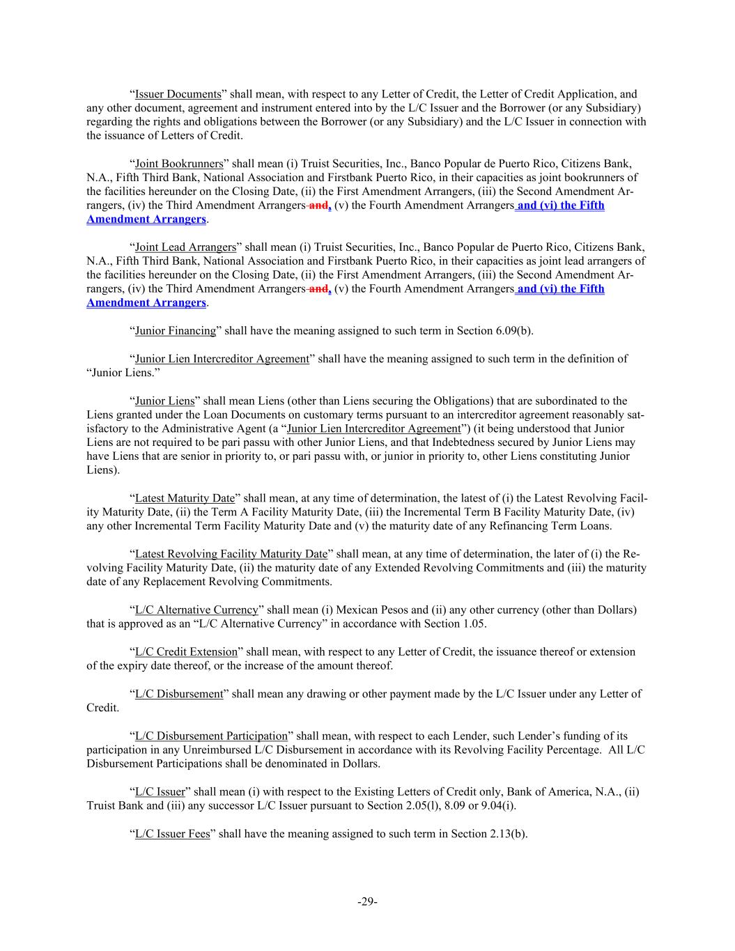 -29- “Issuer Documents” shall mean, with respect to any Letter of Credit, the Letter of Credit Application, and any other document, agreement and instrument entered into by the L/C Issuer and the Borrower (or any Subsidiary) regarding the rights and obligations between the Borrower (or any Subsidiary) and the L/C Issuer in connection with the issuance of Letters of Credit. “Joint Bookrunners” shall mean (i) Truist Securities, Inc., Banco Popular de Puerto Rico, Citizens Bank, N.A., Fifth Third Bank, National Association and Firstbank Puerto Rico, in their capacities as joint bookrunners of the facilities hereunder on the Closing Date, (ii) the First Amendment Arrangers, (iii) the Second Amendment Ar- rangers, (iv) the Third Amendment Arrangers and, (v) the Fourth Amendment Arrangers and (vi) the Fifth Amendment Arrangers. “Joint Lead Arrangers” shall mean (i) Truist Securities, Inc., Banco Popular de Puerto Rico, Citizens Bank, N.A., Fifth Third Bank, National Association and Firstbank Puerto Rico, in their capacities as joint lead arrangers of the facilities hereunder on the Closing Date, (ii) the First Amendment Arrangers, (iii) the Second Amendment Ar- rangers, (iv) the Third Amendment Arrangers and, (v) the Fourth Amendment Arrangers and (vi) the Fifth Amendment Arrangers. “Junior Financing” shall have the meaning assigned to such term in Section 6.09(b). “Junior Lien Intercreditor Agreement” shall have the meaning assigned to such term in the definition of “Junior Liens.” “Junior Liens” shall mean Liens (other than Liens securing the Obligations) that are subordinated to the Liens granted under the Loan Documents on customary terms pursuant to an intercreditor agreement reasonably sat- isfactory to the Administrative Agent (a “Junior Lien Intercreditor Agreement”) (it being understood that Junior Liens are not required to be pari passu with other Junior Liens, and that Indebtedness secured by Junior Liens may have Liens that are senior in priority to, or pari passu with, or junior in priority to, other Liens constituting Junior Liens). “Latest Maturity Date” shall mean, at any time of determination, the latest of (i) the Latest Revolving Facil- ity Maturity Date, (ii) the Term A Facility Maturity Date, (iii) the Incremental Term B Facility Maturity Date, (iv) any other Incremental Term Facility Maturity Date and (v) the maturity date of any Refinancing Term Loans. “Latest Revolving Facility Maturity Date” shall mean, at any time of determination, the later of (i) the Re- volving Facility Maturity Date, (ii) the maturity date of any Extended Revolving Commitments and (iii) the maturity date of any Replacement Revolving Commitments. “L/C Alternative Currency” shall mean (i) Mexican Pesos and (ii) any other currency (other than Dollars) that is approved as an “L/C Alternative Currency” in accordance with Section 1.05. “L/C Credit Extension” shall mean, with respect to any Letter of Credit, the issuance thereof or extension of the expiry date thereof, or the increase of the amount thereof. “L/C Disbursement” shall mean any drawing or other payment made by the L/C Issuer under any Letter of Credit. “L/C Disbursement Participation” shall mean, with respect to each Lender, such Lender’s funding of its participation in any Unreimbursed L/C Disbursement in accordance with its Revolving Facility Percentage. All L/C Disbursement Participations shall be denominated in Dollars. “L/C Issuer” shall mean (i) with respect to the Existing Letters of Credit only, Bank of America, N.A., (ii) Truist Bank and (iii) any successor L/C Issuer pursuant to Section 2.05(l), 8.09 or 9.04(i). “L/C Issuer Fees” shall have the meaning assigned to such term in Section 2.13(b).