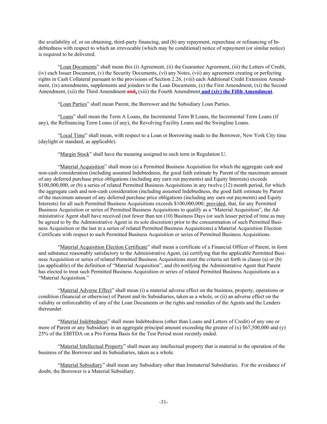 -31- the availability of, or on obtaining, third-party financing, and (b) any repayment, repurchase or refinancing of In- debtedness with respect to which an irrevocable (which may be conditional) notice of repayment (or similar notice) is required to be delivered. “Loan Documents” shall mean this (i) Agreement, (ii) the Guarantee Agreement, (iii) the Letters of Credit, (iv) each Issuer Document, (v) the Security Documents, (vi) any Notes, (vii) any agreement creating or perfecting rights in Cash Collateral pursuant to the provisions of Section 2.26, (viii) each Additional Credit Extension Amend- ment, (ix) amendments, supplements and joinders to the Loan Documents, (x) the First Amendment, (xi) the Second Amendment, (xii) the Third Amendment and, (xiii) the Fourth Amendment and (xiv) the Fifth Amendment. “Loan Parties” shall mean Parent, the Borrower and the Subsidiary Loan Parties. “Loans” shall mean the Term A Loans, the Incremental Term B Loans, the Incremental Term Loans (if any), the Refinancing Term Loans (if any), the Revolving Facility Loans and the Swingline Loans. “Local Time” shall mean, with respect to a Loan or Borrowing made to the Borrower, New York City time (daylight or standard, as applicable). “Margin Stock” shall have the meaning assigned to such term in Regulation U. “Material Acquisition” shall mean (a) a Permitted Business Acquisition for which the aggregate cash and non-cash consideration (including assumed Indebtedness, the good faith estimate by Parent of the maximum amount of any deferred purchase price obligations (including any earn out payments) and Equity Interests) exceeds $100,000,000, or (b) a series of related Permitted Business Acquisitions in any twelve (12) month period, for which the aggregate cash and non-cash consideration (including assumed Indebtedness, the good faith estimate by Parent of the maximum amount of any deferred purchase price obligations (including any earn out payments) and Equity Interests) for all such Permitted Business Acquisitions exceeds $100,000,000; provided, that, for any Permitted Business Acquisition or series of Permitted Business Acquisitions to qualify as a “Material Acquisition”, the Ad- ministrative Agent shall have received (not fewer than ten (10) Business Days (or such lesser period of time as may be agreed to by the Administrative Agent in its sole discretion) prior to the consummation of such Permitted Busi- ness Acquisition or the last in a series of related Permitted Business Acquisitions) a Material Acquisition Election Certificate with respect to such Permitted Business Acquisition or series of Permitted Business Acquisitions. “Material Acquisition Election Certificate” shall mean a certificate of a Financial Officer of Parent, in form and substance reasonably satisfactory to the Administrative Agent, (a) certifying that the applicable Permitted Busi- ness Acquisition or series of related Permitted Business Acquisitions meet the criteria set forth in clause (a) or (b) (as applicable) of the definition of “Material Acquisition”, and (b) notifying the Administrative Agent that Parent has elected to treat such Permitted Business Acquisition or series of related Permitted Business Acquisitions as a “Material Acquisition.” “Material Adverse Effect” shall mean (i) a material adverse effect on the business, property, operations or condition (financial or otherwise) of Parent and its Subsidiaries, taken as a whole, or (ii) an adverse effect on the validity or enforceability of any of the Loan Documents or the rights and remedies of the Agents and the Lenders thereunder. “Material Indebtedness” shall mean Indebtedness (other than Loans and Letters of Credit) of any one or more of Parent or any Subsidiary in an aggregate principal amount exceeding the greater of (x) $67,500,000 and (y) 25% of the EBITDA on a Pro Forma Basis for the Test Period most recently ended. “Material Intellectual Property” shall mean any intellectual property that is material to the operation of the business of the Borrower and its Subsidiaries, taken as a whole. “Material Subsidiary” shall mean any Subsidiary other than Immaterial Subsidiaries. For the avoidance of doubt, the Borrower is a Material Subsidiary.