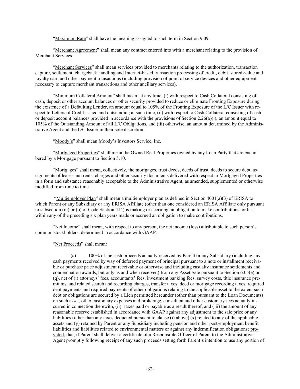 -32- “Maximum Rate” shall have the meaning assigned to such term in Section 9.09. “Merchant Agreement” shall mean any contract entered into with a merchant relating to the provision of Merchant Services. “Merchant Services” shall mean services provided to merchants relating to the authorization, transaction capture, settlement, chargeback handling and Internet-based transaction processing of credit, debit, stored-value and loyalty card and other payment transactions (including provision of point of service devices and other equipment necessary to capture merchant transactions and other ancillary services). “Minimum Collateral Amount” shall mean, at any time, (i) with respect to Cash Collateral consisting of cash, deposit or other account balances or other security provided to reduce or eliminate Fronting Exposure during the existence of a Defaulting Lender, an amount equal to 105% of the Fronting Exposure of the L/C Issuer with re- spect to Letters of Credit issued and outstanding at such time, (ii) with respect to Cash Collateral consisting of cash or deposit account balances provided in accordance with the provisions of Section 2.26(a)(i), an amount equal to 105% of the Outstanding Amount of all L/C Obligations, and (iii) otherwise, an amount determined by the Adminis- trative Agent and the L/C Issuer in their sole discretion. “Moody’s” shall mean Moody’s Investors Service, Inc. “Mortgaged Properties” shall mean the Owned Real Properties owned by any Loan Party that are encum- bered by a Mortgage pursuant to Section 5.10. “Mortgages” shall mean, collectively, the mortgages, trust deeds, deeds of trust, deeds to secure debt, as- signments of leases and rents, charges and other security documents delivered with respect to Mortgaged Properties in a form and substance reasonably acceptable to the Administrative Agent, as amended, supplemented or otherwise modified from time to time. “Multiemployer Plan” shall mean a multiemployer plan as defined in Section 4001(a)(3) of ERISA to which Parent or any Subsidiary or any ERISA Affiliate (other than one considered an ERISA Affiliate only pursuant to subsection (m) or (o) of Code Section 414) is making or accruing an obligation to make contributions, or has within any of the preceding six plan years made or accrued an obligation to make contributions. “Net Income” shall mean, with respect to any person, the net income (loss) attributable to such person’s common stockholders, determined in accordance with GAAP. “Net Proceeds” shall mean: (a) 100% of the cash proceeds actually received by Parent or any Subsidiary (including any cash payments received by way of deferred payment of principal pursuant to a note or installment receiva- ble or purchase price adjustment receivable or otherwise and including casualty insurance settlements and condemnation awards, but only as and when received) from any Asset Sale pursuant to Section 6.05(e) or (q), net of (i) attorneys’ fees, accountants’ fees, investment banking fees, survey costs, title insurance pre- miums, and related search and recording charges, transfer taxes, deed or mortgage recording taxes, required debt payments and required payments of other obligations relating to the applicable asset to the extent such debt or obligations are secured by a Lien permitted hereunder (other than pursuant to the Loan Documents) on such asset, other customary expenses and brokerage, consultant and other customary fees actually in- curred in connection therewith, (ii) Taxes paid or payable as a result thereof, and (iii) the amount of any reasonable reserve established in accordance with GAAP against any adjustment to the sale price or any liabilities (other than any taxes deducted pursuant to clause (i) above) (x) related to any of the applicable assets and (y) retained by Parent or any Subsidiary including pension and other post-employment benefit liabilities and liabilities related to environmental matters or against any indemnification obligations; pro- vided, that, if Parent shall deliver a certificate of a Responsible Officer of Parent to the Administrative Agent promptly following receipt of any such proceeds setting forth Parent’s intention to use any portion of