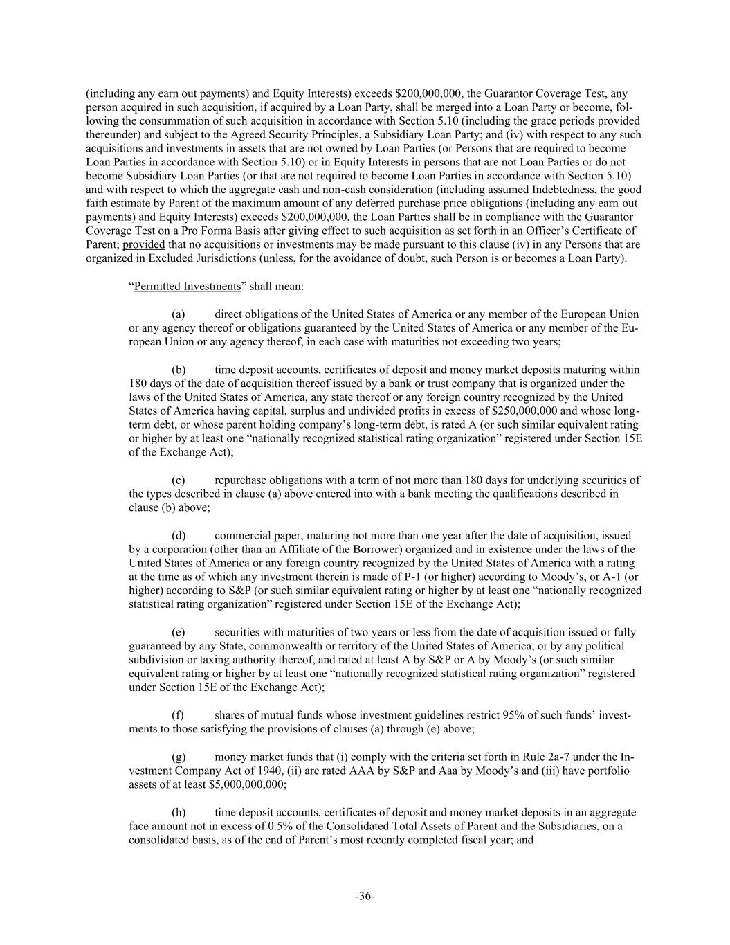 -36- (including any earn out payments) and Equity Interests) exceeds $200,000,000, the Guarantor Coverage Test, any person acquired in such acquisition, if acquired by a Loan Party, shall be merged into a Loan Party or become, fol- lowing the consummation of such acquisition in accordance with Section 5.10 (including the grace periods provided thereunder) and subject to the Agreed Security Principles, a Subsidiary Loan Party; and (iv) with respect to any such acquisitions and investments in assets that are not owned by Loan Parties (or Persons that are required to become Loan Parties in accordance with Section 5.10) or in Equity Interests in persons that are not Loan Parties or do not become Subsidiary Loan Parties (or that are not required to become Loan Parties in accordance with Section 5.10) and with respect to which the aggregate cash and non-cash consideration (including assumed Indebtedness, the good faith estimate by Parent of the maximum amount of any deferred purchase price obligations (including any earn out payments) and Equity Interests) exceeds $200,000,000, the Loan Parties shall be in compliance with the Guarantor Coverage Test on a Pro Forma Basis after giving effect to such acquisition as set forth in an Officer’s Certificate of Parent; provided that no acquisitions or investments may be made pursuant to this clause (iv) in any Persons that are organized in Excluded Jurisdictions (unless, for the avoidance of doubt, such Person is or becomes a Loan Party). “Permitted Investments” shall mean: (a) direct obligations of the United States of America or any member of the European Union or any agency thereof or obligations guaranteed by the United States of America or any member of the Eu- ropean Union or any agency thereof, in each case with maturities not exceeding two years; (b) time deposit accounts, certificates of deposit and money market deposits maturing within 180 days of the date of acquisition thereof issued by a bank or trust company that is organized under the laws of the United States of America, any state thereof or any foreign country recognized by the United States of America having capital, surplus and undivided profits in excess of $250,000,000 and whose long- term debt, or whose parent holding company’s long-term debt, is rated A (or such similar equivalent rating or higher by at least one “nationally recognized statistical rating organization” registered under Section 15E of the Exchange Act); (c) repurchase obligations with a term of not more than 180 days for underlying securities of the types described in clause (a) above entered into with a bank meeting the qualifications described in clause (b) above; (d) commercial paper, maturing not more than one year after the date of acquisition, issued by a corporation (other than an Affiliate of the Borrower) organized and in existence under the laws of the United States of America or any foreign country recognized by the United States of America with a rating at the time as of which any investment therein is made of P-1 (or higher) according to Moody’s, or A-1 (or higher) according to S&P (or such similar equivalent rating or higher by at least one “nationally recognized statistical rating organization” registered under Section 15E of the Exchange Act); (e) securities with maturities of two years or less from the date of acquisition issued or fully guaranteed by any State, commonwealth or territory of the United States of America, or by any political subdivision or taxing authority thereof, and rated at least A by S&P or A by Moody’s (or such similar equivalent rating or higher by at least one “nationally recognized statistical rating organization” registered under Section 15E of the Exchange Act); (f) shares of mutual funds whose investment guidelines restrict 95% of such funds’ invest- ments to those satisfying the provisions of clauses (a) through (e) above; (g) money market funds that (i) comply with the criteria set forth in Rule 2a-7 under the In- vestment Company Act of 1940, (ii) are rated AAA by S&P and Aaa by Moody’s and (iii) have portfolio assets of at least $5,000,000,000; (h) time deposit accounts, certificates of deposit and money market deposits in an aggregate face amount not in excess of 0.5% of the Consolidated Total Assets of Parent and the Subsidiaries, on a consolidated basis, as of the end of Parent’s most recently completed fiscal year; and