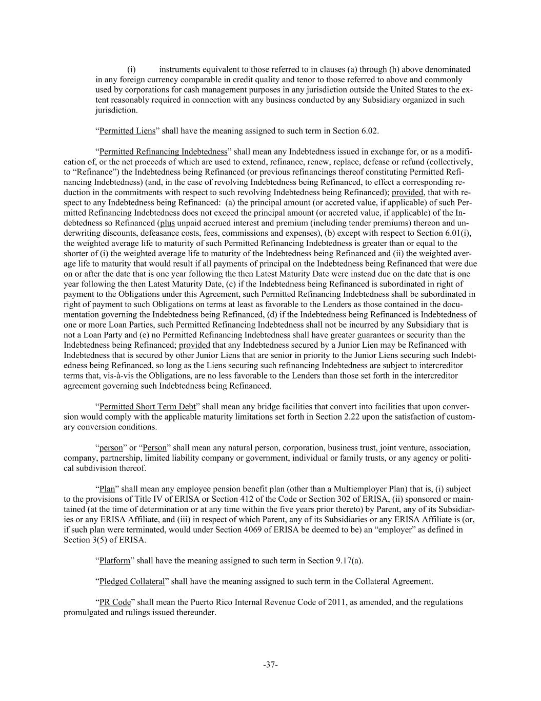 -37- (i) instruments equivalent to those referred to in clauses (a) through (h) above denominated in any foreign currency comparable in credit quality and tenor to those referred to above and commonly used by corporations for cash management purposes in any jurisdiction outside the United States to the ex- tent reasonably required in connection with any business conducted by any Subsidiary organized in such jurisdiction. “Permitted Liens” shall have the meaning assigned to such term in Section 6.02. “Permitted Refinancing Indebtedness” shall mean any Indebtedness issued in exchange for, or as a modifi- cation of, or the net proceeds of which are used to extend, refinance, renew, replace, defease or refund (collectively, to “Refinance”) the Indebtedness being Refinanced (or previous refinancings thereof constituting Permitted Refi- nancing Indebtedness) (and, in the case of revolving Indebtedness being Refinanced, to effect a corresponding re- duction in the commitments with respect to such revolving Indebtedness being Refinanced); provided, that with re- spect to any Indebtedness being Refinanced: (a) the principal amount (or accreted value, if applicable) of such Per- mitted Refinancing Indebtedness does not exceed the principal amount (or accreted value, if applicable) of the In- debtedness so Refinanced (plus unpaid accrued interest and premium (including tender premiums) thereon and un- derwriting discounts, defeasance costs, fees, commissions and expenses), (b) except with respect to Section 6.01(i), the weighted average life to maturity of such Permitted Refinancing Indebtedness is greater than or equal to the shorter of (i) the weighted average life to maturity of the Indebtedness being Refinanced and (ii) the weighted aver- age life to maturity that would result if all payments of principal on the Indebtedness being Refinanced that were due on or after the date that is one year following the then Latest Maturity Date were instead due on the date that is one year following the then Latest Maturity Date, (c) if the Indebtedness being Refinanced is subordinated in right of payment to the Obligations under this Agreement, such Permitted Refinancing Indebtedness shall be subordinated in right of payment to such Obligations on terms at least as favorable to the Lenders as those contained in the docu- mentation governing the Indebtedness being Refinanced, (d) if the Indebtedness being Refinanced is Indebtedness of one or more Loan Parties, such Permitted Refinancing Indebtedness shall not be incurred by any Subsidiary that is not a Loan Party and (e) no Permitted Refinancing Indebtedness shall have greater guarantees or security than the Indebtedness being Refinanced; provided that any Indebtedness secured by a Junior Lien may be Refinanced with Indebtedness that is secured by other Junior Liens that are senior in priority to the Junior Liens securing such Indebt- edness being Refinanced, so long as the Liens securing such refinancing Indebtedness are subject to intercreditor terms that, vis-à-vis the Obligations, are no less favorable to the Lenders than those set forth in the intercreditor agreement governing such Indebtedness being Refinanced. “Permitted Short Term Debt” shall mean any bridge facilities that convert into facilities that upon conver- sion would comply with the applicable maturity limitations set forth in Section 2.22 upon the satisfaction of custom- ary conversion conditions. “person” or “Person” shall mean any natural person, corporation, business trust, joint venture, association, company, partnership, limited liability company or government, individual or family trusts, or any agency or politi- cal subdivision thereof. “Plan” shall mean any employee pension benefit plan (other than a Multiemployer Plan) that is, (i) subject to the provisions of Title IV of ERISA or Section 412 of the Code or Section 302 of ERISA, (ii) sponsored or main- tained (at the time of determination or at any time within the five years prior thereto) by Parent, any of its Subsidiar- ies or any ERISA Affiliate, and (iii) in respect of which Parent, any of its Subsidiaries or any ERISA Affiliate is (or, if such plan were terminated, would under Section 4069 of ERISA be deemed to be) an “employer” as defined in Section 3(5) of ERISA. “Platform” shall have the meaning assigned to such term in Section 9.17(a). “Pledged Collateral” shall have the meaning assigned to such term in the Collateral Agreement. “PR Code” shall mean the Puerto Rico Internal Revenue Code of 2011, as amended, and the regulations promulgated and rulings issued thereunder.