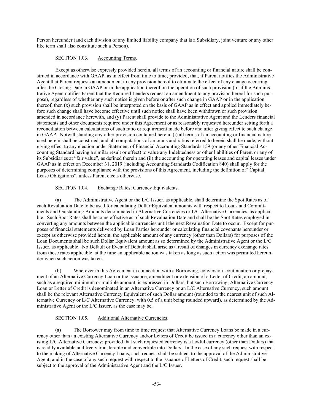 -53- Person hereunder (and each division of any limited liability company that is a Subsidiary, joint venture or any other like term shall also constitute such a Person). SECTION 1.03. Accounting Terms. Except as otherwise expressly provided herein, all terms of an accounting or financial nature shall be con- strued in accordance with GAAP, as in effect from time to time; provided, that, if Parent notifies the Administrative Agent that Parent requests an amendment to any provision hereof to eliminate the effect of any change occurring after the Closing Date in GAAP or in the application thereof on the operation of such provision (or if the Adminis- trative Agent notifies Parent that the Required Lenders request an amendment to any provision hereof for such pur- pose), regardless of whether any such notice is given before or after such change in GAAP or in the application thereof, then (x) such provision shall be interpreted on the basis of GAAP as in effect and applied immediately be- fore such change shall have become effective until such notice shall have been withdrawn or such provision amended in accordance herewith, and (y) Parent shall provide to the Administrative Agent and the Lenders financial statements and other documents required under this Agreement or as reasonably requested hereunder setting forth a reconciliation between calculations of such ratio or requirement made before and after giving effect to such change in GAAP. Notwithstanding any other provision contained herein, (i) all terms of an accounting or financial nature used herein shall be construed, and all computations of amounts and ratios referred to herein shall be made, without giving effect to any election under Statement of Financial Accounting Standards 159 (or any other Financial Ac- counting Standard having a similar result or effect) to value any Indebtedness or other liabilities of Parent or any of its Subsidiaries at “fair value”, as defined therein and (ii) the accounting for operating leases and capital leases under GAAP as in effect on December 31, 2019 (including Accounting Standards Codification 840) shall apply for the purposes of determining compliance with the provisions of this Agreement, including the definition of “Capital Lease Obligations”, unless Parent elects otherwise. SECTION 1.04. Exchange Rates; Currency Equivalents. (a) The Administrative Agent or the L/C Issuer, as applicable, shall determine the Spot Rates as of each Revaluation Date to be used for calculating Dollar Equivalent amounts with respect to Loans and Commit- ments and Outstanding Amounts denominated in Alternative Currencies or L/C Alternative Currencies, as applica- ble. Such Spot Rates shall become effective as of such Revaluation Date and shall be the Spot Rates employed in converting any amounts between the applicable currencies until the next Revaluation Date to occur. Except for pur- poses of financial statements delivered by Loan Parties hereunder or calculating financial covenants hereunder or except as otherwise provided herein, the applicable amount of any currency (other than Dollars) for purposes of the Loan Documents shall be such Dollar Equivalent amount as so determined by the Administrative Agent or the L/C Issuer, as applicable. No Default or Event of Default shall arise as a result of changes in currency exchange rates from those rates applicable at the time an applicable action was taken as long as such action was permitted hereun- der when such action was taken. (b) Wherever in this Agreement in connection with a Borrowing, conversion, continuation or prepay- ment of an Alternative Currency Loan or the issuance, amendment or extension of a Letter of Credit, an amount, such as a required minimum or multiple amount, is expressed in Dollars, but such Borrowing, Alternative Currency Loan or Letter of Credit is denominated in an Alternative Currency or an L/C Alternative Currency, such amount shall be the relevant Alternative Currency Equivalent of such Dollar amount (rounded to the nearest unit of such Al- ternative Currency or L/C Alternative Currency, with 0.5 of a unit being rounded upward), as determined by the Ad- ministrative Agent or the L/C Issuer, as the case may be. SECTION 1.05. Additional Alternative Currencies. (a) The Borrower may from time to time request that Alternative Currency Loans be made in a cur- rency other than an existing Alternative Currency and/or Letters of Credit be issued in a currency other than an ex- isting L/C Alternative Currency; provided that such requested currency is a lawful currency (other than Dollars) that is readily available and freely transferable and convertible into Dollars. In the case of any such request with respect to the making of Alternative Currency Loans, such request shall be subject to the approval of the Administrative Agent; and in the case of any such request with respect to the issuance of Letters of Credit, such request shall be subject to the approval of the Administrative Agent and the L/C Issuer.