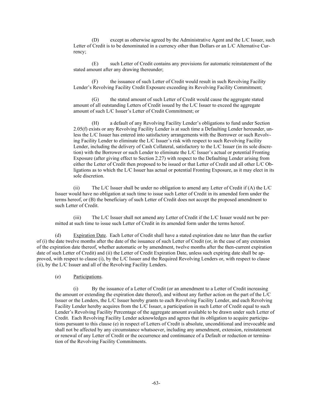 -63- (D) except as otherwise agreed by the Administrative Agent and the L/C Issuer, such Letter of Credit is to be denominated in a currency other than Dollars or an L/C Alternative Cur- rency; (E) such Letter of Credit contains any provisions for automatic reinstatement of the stated amount after any drawing thereunder; (F) the issuance of such Letter of Credit would result in such Revolving Facility Lender’s Revolving Facility Credit Exposure exceeding its Revolving Facility Commitment; (G) the stated amount of such Letter of Credit would cause the aggregate stated amount of all outstanding Letters of Credit issued by the L/C Issuer to exceed the aggregate amount of such L/C Issuer’s Letter of Credit Commitment; or (H) a default of any Revolving Facility Lender’s obligations to fund under Section 2.05(f) exists or any Revolving Facility Lender is at such time a Defaulting Lender hereunder, un- less the L/C Issuer has entered into satisfactory arrangements with the Borrower or such Revolv- ing Facility Lender to eliminate the L/C Issuer’s risk with respect to such Revolving Facility Lender, including the delivery of Cash Collateral, satisfactory to the L/C Issuer (in its sole discre- tion) with the Borrower or such Lender to eliminate the L/C Issuer’s actual or potential Fronting Exposure (after giving effect to Section 2.27) with respect to the Defaulting Lender arising from either the Letter of Credit then proposed to be issued or that Letter of Credit and all other L/C Ob- ligations as to which the L/C Issuer has actual or potential Fronting Exposure, as it may elect in its sole discretion. (ii) The L/C Issuer shall be under no obligation to amend any Letter of Credit if (A) the L/C Issuer would have no obligation at such time to issue such Letter of Credit in its amended form under the terms hereof, or (B) the beneficiary of such Letter of Credit does not accept the proposed amendment to such Letter of Credit. (iii) The L/C Issuer shall not amend any Letter of Credit if the L/C Issuer would not be per- mitted at such time to issue such Letter of Credit in its amended form under the terms hereof. (d) Expiration Date. Each Letter of Credit shall have a stated expiration date no later than the earlier of (i) the date twelve months after the date of the issuance of such Letter of Credit (or, in the case of any extension of the expiration date thereof, whether automatic or by amendment, twelve months after the then-current expiration date of such Letter of Credit) and (ii) the Letter of Credit Expiration Date, unless such expiring date shall be ap- proved, with respect to clause (i), by the L/C Issuer and the Required Revolving Lenders or, with respect to clause (ii), by the L/C Issuer and all of the Revolving Facility Lenders. (e) Participations. (i) By the issuance of a Letter of Credit (or an amendment to a Letter of Credit increasing the amount or extending the expiration date thereof), and without any further action on the part of the L/C Issuer or the Lenders, the L/C Issuer hereby grants to each Revolving Facility Lender, and each Revolving Facility Lender hereby acquires from the L/C Issuer, a participation in such Letter of Credit equal to such Lender’s Revolving Facility Percentage of the aggregate amount available to be drawn under such Letter of Credit. Each Revolving Facility Lender acknowledges and agrees that its obligation to acquire participa- tions pursuant to this clause (e) in respect of Letters of Credit is absolute, unconditional and irrevocable and shall not be affected by any circumstance whatsoever, including any amendment, extension, reinstatement or renewal of any Letter of Credit or the occurrence and continuance of a Default or reduction or termina- tion of the Revolving Facility Commitments.