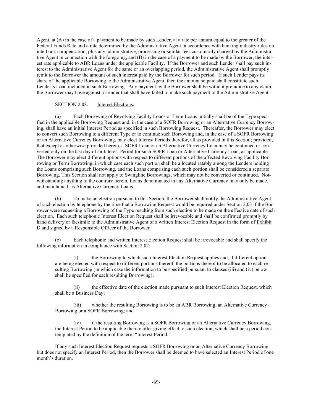 -69- Agent, at (A) in the case of a payment to be made by such Lender, at a rate per annum equal to the greater of the Federal Funds Rate and a rate determined by the Administrative Agent in accordance with banking industry rules on interbank compensation, plus any administrative, processing or similar fees customarily charged by the Administra- tive Agent in connection with the foregoing, and (B) in the case of a payment to be made by the Borrower, the inter- est rate applicable to ABR Loans under the applicable Facility. If the Borrower and such Lender shall pay such in- terest to the Administrative Agent for the same or an overlapping period, the Administrative Agent shall promptly remit to the Borrower the amount of such interest paid by the Borrower for such period. If such Lender pays its share of the applicable Borrowing to the Administrative Agent, then the amount so paid shall constitute such Lender’s Loan included in such Borrowing. Any payment by the Borrower shall be without prejudice to any claim the Borrower may have against a Lender that shall have failed to make such payment to the Administrative Agent. SECTION 2.08. Interest Elections. (a) Each Borrowing of Revolving Facility Loans or Term Loans initially shall be of the Type speci- fied in the applicable Borrowing Request and, in the case of a SOFR Borrowing or an Alternative Currency Borrow- ing, shall have an initial Interest Period as specified in such Borrowing Request. Thereafter, the Borrower may elect to convert such Borrowing to a different Type or to continue such Borrowing and, in the case of a SOFR Borrowing or an Alternative Currency Borrowing, may elect Interest Periods therefor, all as provided in this Section; provided, that except as otherwise provided herein, a SOFR Loan or an Alternative Currency Loan may be continued or con- verted only on the last day of an Interest Period for such SOFR Loan or Alternative Currency Loan, as applicable. The Borrower may elect different options with respect to different portions of the affected Revolving Facility Bor- rowing or Term Borrowing, in which case each such portion shall be allocated ratably among the Lenders holding the Loans comprising such Borrowing, and the Loans comprising each such portion shall be considered a separate Borrowing. This Section shall not apply to Swingline Borrowings, which may not be converted or continued. Not- withstanding anything to the contrary herein, Loans denominated in any Alternative Currency may only be made, and maintained, as Alternative Currency Loans. (b) To make an election pursuant to this Section, the Borrower shall notify the Administrative Agent of such election by telephone by the time that a Borrowing Request would be required under Section 2.03 if the Bor- rower were requesting a Borrowing of the Type resulting from such election to be made on the effective date of such election. Each such telephonic Interest Election Request shall be irrevocable and shall be confirmed promptly by hand delivery or facsimile to the Administrative Agent of a written Interest Election Request in the form of Exhibit D and signed by a Responsible Officer of the Borrower. (c) Each telephonic and written Interest Election Request shall be irrevocable and shall specify the following information in compliance with Section 2.02: (i) the Borrowing to which such Interest Election Request applies and, if different options are being elected with respect to different portions thereof, the portions thereof to be allocated to each re- sulting Borrowing (in which case the information to be specified pursuant to clauses (iii) and (iv) below shall be specified for each resulting Borrowing); (ii) the effective date of the election made pursuant to such Interest Election Request, which shall be a Business Day; (iii) whether the resulting Borrowing is to be an ABR Borrowing, an Alternative Currency Borrowing or a SOFR Borrowing; and (iv) if the resulting Borrowing is a SOFR Borrowing or an Alternative Currency Borrowing, the Interest Period to be applicable thereto after giving effect to such election, which shall be a period con- templated by the definition of the term “Interest Period.” If any such Interest Election Request requests a SOFR Borrowing or an Alternative Currency Borrowing but does not specify an Interest Period, then the Borrower shall be deemed to have selected an Interest Period of one month’s duration.