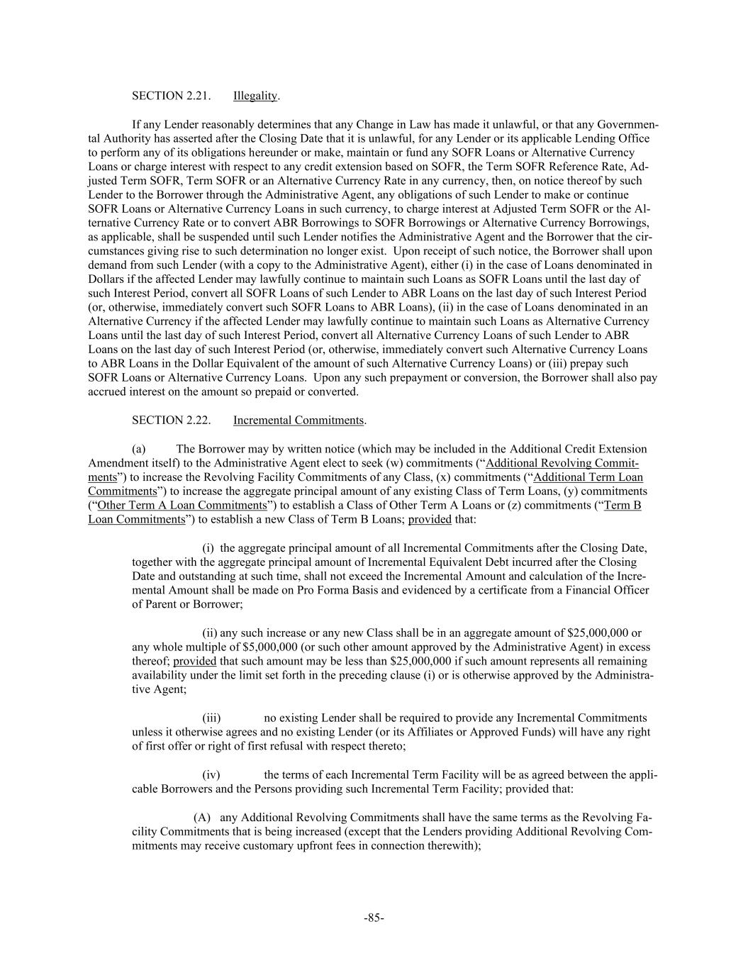-85- SECTION 2.21. Illegality. If any Lender reasonably determines that any Change in Law has made it unlawful, or that any Governmen- tal Authority has asserted after the Closing Date that it is unlawful, for any Lender or its applicable Lending Office to perform any of its obligations hereunder or make, maintain or fund any SOFR Loans or Alternative Currency Loans or charge interest with respect to any credit extension based on SOFR, the Term SOFR Reference Rate, Ad- justed Term SOFR, Term SOFR or an Alternative Currency Rate in any currency, then, on notice thereof by such Lender to the Borrower through the Administrative Agent, any obligations of such Lender to make or continue SOFR Loans or Alternative Currency Loans in such currency, to charge interest at Adjusted Term SOFR or the Al- ternative Currency Rate or to convert ABR Borrowings to SOFR Borrowings or Alternative Currency Borrowings, as applicable, shall be suspended until such Lender notifies the Administrative Agent and the Borrower that the cir- cumstances giving rise to such determination no longer exist. Upon receipt of such notice, the Borrower shall upon demand from such Lender (with a copy to the Administrative Agent), either (i) in the case of Loans denominated in Dollars if the affected Lender may lawfully continue to maintain such Loans as SOFR Loans until the last day of such Interest Period, convert all SOFR Loans of such Lender to ABR Loans on the last day of such Interest Period (or, otherwise, immediately convert such SOFR Loans to ABR Loans), (ii) in the case of Loans denominated in an Alternative Currency if the affected Lender may lawfully continue to maintain such Loans as Alternative Currency Loans until the last day of such Interest Period, convert all Alternative Currency Loans of such Lender to ABR Loans on the last day of such Interest Period (or, otherwise, immediately convert such Alternative Currency Loans to ABR Loans in the Dollar Equivalent of the amount of such Alternative Currency Loans) or (iii) prepay such SOFR Loans or Alternative Currency Loans. Upon any such prepayment or conversion, the Borrower shall also pay accrued interest on the amount so prepaid or converted. SECTION 2.22. Incremental Commitments. (a) The Borrower may by written notice (which may be included in the Additional Credit Extension Amendment itself) to the Administrative Agent elect to seek (w) commitments (“Additional Revolving Commit- ments”) to increase the Revolving Facility Commitments of any Class, (x) commitments (“Additional Term Loan Commitments”) to increase the aggregate principal amount of any existing Class of Term Loans, (y) commitments (“Other Term A Loan Commitments”) to establish a Class of Other Term A Loans or (z) commitments (“Term B Loan Commitments”) to establish a new Class of Term B Loans; provided that: (i) the aggregate principal amount of all Incremental Commitments after the Closing Date, together with the aggregate principal amount of Incremental Equivalent Debt incurred after the Closing Date and outstanding at such time, shall not exceed the Incremental Amount and calculation of the Incre- mental Amount shall be made on Pro Forma Basis and evidenced by a certificate from a Financial Officer of Parent or Borrower; (ii) any such increase or any new Class shall be in an aggregate amount of $25,000,000 or any whole multiple of $5,000,000 (or such other amount approved by the Administrative Agent) in excess thereof; provided that such amount may be less than $25,000,000 if such amount represents all remaining availability under the limit set forth in the preceding clause (i) or is otherwise approved by the Administra- tive Agent; (iii) no existing Lender shall be required to provide any Incremental Commitments unless it otherwise agrees and no existing Lender (or its Affiliates or Approved Funds) will have any right of first offer or right of first refusal with respect thereto; (iv) the terms of each Incremental Term Facility will be as agreed between the appli- cable Borrowers and the Persons providing such Incremental Term Facility; provided that: (A) any Additional Revolving Commitments shall have the same terms as the Revolving Fa- cility Commitments that is being increased (except that the Lenders providing Additional Revolving Com- mitments may receive customary upfront fees in connection therewith);