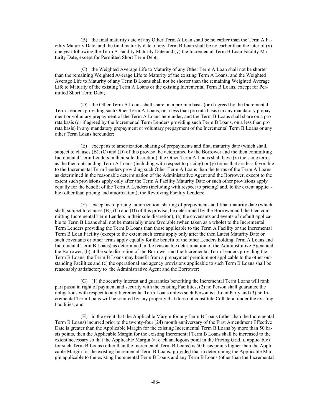 -86- (B) the final maturity date of any Other Term A Loan shall be no earlier than the Term A Fa- cility Maturity Date, and the final maturity date of any Term B Loan shall be no earlier than the later of (x) one year following the Term A Facility Maturity Date and (y) the Incremental Term B Loan Facility Ma- turity Date, except for Permitted Short Term Debt; (C) the Weighted Average Life to Maturity of any Other Term A Loan shall not be shorter than the remaining Weighted Average Life to Maturity of the existing Term A Loans, and the Weighted Average Life to Maturity of any Term B Loans shall not be shorter than the remaining Weighted Average Life to Maturity of the existing Term A Loans or the existing Incremental Term B Loans, except for Per- mitted Short Term Debt; (D) the Other Term A Loans shall share on a pro rata basis (or if agreed by the Incremental Term Lenders providing such Other Term A Loans, on a less than pro rata basis) in any mandatory prepay- ment or voluntary prepayment of the Term A Loans hereunder, and the Term B Loans shall share on a pro rata basis (or if agreed by the Incremental Term Lenders providing such Term B Loans, on a less than pro rata basis) in any mandatory prepayment or voluntary prepayment of the Incremental Term B Loans or any other Term Loans hereunder; (E) except as to amortization, sharing of prepayments and final maturity date (which shall, subject to clauses (B), (C) and (D) of this proviso, be determined by the Borrower and the then committing Incremental Term Lenders in their sole discretion), the Other Term A Loans shall have (x) the same terms as the then outstanding Term A Loans (including with respect to pricing) or (y) terms that are less favorable to the Incremental Term Lenders providing such Other Term A Loans than the terms of the Term A Loans as determined in the reasonable determination of the Administrative Agent and the Borrower, except to the extent such provisions apply only after the Term A Facility Maturity Date or such other provisions apply equally for the benefit of the Term A Lenders (including with respect to pricing) and, to the extent applica- ble (other than pricing and amortization), the Revolving Facility Lenders; (F) except as to pricing, amortization, sharing of prepayments and final maturity date (which shall, subject to clauses (B), (C) and (D) of this proviso, be determined by the Borrower and the then com- mitting Incremental Term Lenders in their sole discretion), (a) the covenants and events of default applica- ble to Term B Loans shall not be materially more favorable (when taken as a whole) to the Incremental Term Lenders providing the Term B Loans than those applicable to the Term A Facility or the Incremental Term B Loan Facility (except to the extent such terms apply only after the then Latest Maturity Date or such covenants or other terms apply equally for the benefit of the other Lenders holding Term A Loans and Incremental Term B Loans) as determined in the reasonable determination of the Administrative Agent and the Borrower, (b) at the sole discretion of the Borrower and the Incremental Term Lenders providing the Term B Loans, the Term B Loans may benefit from a prepayment premium not applicable to the other out- standing Facilities and (c) the operational and agency provisions applicable to such Term B Loans shall be reasonably satisfactory to the Administrative Agent and the Borrower; (G) (1) the security interest and guaranties benefiting the Incremental Term Loans will rank pari passu in right of payment and security with the existing Facilities, (2) no Person shall guarantee the obligations with respect to any Incremental Term Loans unless such Person is a Loan Party and (3) no In- cremental Term Loans will be secured by any property that does not constitute Collateral under the existing Facilities; and (H) in the event that the Applicable Margin for any Term B Loans (other than the Incremental Term B Loans) incurred prior to the twenty-four (24) month anniversary of the First Amendment Effective Date is greater than the Applicable Margin for the existing Incremental Term B Loans by more than 50 ba- sis points, then the Applicable Margin for the existing Incremental Term B Loans shall be increased to the extent necessary so that the Applicable Margin (at each analogous point in the Pricing Grid, if applicable) for such Term B Loans (other than the Incremental Term B Loans) is 50 basis points higher than the Appli- cable Margin for the existing Incremental Term B Loans; provided that in determining the Applicable Mar- gin applicable to the existing Incremental Term B Loans and any Term B Loans (other than the Incremental