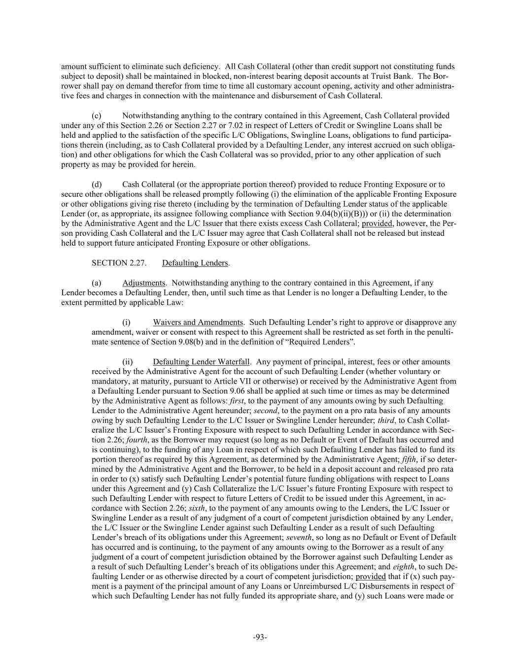 -93- amount sufficient to eliminate such deficiency. All Cash Collateral (other than credit support not constituting funds subject to deposit) shall be maintained in blocked, non-interest bearing deposit accounts at Truist Bank. The Bor- rower shall pay on demand therefor from time to time all customary account opening, activity and other administra- tive fees and charges in connection with the maintenance and disbursement of Cash Collateral. (c) Notwithstanding anything to the contrary contained in this Agreement, Cash Collateral provided under any of this Section 2.26 or Section 2.27 or 7.02 in respect of Letters of Credit or Swingline Loans shall be held and applied to the satisfaction of the specific L/C Obligations, Swingline Loans, obligations to fund participa- tions therein (including, as to Cash Collateral provided by a Defaulting Lender, any interest accrued on such obliga- tion) and other obligations for which the Cash Collateral was so provided, prior to any other application of such property as may be provided for herein. (d) Cash Collateral (or the appropriate portion thereof) provided to reduce Fronting Exposure or to secure other obligations shall be released promptly following (i) the elimination of the applicable Fronting Exposure or other obligations giving rise thereto (including by the termination of Defaulting Lender status of the applicable Lender (or, as appropriate, its assignee following compliance with Section 9.04(b)(ii)(B))) or (ii) the determination by the Administrative Agent and the L/C Issuer that there exists excess Cash Collateral; provided, however, the Per- son providing Cash Collateral and the L/C Issuer may agree that Cash Collateral shall not be released but instead held to support future anticipated Fronting Exposure or other obligations. SECTION 2.27. Defaulting Lenders. (a) Adjustments. Notwithstanding anything to the contrary contained in this Agreement, if any Lender becomes a Defaulting Lender, then, until such time as that Lender is no longer a Defaulting Lender, to the extent permitted by applicable Law: (i) Waivers and Amendments. Such Defaulting Lender’s right to approve or disapprove any amendment, waiver or consent with respect to this Agreement shall be restricted as set forth in the penulti- mate sentence of Section 9.08(b) and in the definition of “Required Lenders”. (ii) Defaulting Lender Waterfall. Any payment of principal, interest, fees or other amounts received by the Administrative Agent for the account of such Defaulting Lender (whether voluntary or mandatory, at maturity, pursuant to Article VII or otherwise) or received by the Administrative Agent from a Defaulting Lender pursuant to Section 9.06 shall be applied at such time or times as may be determined by the Administrative Agent as follows: first, to the payment of any amounts owing by such Defaulting Lender to the Administrative Agent hereunder; second, to the payment on a pro rata basis of any amounts owing by such Defaulting Lender to the L/C Issuer or Swingline Lender hereunder; third, to Cash Collat- eralize the L/C Issuer’s Fronting Exposure with respect to such Defaulting Lender in accordance with Sec- tion 2.26; fourth, as the Borrower may request (so long as no Default or Event of Default has occurred and is continuing), to the funding of any Loan in respect of which such Defaulting Lender has failed to fund its portion thereof as required by this Agreement, as determined by the Administrative Agent; fifth, if so deter- mined by the Administrative Agent and the Borrower, to be held in a deposit account and released pro rata in order to (x) satisfy such Defaulting Lender’s potential future funding obligations with respect to Loans under this Agreement and (y) Cash Collateralize the L/C Issuer’s future Fronting Exposure with respect to such Defaulting Lender with respect to future Letters of Credit to be issued under this Agreement, in ac- cordance with Section 2.26; sixth, to the payment of any amounts owing to the Lenders, the L/C Issuer or Swingline Lender as a result of any judgment of a court of competent jurisdiction obtained by any Lender, the L/C Issuer or the Swingline Lender against such Defaulting Lender as a result of such Defaulting Lender’s breach of its obligations under this Agreement; seventh, so long as no Default or Event of Default has occurred and is continuing, to the payment of any amounts owing to the Borrower as a result of any judgment of a court of competent jurisdiction obtained by the Borrower against such Defaulting Lender as a result of such Defaulting Lender’s breach of its obligations under this Agreement; and eighth, to such De- faulting Lender or as otherwise directed by a court of competent jurisdiction; provided that if (x) such pay- ment is a payment of the principal amount of any Loans or Unreimbursed L/C Disbursements in respect of which such Defaulting Lender has not fully funded its appropriate share, and (y) such Loans were made or