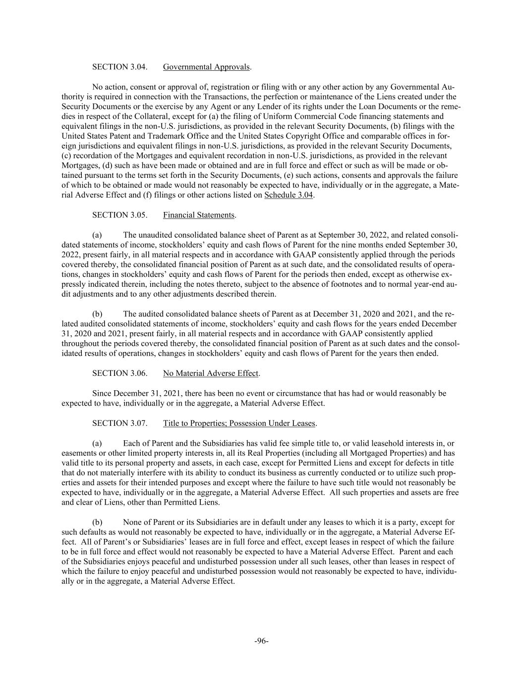 -96- SECTION 3.04. Governmental Approvals. No action, consent or approval of, registration or filing with or any other action by any Governmental Au- thority is required in connection with the Transactions, the perfection or maintenance of the Liens created under the Security Documents or the exercise by any Agent or any Lender of its rights under the Loan Documents or the reme- dies in respect of the Collateral, except for (a) the filing of Uniform Commercial Code financing statements and equivalent filings in the non-U.S. jurisdictions, as provided in the relevant Security Documents, (b) filings with the United States Patent and Trademark Office and the United States Copyright Office and comparable offices in for- eign jurisdictions and equivalent filings in non-U.S. jurisdictions, as provided in the relevant Security Documents, (c) recordation of the Mortgages and equivalent recordation in non-U.S. jurisdictions, as provided in the relevant Mortgages, (d) such as have been made or obtained and are in full force and effect or such as will be made or ob- tained pursuant to the terms set forth in the Security Documents, (e) such actions, consents and approvals the failure of which to be obtained or made would not reasonably be expected to have, individually or in the aggregate, a Mate- rial Adverse Effect and (f) filings or other actions listed on Schedule 3.04. SECTION 3.05. Financial Statements. (a) The unaudited consolidated balance sheet of Parent as at September 30, 2022, and related consoli- dated statements of income, stockholders’ equity and cash flows of Parent for the nine months ended September 30, 2022, present fairly, in all material respects and in accordance with GAAP consistently applied through the periods covered thereby, the consolidated financial position of Parent as at such date, and the consolidated results of opera- tions, changes in stockholders’ equity and cash flows of Parent for the periods then ended, except as otherwise ex- pressly indicated therein, including the notes thereto, subject to the absence of footnotes and to normal year-end au- dit adjustments and to any other adjustments described therein. (b) The audited consolidated balance sheets of Parent as at December 31, 2020 and 2021, and the re- lated audited consolidated statements of income, stockholders’ equity and cash flows for the years ended December 31, 2020 and 2021, present fairly, in all material respects and in accordance with GAAP consistently applied throughout the periods covered thereby, the consolidated financial position of Parent as at such dates and the consol- idated results of operations, changes in stockholders’ equity and cash flows of Parent for the years then ended. SECTION 3.06. No Material Adverse Effect. Since December 31, 2021, there has been no event or circumstance that has had or would reasonably be expected to have, individually or in the aggregate, a Material Adverse Effect. SECTION 3.07. Title to Properties; Possession Under Leases. (a) Each of Parent and the Subsidiaries has valid fee simple title to, or valid leasehold interests in, or easements or other limited property interests in, all its Real Properties (including all Mortgaged Properties) and has valid title to its personal property and assets, in each case, except for Permitted Liens and except for defects in title that do not materially interfere with its ability to conduct its business as currently conducted or to utilize such prop- erties and assets for their intended purposes and except where the failure to have such title would not reasonably be expected to have, individually or in the aggregate, a Material Adverse Effect. All such properties and assets are free and clear of Liens, other than Permitted Liens. (b) None of Parent or its Subsidiaries are in default under any leases to which it is a party, except for such defaults as would not reasonably be expected to have, individually or in the aggregate, a Material Adverse Ef- fect. All of Parent’s or Subsidiaries’ leases are in full force and effect, except leases in respect of which the failure to be in full force and effect would not reasonably be expected to have a Material Adverse Effect. Parent and each of the Subsidiaries enjoys peaceful and undisturbed possession under all such leases, other than leases in respect of which the failure to enjoy peaceful and undisturbed possession would not reasonably be expected to have, individu- ally or in the aggregate, a Material Adverse Effect.