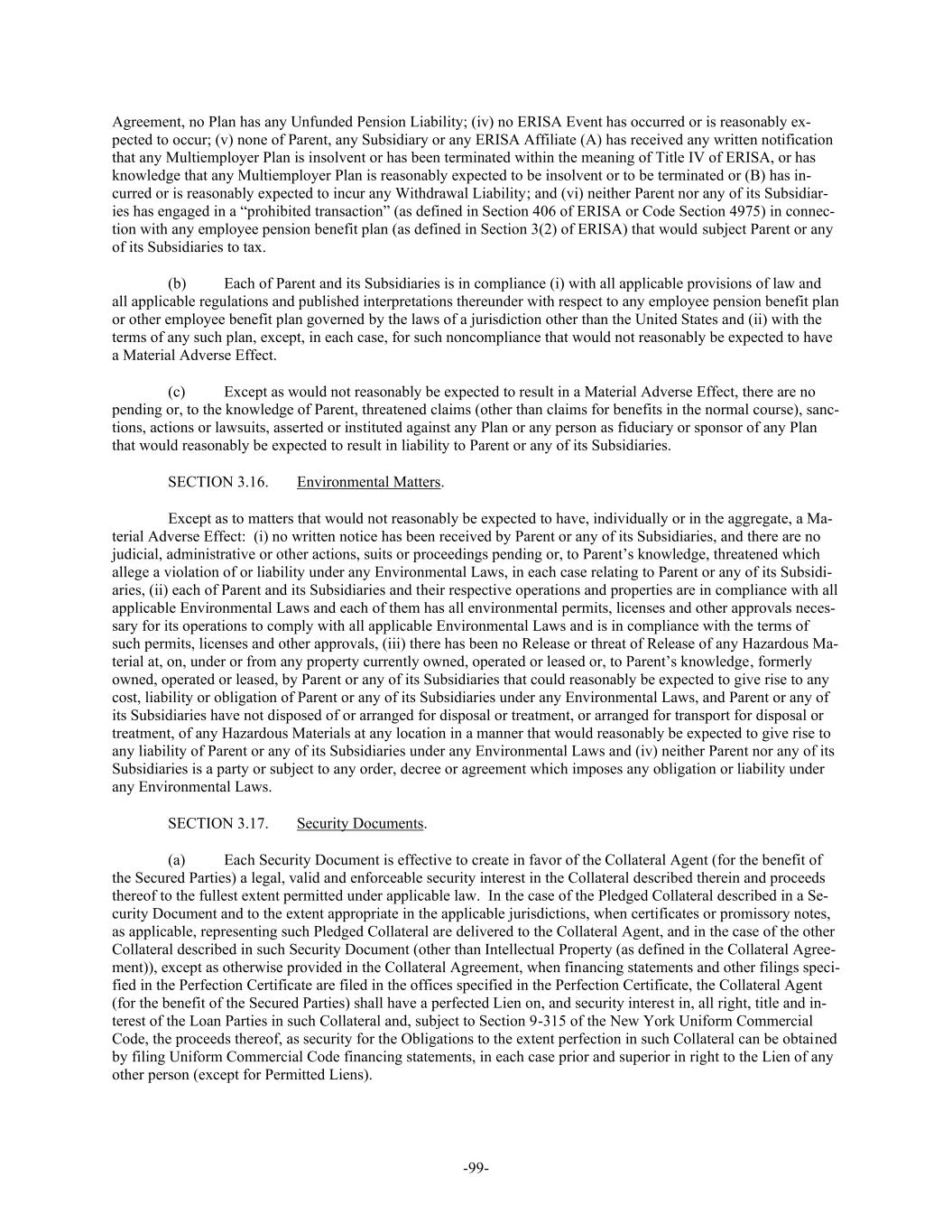 -99- Agreement, no Plan has any Unfunded Pension Liability; (iv) no ERISA Event has occurred or is reasonably ex- pected to occur; (v) none of Parent, any Subsidiary or any ERISA Affiliate (A) has received any written notification that any Multiemployer Plan is insolvent or has been terminated within the meaning of Title IV of ERISA, or has knowledge that any Multiemployer Plan is reasonably expected to be insolvent or to be terminated or (B) has in- curred or is reasonably expected to incur any Withdrawal Liability; and (vi) neither Parent nor any of its Subsidiar- ies has engaged in a “prohibited transaction” (as defined in Section 406 of ERISA or Code Section 4975) in connec- tion with any employee pension benefit plan (as defined in Section 3(2) of ERISA) that would subject Parent or any of its Subsidiaries to tax. (b) Each of Parent and its Subsidiaries is in compliance (i) with all applicable provisions of law and all applicable regulations and published interpretations thereunder with respect to any employee pension benefit plan or other employee benefit plan governed by the laws of a jurisdiction other than the United States and (ii) with the terms of any such plan, except, in each case, for such noncompliance that would not reasonably be expected to have a Material Adverse Effect. (c) Except as would not reasonably be expected to result in a Material Adverse Effect, there are no pending or, to the knowledge of Parent, threatened claims (other than claims for benefits in the normal course), sanc- tions, actions or lawsuits, asserted or instituted against any Plan or any person as fiduciary or sponsor of any Plan that would reasonably be expected to result in liability to Parent or any of its Subsidiaries. SECTION 3.16. Environmental Matters. Except as to matters that would not reasonably be expected to have, individually or in the aggregate, a Ma- terial Adverse Effect: (i) no written notice has been received by Parent or any of its Subsidiaries, and there are no judicial, administrative or other actions, suits or proceedings pending or, to Parent’s knowledge, threatened which allege a violation of or liability under any Environmental Laws, in each case relating to Parent or any of its Subsidi- aries, (ii) each of Parent and its Subsidiaries and their respective operations and properties are in compliance with all applicable Environmental Laws and each of them has all environmental permits, licenses and other approvals neces- sary for its operations to comply with all applicable Environmental Laws and is in compliance with the terms of such permits, licenses and other approvals, (iii) there has been no Release or threat of Release of any Hazardous Ma- terial at, on, under or from any property currently owned, operated or leased or, to Parent’s knowledge, formerly owned, operated or leased, by Parent or any of its Subsidiaries that could reasonably be expected to give rise to any cost, liability or obligation of Parent or any of its Subsidiaries under any Environmental Laws, and Parent or any of its Subsidiaries have not disposed of or arranged for disposal or treatment, or arranged for transport for disposal or treatment, of any Hazardous Materials at any location in a manner that would reasonably be expected to give rise to any liability of Parent or any of its Subsidiaries under any Environmental Laws and (iv) neither Parent nor any of its Subsidiaries is a party or subject to any order, decree or agreement which imposes any obligation or liability under any Environmental Laws. SECTION 3.17. Security Documents. (a) Each Security Document is effective to create in favor of the Collateral Agent (for the benefit of the Secured Parties) a legal, valid and enforceable security interest in the Collateral described therein and proceeds thereof to the fullest extent permitted under applicable law. In the case of the Pledged Collateral described in a Se- curity Document and to the extent appropriate in the applicable jurisdictions, when certificates or promissory notes, as applicable, representing such Pledged Collateral are delivered to the Collateral Agent, and in the case of the other Collateral described in such Security Document (other than Intellectual Property (as defined in the Collateral Agree- ment)), except as otherwise provided in the Collateral Agreement, when financing statements and other filings speci- fied in the Perfection Certificate are filed in the offices specified in the Perfection Certificate, the Collateral Agent (for the benefit of the Secured Parties) shall have a perfected Lien on, and security interest in, all right, title and in- terest of the Loan Parties in such Collateral and, subject to Section 9-315 of the New York Uniform Commercial Code, the proceeds thereof, as security for the Obligations to the extent perfection in such Collateral can be obtained by filing Uniform Commercial Code financing statements, in each case prior and superior in right to the Lien of any other person (except for Permitted Liens).