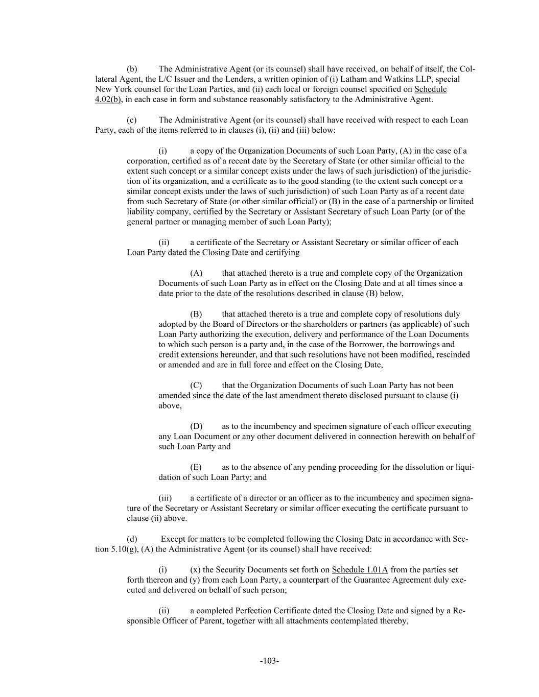 -103- (b) The Administrative Agent (or its counsel) shall have received, on behalf of itself, the Col- lateral Agent, the L/C Issuer and the Lenders, a written opinion of (i) Latham and Watkins LLP, special New York counsel for the Loan Parties, and (ii) each local or foreign counsel specified on Schedule 4.02(b), in each case in form and substance reasonably satisfactory to the Administrative Agent. (c) The Administrative Agent (or its counsel) shall have received with respect to each Loan Party, each of the items referred to in clauses (i), (ii) and (iii) below: (i) a copy of the Organization Documents of such Loan Party, (A) in the case of a corporation, certified as of a recent date by the Secretary of State (or other similar official to the extent such concept or a similar concept exists under the laws of such jurisdiction) of the jurisdic- tion of its organization, and a certificate as to the good standing (to the extent such concept or a similar concept exists under the laws of such jurisdiction) of such Loan Party as of a recent date from such Secretary of State (or other similar official) or (B) in the case of a partnership or limited liability company, certified by the Secretary or Assistant Secretary of such Loan Party (or of the general partner or managing member of such Loan Party); (ii) a certificate of the Secretary or Assistant Secretary or similar officer of each Loan Party dated the Closing Date and certifying (A) that attached thereto is a true and complete copy of the Organization Documents of such Loan Party as in effect on the Closing Date and at all times since a date prior to the date of the resolutions described in clause (B) below, (B) that attached thereto is a true and complete copy of resolutions duly adopted by the Board of Directors or the shareholders or partners (as applicable) of such Loan Party authorizing the execution, delivery and performance of the Loan Documents to which such person is a party and, in the case of the Borrower, the borrowings and credit extensions hereunder, and that such resolutions have not been modified, rescinded or amended and are in full force and effect on the Closing Date, (C) that the Organization Documents of such Loan Party has not been amended since the date of the last amendment thereto disclosed pursuant to clause (i) above, (D) as to the incumbency and specimen signature of each officer executing any Loan Document or any other document delivered in connection herewith on behalf of such Loan Party and (E) as to the absence of any pending proceeding for the dissolution or liqui- dation of such Loan Party; and (iii) a certificate of a director or an officer as to the incumbency and specimen signa- ture of the Secretary or Assistant Secretary or similar officer executing the certificate pursuant to clause (ii) above. (d) Except for matters to be completed following the Closing Date in accordance with Sec- tion 5.10(g), (A) the Administrative Agent (or its counsel) shall have received: (i) (x) the Security Documents set forth on Schedule 1.01A from the parties set forth thereon and (y) from each Loan Party, a counterpart of the Guarantee Agreement duly exe- cuted and delivered on behalf of such person; (ii) a completed Perfection Certificate dated the Closing Date and signed by a Re- sponsible Officer of Parent, together with all attachments contemplated thereby,