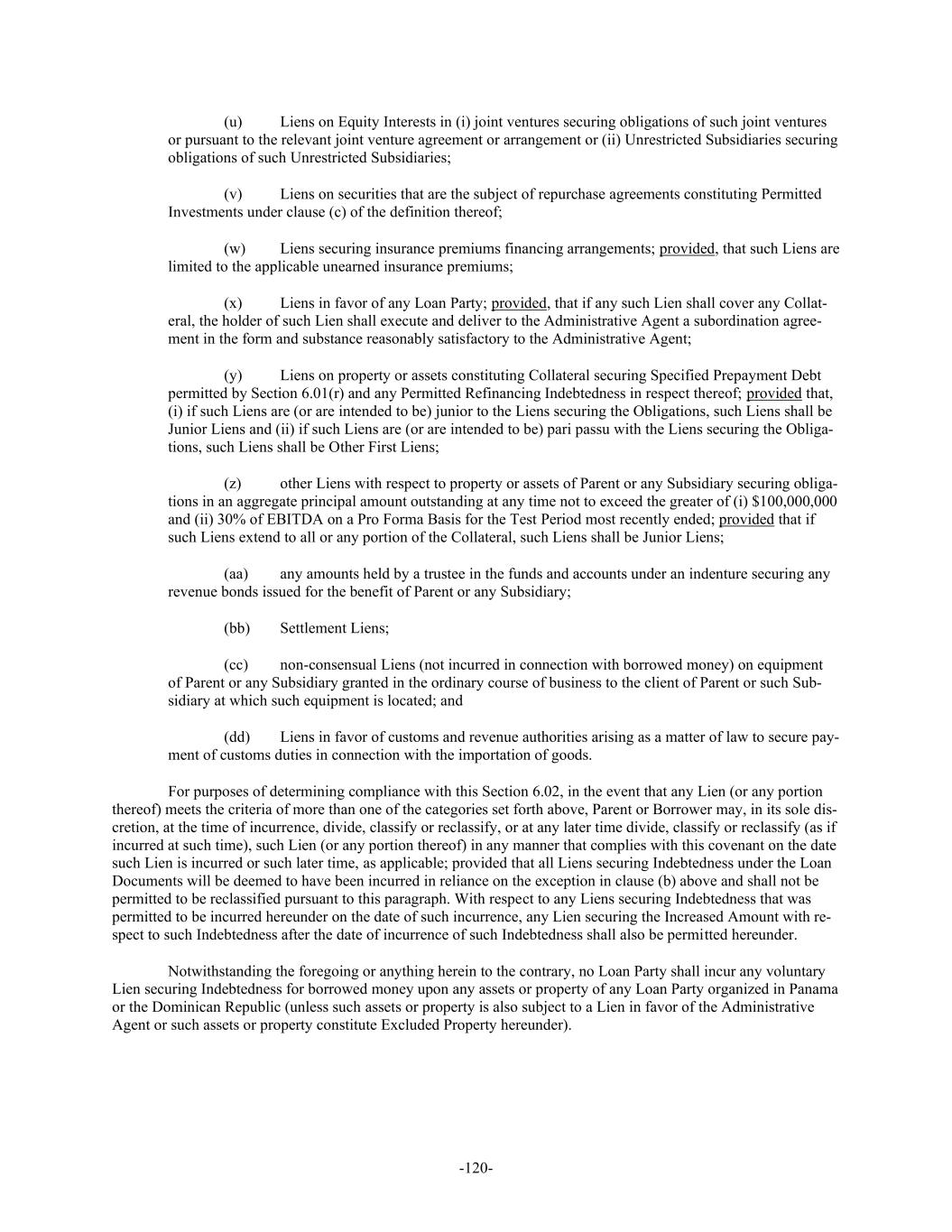 -120- (u) Liens on Equity Interests in (i) joint ventures securing obligations of such joint ventures or pursuant to the relevant joint venture agreement or arrangement or (ii) Unrestricted Subsidiaries securing obligations of such Unrestricted Subsidiaries; (v) Liens on securities that are the subject of repurchase agreements constituting Permitted Investments under clause (c) of the definition thereof; (w) Liens securing insurance premiums financing arrangements; provided, that such Liens are limited to the applicable unearned insurance premiums; (x) Liens in favor of any Loan Party; provided, that if any such Lien shall cover any Collat- eral, the holder of such Lien shall execute and deliver to the Administrative Agent a subordination agree- ment in the form and substance reasonably satisfactory to the Administrative Agent; (y) Liens on property or assets constituting Collateral securing Specified Prepayment Debt permitted by Section 6.01(r) and any Permitted Refinancing Indebtedness in respect thereof; provided that, (i) if such Liens are (or are intended to be) junior to the Liens securing the Obligations, such Liens shall be Junior Liens and (ii) if such Liens are (or are intended to be) pari passu with the Liens securing the Obliga- tions, such Liens shall be Other First Liens; (z) other Liens with respect to property or assets of Parent or any Subsidiary securing obliga- tions in an aggregate principal amount outstanding at any time not to exceed the greater of (i) $100,000,000 and (ii) 30% of EBITDA on a Pro Forma Basis for the Test Period most recently ended; provided that if such Liens extend to all or any portion of the Collateral, such Liens shall be Junior Liens; (aa) any amounts held by a trustee in the funds and accounts under an indenture securing any revenue bonds issued for the benefit of Parent or any Subsidiary; (bb) Settlement Liens; (cc) non-consensual Liens (not incurred in connection with borrowed money) on equipment of Parent or any Subsidiary granted in the ordinary course of business to the client of Parent or such Sub- sidiary at which such equipment is located; and (dd) Liens in favor of customs and revenue authorities arising as a matter of law to secure pay- ment of customs duties in connection with the importation of goods. For purposes of determining compliance with this Section 6.02, in the event that any Lien (or any portion thereof) meets the criteria of more than one of the categories set forth above, Parent or Borrower may, in its sole dis- cretion, at the time of incurrence, divide, classify or reclassify, or at any later time divide, classify or reclassify (as if incurred at such time), such Lien (or any portion thereof) in any manner that complies with this covenant on the date such Lien is incurred or such later time, as applicable; provided that all Liens securing Indebtedness under the Loan Documents will be deemed to have been incurred in reliance on the exception in clause (b) above and shall not be permitted to be reclassified pursuant to this paragraph. With respect to any Liens securing Indebtedness that was permitted to be incurred hereunder on the date of such incurrence, any Lien securing the Increased Amount with re- spect to such Indebtedness after the date of incurrence of such Indebtedness shall also be permitted hereunder. Notwithstanding the foregoing or anything herein to the contrary, no Loan Party shall incur any voluntary Lien securing Indebtedness for borrowed money upon any assets or property of any Loan Party organized in Panama or the Dominican Republic (unless such assets or property is also subject to a Lien in favor of the Administrative Agent or such assets or property constitute Excluded Property hereunder).