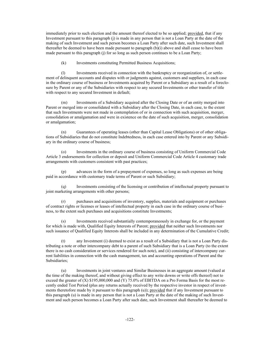 -122- immediately prior to such election and the amount thereof elected to be so applied; provided, that if any Investment pursuant to this paragraph (j) is made in any person that is not a Loan Party at the date of the making of such Investment and such person becomes a Loan Party after such date, such Investment shall thereafter be deemed to have been made pursuant to paragraph (b)(i) above and shall cease to have been made pursuant to this paragraph (j) for so long as such person continues to be a Loan Party; (k) Investments constituting Permitted Business Acquisitions; (l) Investments received in connection with the bankruptcy or reorganization of, or settle- ment of delinquent accounts and disputes with or judgments against, customers and suppliers, in each case in the ordinary course of business or Investments acquired by Parent or a Subsidiary as a result of a foreclo- sure by Parent or any of the Subsidiaries with respect to any secured Investments or other transfer of title with respect to any secured Investment in default; (m) Investments of a Subsidiary acquired after the Closing Date or of an entity merged into Parent or merged into or consolidated with a Subsidiary after the Closing Date, in each case, to the extent that such Investments were not made in contemplation of or in connection with such acquisition, merger, consolidation or amalgamation and were in existence on the date of such acquisition, merger, consolidation or amalgamation; (n) Guarantees of operating leases (other than Capital Lease Obligations) or of other obliga- tions of Subsidiaries that do not constitute Indebtedness, in each case entered into by Parent or any Subsidi- ary in the ordinary course of business; (o) Investments in the ordinary course of business consisting of Uniform Commercial Code Article 3 endorsements for collection or deposit and Uniform Commercial Code Article 4 customary trade arrangements with customers consistent with past practices; (p) advances in the form of a prepayment of expenses, so long as such expenses are being paid in accordance with customary trade terms of Parent or such Subsidiary; (q) Investments consisting of the licensing or contribution of intellectual property pursuant to joint marketing arrangements with other persons; (r) purchases and acquisitions of inventory, supplies, materials and equipment or purchases of contract rights or licenses or leases of intellectual property in each case in the ordinary course of busi- ness, to the extent such purchases and acquisitions constitute Investments; (s) Investments received substantially contemporaneously in exchange for, or the payment for which is made with, Qualified Equity Interests of Parent; provided that neither such Investments nor such issuance of Qualified Equity Interests shall be included in any determination of the Cumulative Credit; (t) any Investment (i) deemed to exist as a result of a Subsidiary that is not a Loan Party dis- tributing a note or other intercompany debt to a parent of such Subsidiary that is a Loan Party (to the extent there is no cash consideration or services rendered for such note), and (ii) consisting of intercompany cur- rent liabilities in connection with the cash management, tax and accounting operations of Parent and the Subsidiaries; (u) Investments in joint ventures and Similar Businesses in an aggregate amount (valued at the time of the making thereof, and without giving effect to any write downs or write offs thereof) not to exceed the greater of (X) $195,000,000 and (Y) 75.0% of EBITDA on a Pro Forma Basis for the most re- cently ended Test Period (plus any returns actually received by the respective investor in respect of invest- ments theretofore made by it pursuant to this paragraph (u)); provided that if any Investment pursuant to this paragraph (u) is made in any person that is not a Loan Party at the date of the making of such Invest- ment and such person becomes a Loan Party after such date, such Investment shall thereafter be deemed to