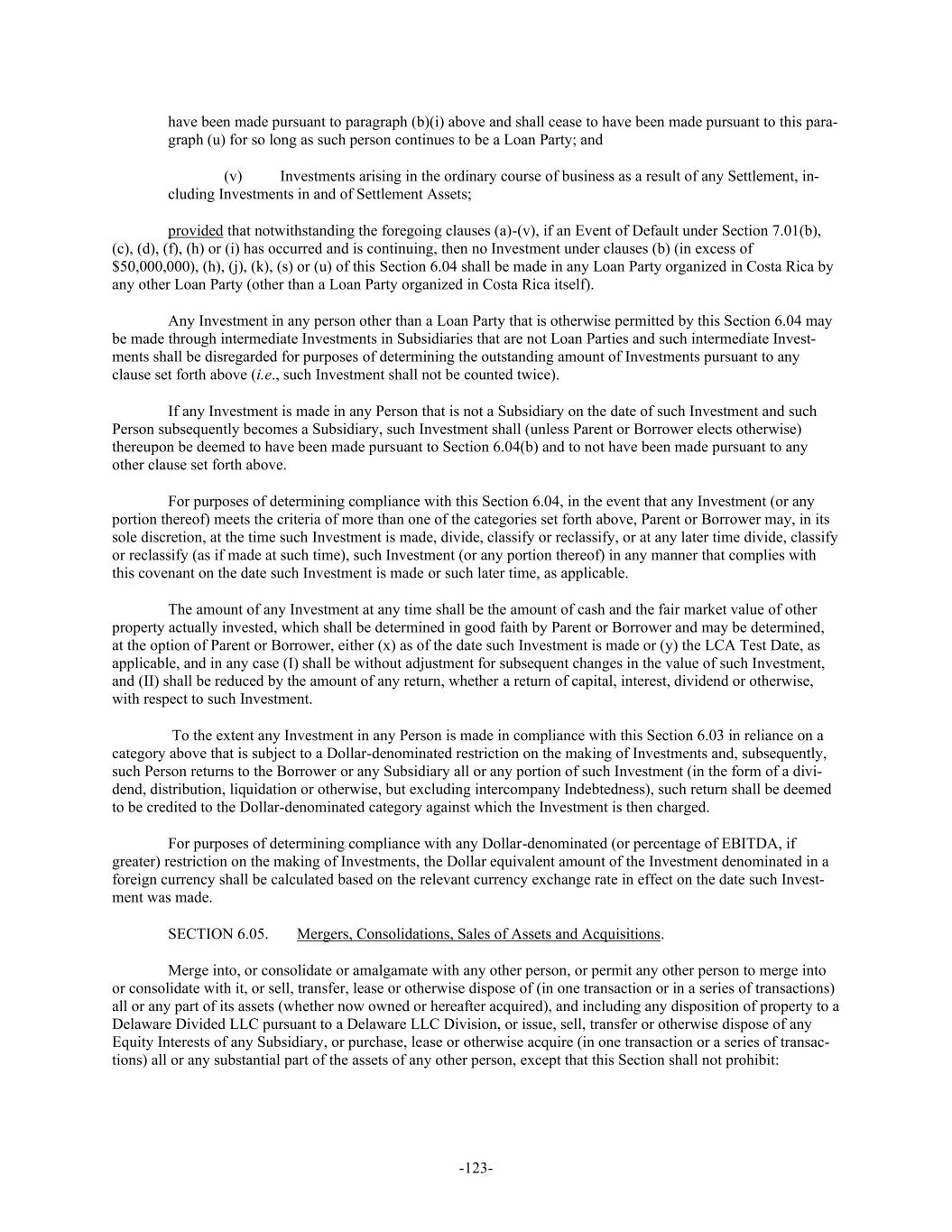 -123- have been made pursuant to paragraph (b)(i) above and shall cease to have been made pursuant to this para- graph (u) for so long as such person continues to be a Loan Party; and (v) Investments arising in the ordinary course of business as a result of any Settlement, in- cluding Investments in and of Settlement Assets; provided that notwithstanding the foregoing clauses (a)-(v), if an Event of Default under Section 7.01(b), (c), (d), (f), (h) or (i) has occurred and is continuing, then no Investment under clauses (b) (in excess of $50,000,000), (h), (j), (k), (s) or (u) of this Section 6.04 shall be made in any Loan Party organized in Costa Rica by any other Loan Party (other than a Loan Party organized in Costa Rica itself). Any Investment in any person other than a Loan Party that is otherwise permitted by this Section 6.04 may be made through intermediate Investments in Subsidiaries that are not Loan Parties and such intermediate Invest- ments shall be disregarded for purposes of determining the outstanding amount of Investments pursuant to any clause set forth above (i.e., such Investment shall not be counted twice). If any Investment is made in any Person that is not a Subsidiary on the date of such Investment and such Person subsequently becomes a Subsidiary, such Investment shall (unless Parent or Borrower elects otherwise) thereupon be deemed to have been made pursuant to Section 6.04(b) and to not have been made pursuant to any other clause set forth above. For purposes of determining compliance with this Section 6.04, in the event that any Investment (or any portion thereof) meets the criteria of more than one of the categories set forth above, Parent or Borrower may, in its sole discretion, at the time such Investment is made, divide, classify or reclassify, or at any later time divide, classify or reclassify (as if made at such time), such Investment (or any portion thereof) in any manner that complies with this covenant on the date such Investment is made or such later time, as applicable. The amount of any Investment at any time shall be the amount of cash and the fair market value of other property actually invested, which shall be determined in good faith by Parent or Borrower and may be determined, at the option of Parent or Borrower, either (x) as of the date such Investment is made or (y) the LCA Test Date, as applicable, and in any case (I) shall be without adjustment for subsequent changes in the value of such Investment, and (II) shall be reduced by the amount of any return, whether a return of capital, interest, dividend or otherwise, with respect to such Investment. To the extent any Investment in any Person is made in compliance with this Section 6.03 in reliance on a category above that is subject to a Dollar-denominated restriction on the making of Investments and, subsequently, such Person returns to the Borrower or any Subsidiary all or any portion of such Investment (in the form of a divi- dend, distribution, liquidation or otherwise, but excluding intercompany Indebtedness), such return shall be deemed to be credited to the Dollar-denominated category against which the Investment is then charged. For purposes of determining compliance with any Dollar-denominated (or percentage of EBITDA, if greater) restriction on the making of Investments, the Dollar equivalent amount of the Investment denominated in a foreign currency shall be calculated based on the relevant currency exchange rate in effect on the date such Invest- ment was made. SECTION 6.05. Mergers, Consolidations, Sales of Assets and Acquisitions. Merge into, or consolidate or amalgamate with any other person, or permit any other person to merge into or consolidate with it, or sell, transfer, lease or otherwise dispose of (in one transaction or in a series of transactions) all or any part of its assets (whether now owned or hereafter acquired), and including any disposition of property to a Delaware Divided LLC pursuant to a Delaware LLC Division, or issue, sell, transfer or otherwise dispose of any Equity Interests of any Subsidiary, or purchase, lease or otherwise acquire (in one transaction or a series of transac- tions) all or any substantial part of the assets of any other person, except that this Section shall not prohibit: