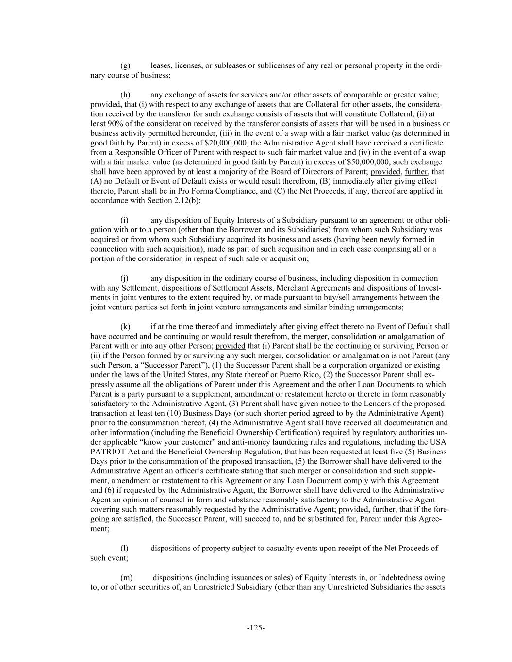 -125- (g) leases, licenses, or subleases or sublicenses of any real or personal property in the ordi- nary course of business; (h) any exchange of assets for services and/or other assets of comparable or greater value; provided, that (i) with respect to any exchange of assets that are Collateral for other assets, the considera- tion received by the transferor for such exchange consists of assets that will constitute Collateral, (ii) at least 90% of the consideration received by the transferor consists of assets that will be used in a business or business activity permitted hereunder, (iii) in the event of a swap with a fair market value (as determined in good faith by Parent) in excess of $20,000,000, the Administrative Agent shall have received a certificate from a Responsible Officer of Parent with respect to such fair market value and (iv) in the event of a swap with a fair market value (as determined in good faith by Parent) in excess of $50,000,000, such exchange shall have been approved by at least a majority of the Board of Directors of Parent; provided, further, that (A) no Default or Event of Default exists or would result therefrom, (B) immediately after giving effect thereto, Parent shall be in Pro Forma Compliance, and (C) the Net Proceeds, if any, thereof are applied in accordance with Section 2.12(b); (i) any disposition of Equity Interests of a Subsidiary pursuant to an agreement or other obli- gation with or to a person (other than the Borrower and its Subsidiaries) from whom such Subsidiary was acquired or from whom such Subsidiary acquired its business and assets (having been newly formed in connection with such acquisition), made as part of such acquisition and in each case comprising all or a portion of the consideration in respect of such sale or acquisition; (j) any disposition in the ordinary course of business, including disposition in connection with any Settlement, dispositions of Settlement Assets, Merchant Agreements and dispositions of Invest- ments in joint ventures to the extent required by, or made pursuant to buy/sell arrangements between the joint venture parties set forth in joint venture arrangements and similar binding arrangements; (k) if at the time thereof and immediately after giving effect thereto no Event of Default shall have occurred and be continuing or would result therefrom, the merger, consolidation or amalgamation of Parent with or into any other Person; provided that (i) Parent shall be the continuing or surviving Person or (ii) if the Person formed by or surviving any such merger, consolidation or amalgamation is not Parent (any such Person, a “Successor Parent”), (1) the Successor Parent shall be a corporation organized or existing under the laws of the United States, any State thereof or Puerto Rico, (2) the Successor Parent shall ex- pressly assume all the obligations of Parent under this Agreement and the other Loan Documents to which Parent is a party pursuant to a supplement, amendment or restatement hereto or thereto in form reasonably satisfactory to the Administrative Agent, (3) Parent shall have given notice to the Lenders of the proposed transaction at least ten (10) Business Days (or such shorter period agreed to by the Administrative Agent) prior to the consummation thereof, (4) the Administrative Agent shall have received all documentation and other information (including the Beneficial Ownership Certification) required by regulatory authorities un- der applicable “know your customer” and anti-money laundering rules and regulations, including the USA PATRIOT Act and the Beneficial Ownership Regulation, that has been requested at least five (5) Business Days prior to the consummation of the proposed transaction, (5) the Borrower shall have delivered to the Administrative Agent an officer’s certificate stating that such merger or consolidation and such supple- ment, amendment or restatement to this Agreement or any Loan Document comply with this Agreement and (6) if requested by the Administrative Agent, the Borrower shall have delivered to the Administrative Agent an opinion of counsel in form and substance reasonably satisfactory to the Administrative Agent covering such matters reasonably requested by the Administrative Agent; provided, further, that if the fore- going are satisfied, the Successor Parent, will succeed to, and be substituted for, Parent under this Agree- ment; (l) dispositions of property subject to casualty events upon receipt of the Net Proceeds of such event; (m) dispositions (including issuances or sales) of Equity Interests in, or Indebtedness owing to, or of other securities of, an Unrestricted Subsidiary (other than any Unrestricted Subsidiaries the assets