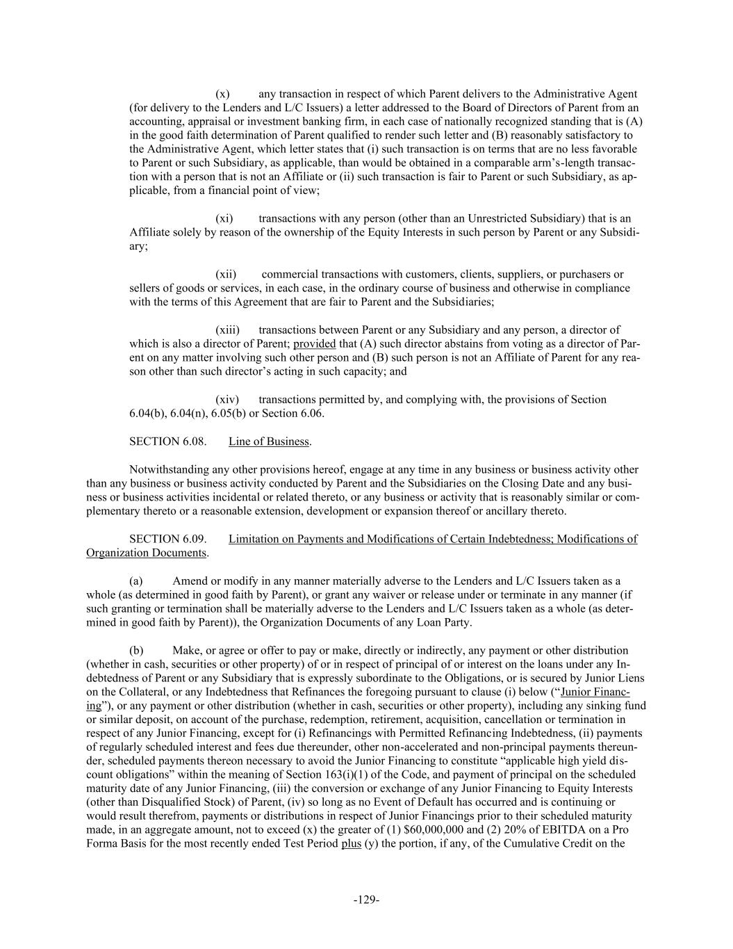 -129- (x) any transaction in respect of which Parent delivers to the Administrative Agent (for delivery to the Lenders and L/C Issuers) a letter addressed to the Board of Directors of Parent from an accounting, appraisal or investment banking firm, in each case of nationally recognized standing that is (A) in the good faith determination of Parent qualified to render such letter and (B) reasonably satisfactory to the Administrative Agent, which letter states that (i) such transaction is on terms that are no less favorable to Parent or such Subsidiary, as applicable, than would be obtained in a comparable arm’s-length transac- tion with a person that is not an Affiliate or (ii) such transaction is fair to Parent or such Subsidiary, as ap- plicable, from a financial point of view; (xi) transactions with any person (other than an Unrestricted Subsidiary) that is an Affiliate solely by reason of the ownership of the Equity Interests in such person by Parent or any Subsidi- ary; (xii) commercial transactions with customers, clients, suppliers, or purchasers or sellers of goods or services, in each case, in the ordinary course of business and otherwise in compliance with the terms of this Agreement that are fair to Parent and the Subsidiaries; (xiii) transactions between Parent or any Subsidiary and any person, a director of which is also a director of Parent; provided that (A) such director abstains from voting as a director of Par- ent on any matter involving such other person and (B) such person is not an Affiliate of Parent for any rea- son other than such director’s acting in such capacity; and (xiv) transactions permitted by, and complying with, the provisions of Section 6.04(b), 6.04(n), 6.05(b) or Section 6.06. SECTION 6.08. Line of Business. Notwithstanding any other provisions hereof, engage at any time in any business or business activity other than any business or business activity conducted by Parent and the Subsidiaries on the Closing Date and any busi- ness or business activities incidental or related thereto, or any business or activity that is reasonably similar or com- plementary thereto or a reasonable extension, development or expansion thereof or ancillary thereto. SECTION 6.09. Limitation on Payments and Modifications of Certain Indebtedness; Modifications of Organization Documents. (a) Amend or modify in any manner materially adverse to the Lenders and L/C Issuers taken as a whole (as determined in good faith by Parent), or grant any waiver or release under or terminate in any manner (if such granting or termination shall be materially adverse to the Lenders and L/C Issuers taken as a whole (as deter- mined in good faith by Parent)), the Organization Documents of any Loan Party. (b) Make, or agree or offer to pay or make, directly or indirectly, any payment or other distribution (whether in cash, securities or other property) of or in respect of principal of or interest on the loans under any In- debtedness of Parent or any Subsidiary that is expressly subordinate to the Obligations, or is secured by Junior Liens on the Collateral, or any Indebtedness that Refinances the foregoing pursuant to clause (i) below (“Junior Financ- ing”), or any payment or other distribution (whether in cash, securities or other property), including any sinking fund or similar deposit, on account of the purchase, redemption, retirement, acquisition, cancellation or termination in respect of any Junior Financing, except for (i) Refinancings with Permitted Refinancing Indebtedness, (ii) payments of regularly scheduled interest and fees due thereunder, other non-accelerated and non-principal payments thereun- der, scheduled payments thereon necessary to avoid the Junior Financing to constitute “applicable high yield dis- count obligations” within the meaning of Section 163(i)(1) of the Code, and payment of principal on the scheduled maturity date of any Junior Financing, (iii) the conversion or exchange of any Junior Financing to Equity Interests (other than Disqualified Stock) of Parent, (iv) so long as no Event of Default has occurred and is continuing or would result therefrom, payments or distributions in respect of Junior Financings prior to their scheduled maturity made, in an aggregate amount, not to exceed (x) the greater of (1) $60,000,000 and (2) 20% of EBITDA on a Pro Forma Basis for the most recently ended Test Period plus (y) the portion, if any, of the Cumulative Credit on the