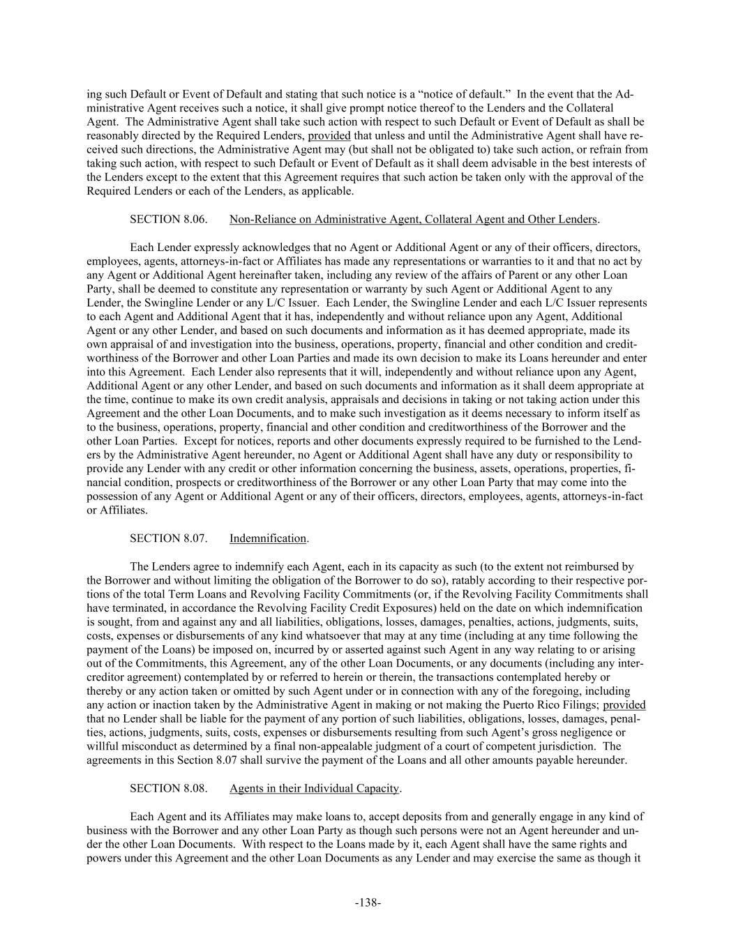 -138- ing such Default or Event of Default and stating that such notice is a “notice of default.” In the event that the Ad- ministrative Agent receives such a notice, it shall give prompt notice thereof to the Lenders and the Collateral Agent. The Administrative Agent shall take such action with respect to such Default or Event of Default as shall be reasonably directed by the Required Lenders, provided that unless and until the Administrative Agent shall have re- ceived such directions, the Administrative Agent may (but shall not be obligated to) take such action, or refrain from taking such action, with respect to such Default or Event of Default as it shall deem advisable in the best interests of the Lenders except to the extent that this Agreement requires that such action be taken only with the approval of the Required Lenders or each of the Lenders, as applicable. SECTION 8.06. Non-Reliance on Administrative Agent, Collateral Agent and Other Lenders. Each Lender expressly acknowledges that no Agent or Additional Agent or any of their officers, directors, employees, agents, attorneys-in-fact or Affiliates has made any representations or warranties to it and that no act by any Agent or Additional Agent hereinafter taken, including any review of the affairs of Parent or any other Loan Party, shall be deemed to constitute any representation or warranty by such Agent or Additional Agent to any Lender, the Swingline Lender or any L/C Issuer. Each Lender, the Swingline Lender and each L/C Issuer represents to each Agent and Additional Agent that it has, independently and without reliance upon any Agent, Additional Agent or any other Lender, and based on such documents and information as it has deemed appropriate, made its own appraisal of and investigation into the business, operations, property, financial and other condition and credit- worthiness of the Borrower and other Loan Parties and made its own decision to make its Loans hereunder and enter into this Agreement. Each Lender also represents that it will, independently and without reliance upon any Agent, Additional Agent or any other Lender, and based on such documents and information as it shall deem appropriate at the time, continue to make its own credit analysis, appraisals and decisions in taking or not taking action under this Agreement and the other Loan Documents, and to make such investigation as it deems necessary to inform itself as to the business, operations, property, financial and other condition and creditworthiness of the Borrower and the other Loan Parties. Except for notices, reports and other documents expressly required to be furnished to the Lend- ers by the Administrative Agent hereunder, no Agent or Additional Agent shall have any duty or responsibility to provide any Lender with any credit or other information concerning the business, assets, operations, properties, fi- nancial condition, prospects or creditworthiness of the Borrower or any other Loan Party that may come into the possession of any Agent or Additional Agent or any of their officers, directors, employees, agents, attorneys-in-fact or Affiliates. SECTION 8.07. Indemnification. The Lenders agree to indemnify each Agent, each in its capacity as such (to the extent not reimbursed by the Borrower and without limiting the obligation of the Borrower to do so), ratably according to their respective por- tions of the total Term Loans and Revolving Facility Commitments (or, if the Revolving Facility Commitments shall have terminated, in accordance the Revolving Facility Credit Exposures) held on the date on which indemnification is sought, from and against any and all liabilities, obligations, losses, damages, penalties, actions, judgments, suits, costs, expenses or disbursements of any kind whatsoever that may at any time (including at any time following the payment of the Loans) be imposed on, incurred by or asserted against such Agent in any way relating to or arising out of the Commitments, this Agreement, any of the other Loan Documents, or any documents (including any inter- creditor agreement) contemplated by or referred to herein or therein, the transactions contemplated hereby or thereby or any action taken or omitted by such Agent under or in connection with any of the foregoing, including any action or inaction taken by the Administrative Agent in making or not making the Puerto Rico Filings; provided that no Lender shall be liable for the payment of any portion of such liabilities, obligations, losses, damages, penal- ties, actions, judgments, suits, costs, expenses or disbursements resulting from such Agent’s gross negligence or willful misconduct as determined by a final non-appealable judgment of a court of competent jurisdiction. The agreements in this Section 8.07 shall survive the payment of the Loans and all other amounts payable hereunder. SECTION 8.08. Agents in their Individual Capacity. Each Agent and its Affiliates may make loans to, accept deposits from and generally engage in any kind of business with the Borrower and any other Loan Party as though such persons were not an Agent hereunder and un- der the other Loan Documents. With respect to the Loans made by it, each Agent shall have the same rights and powers under this Agreement and the other Loan Documents as any Lender and may exercise the same as though it