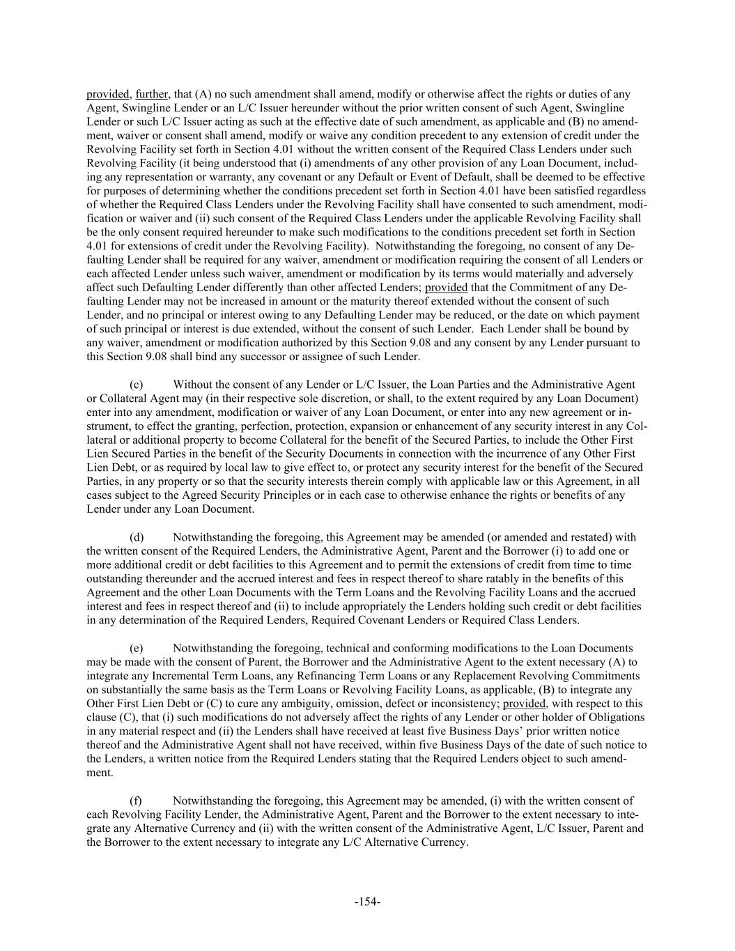-154- provided, further, that (A) no such amendment shall amend, modify or otherwise affect the rights or duties of any Agent, Swingline Lender or an L/C Issuer hereunder without the prior written consent of such Agent, Swingline Lender or such L/C Issuer acting as such at the effective date of such amendment, as applicable and (B) no amend- ment, waiver or consent shall amend, modify or waive any condition precedent to any extension of credit under the Revolving Facility set forth in Section 4.01 without the written consent of the Required Class Lenders under such Revolving Facility (it being understood that (i) amendments of any other provision of any Loan Document, includ- ing any representation or warranty, any covenant or any Default or Event of Default, shall be deemed to be effective for purposes of determining whether the conditions precedent set forth in Section 4.01 have been satisfied regardless of whether the Required Class Lenders under the Revolving Facility shall have consented to such amendment, modi- fication or waiver and (ii) such consent of the Required Class Lenders under the applicable Revolving Facility shall be the only consent required hereunder to make such modifications to the conditions precedent set forth in Section 4.01 for extensions of credit under the Revolving Facility). Notwithstanding the foregoing, no consent of any De- faulting Lender shall be required for any waiver, amendment or modification requiring the consent of all Lenders or each affected Lender unless such waiver, amendment or modification by its terms would materially and adversely affect such Defaulting Lender differently than other affected Lenders; provided that the Commitment of any De- faulting Lender may not be increased in amount or the maturity thereof extended without the consent of such Lender, and no principal or interest owing to any Defaulting Lender may be reduced, or the date on which payment of such principal or interest is due extended, without the consent of such Lender. Each Lender shall be bound by any waiver, amendment or modification authorized by this Section 9.08 and any consent by any Lender pursuant to this Section 9.08 shall bind any successor or assignee of such Lender. (c) Without the consent of any Lender or L/C Issuer, the Loan Parties and the Administrative Agent or Collateral Agent may (in their respective sole discretion, or shall, to the extent required by any Loan Document) enter into any amendment, modification or waiver of any Loan Document, or enter into any new agreement or in- strument, to effect the granting, perfection, protection, expansion or enhancement of any security interest in any Col- lateral or additional property to become Collateral for the benefit of the Secured Parties, to include the Other First Lien Secured Parties in the benefit of the Security Documents in connection with the incurrence of any Other First Lien Debt, or as required by local law to give effect to, or protect any security interest for the benefit of the Secured Parties, in any property or so that the security interests therein comply with applicable law or this Agreement, in all cases subject to the Agreed Security Principles or in each case to otherwise enhance the rights or benefits of any Lender under any Loan Document. (d) Notwithstanding the foregoing, this Agreement may be amended (or amended and restated) with the written consent of the Required Lenders, the Administrative Agent, Parent and the Borrower (i) to add one or more additional credit or debt facilities to this Agreement and to permit the extensions of credit from time to time outstanding thereunder and the accrued interest and fees in respect thereof to share ratably in the benefits of this Agreement and the other Loan Documents with the Term Loans and the Revolving Facility Loans and the accrued interest and fees in respect thereof and (ii) to include appropriately the Lenders holding such credit or debt facilities in any determination of the Required Lenders, Required Covenant Lenders or Required Class Lenders. (e) Notwithstanding the foregoing, technical and conforming modifications to the Loan Documents may be made with the consent of Parent, the Borrower and the Administrative Agent to the extent necessary (A) to integrate any Incremental Term Loans, any Refinancing Term Loans or any Replacement Revolving Commitments on substantially the same basis as the Term Loans or Revolving Facility Loans, as applicable, (B) to integrate any Other First Lien Debt or (C) to cure any ambiguity, omission, defect or inconsistency; provided, with respect to this clause (C), that (i) such modifications do not adversely affect the rights of any Lender or other holder of Obligations in any material respect and (ii) the Lenders shall have received at least five Business Days’ prior written notice thereof and the Administrative Agent shall not have received, within five Business Days of the date of such notice to the Lenders, a written notice from the Required Lenders stating that the Required Lenders object to such amend- ment. (f) Notwithstanding the foregoing, this Agreement may be amended, (i) with the written consent of each Revolving Facility Lender, the Administrative Agent, Parent and the Borrower to the extent necessary to inte- grate any Alternative Currency and (ii) with the written consent of the Administrative Agent, L/C Issuer, Parent and the Borrower to the extent necessary to integrate any L/C Alternative Currency.
