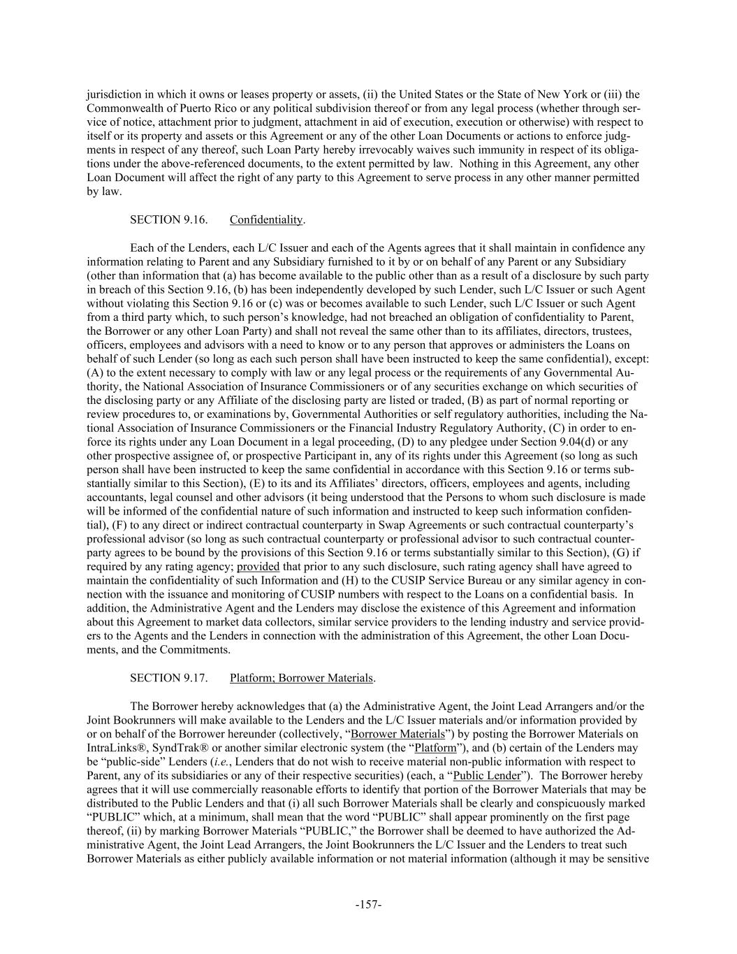 -157- jurisdiction in which it owns or leases property or assets, (ii) the United States or the State of New York or (iii) the Commonwealth of Puerto Rico or any political subdivision thereof or from any legal process (whether through ser- vice of notice, attachment prior to judgment, attachment in aid of execution, execution or otherwise) with respect to itself or its property and assets or this Agreement or any of the other Loan Documents or actions to enforce judg- ments in respect of any thereof, such Loan Party hereby irrevocably waives such immunity in respect of its obliga- tions under the above-referenced documents, to the extent permitted by law. Nothing in this Agreement, any other Loan Document will affect the right of any party to this Agreement to serve process in any other manner permitted by law. SECTION 9.16. Confidentiality. Each of the Lenders, each L/C Issuer and each of the Agents agrees that it shall maintain in confidence any information relating to Parent and any Subsidiary furnished to it by or on behalf of any Parent or any Subsidiary (other than information that (a) has become available to the public other than as a result of a disclosure by such party in breach of this Section 9.16, (b) has been independently developed by such Lender, such L/C Issuer or such Agent without violating this Section 9.16 or (c) was or becomes available to such Lender, such L/C Issuer or such Agent from a third party which, to such person’s knowledge, had not breached an obligation of confidentiality to Parent, the Borrower or any other Loan Party) and shall not reveal the same other than to its affiliates, directors, trustees, officers, employees and advisors with a need to know or to any person that approves or administers the Loans on behalf of such Lender (so long as each such person shall have been instructed to keep the same confidential), except: (A) to the extent necessary to comply with law or any legal process or the requirements of any Governmental Au- thority, the National Association of Insurance Commissioners or of any securities exchange on which securities of the disclosing party or any Affiliate of the disclosing party are listed or traded, (B) as part of normal reporting or review procedures to, or examinations by, Governmental Authorities or self regulatory authorities, including the Na- tional Association of Insurance Commissioners or the Financial Industry Regulatory Authority, (C) in order to en- force its rights under any Loan Document in a legal proceeding, (D) to any pledgee under Section 9.04(d) or any other prospective assignee of, or prospective Participant in, any of its rights under this Agreement (so long as such person shall have been instructed to keep the same confidential in accordance with this Section 9.16 or terms sub- stantially similar to this Section), (E) to its and its Affiliates’ directors, officers, employees and agents, including accountants, legal counsel and other advisors (it being understood that the Persons to whom such disclosure is made will be informed of the confidential nature of such information and instructed to keep such information confiden- tial), (F) to any direct or indirect contractual counterparty in Swap Agreements or such contractual counterparty’s professional advisor (so long as such contractual counterparty or professional advisor to such contractual counter- party agrees to be bound by the provisions of this Section 9.16 or terms substantially similar to this Section), (G) if required by any rating agency; provided that prior to any such disclosure, such rating agency shall have agreed to maintain the confidentiality of such Information and (H) to the CUSIP Service Bureau or any similar agency in con- nection with the issuance and monitoring of CUSIP numbers with respect to the Loans on a confidential basis. In addition, the Administrative Agent and the Lenders may disclose the existence of this Agreement and information about this Agreement to market data collectors, similar service providers to the lending industry and service provid- ers to the Agents and the Lenders in connection with the administration of this Agreement, the other Loan Docu- ments, and the Commitments. SECTION 9.17. Platform; Borrower Materials. The Borrower hereby acknowledges that (a) the Administrative Agent, the Joint Lead Arrangers and/or the Joint Bookrunners will make available to the Lenders and the L/C Issuer materials and/or information provided by or on behalf of the Borrower hereunder (collectively, “Borrower Materials”) by posting the Borrower Materials on IntraLinks®, SyndTrak® or another similar electronic system (the “Platform”), and (b) certain of the Lenders may be “public-side” Lenders (i.e., Lenders that do not wish to receive material non-public information with respect to Parent, any of its subsidiaries or any of their respective securities) (each, a “Public Lender”). The Borrower hereby agrees that it will use commercially reasonable efforts to identify that portion of the Borrower Materials that may be distributed to the Public Lenders and that (i) all such Borrower Materials shall be clearly and conspicuously marked “PUBLIC” which, at a minimum, shall mean that the word “PUBLIC” shall appear prominently on the first page thereof, (ii) by marking Borrower Materials “PUBLIC,” the Borrower shall be deemed to have authorized the Ad- ministrative Agent, the Joint Lead Arrangers, the Joint Bookrunners the L/C Issuer and the Lenders to treat such Borrower Materials as either publicly available information or not material information (although it may be sensitive