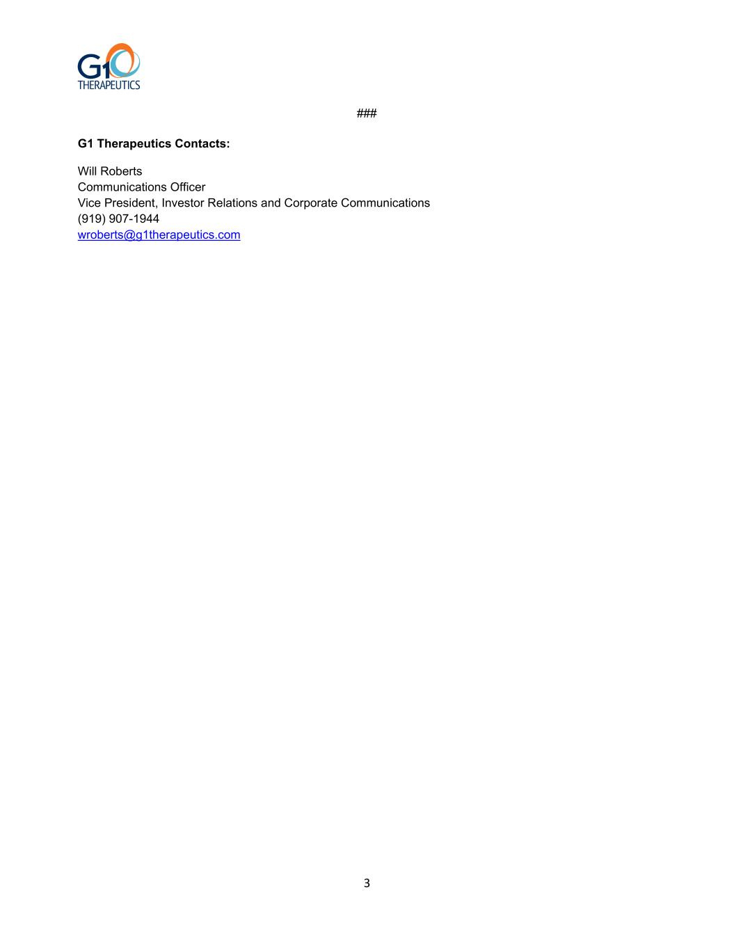 2 existing commercial organization to streamline the Company. These efforts are expected to provide sufficient cash runway to achieve anticipated company profitability in the second half of 2025. Webcast and Conference Call G1 will host a webcast and conference call at 8:30 a.m. ET today to discuss PRESERVE 2. Please note the following process to access the call via telephone: To register and receive a dial in number and unique PIN to access the live conference call, please follow this link to register online. While not required, it is recommended to join 10 minutes prior to the start of the event. A live and archived webcast will be available on the Events & Presentations page of the Company’s website: www.g1therapeutics.com. The webcast will be archived on the same page for 90 days following the event. About G1 Therapeutics G1 Therapeutics, Inc. is a commercial-stage oncology biopharmaceutical company whose mission is to develop and deliver next-generation therapies that improve the lives of those affected by cancer, including the Company’s first commercial product, COSELA® (trilaciclib). G1’s goal is to provide innovative therapeutic advances for people living with cancer. G1 is based in Research Triangle Park, N.C. For additional information, please visit http://www.g1therapeutics.com and follow us on X (formerly known as Twitter) @G1Therapeutics and LinkedIn. G1 Therapeutics® and the G1 Therapeutics logo and COSELA® and the COSELA logo are trademarks of G1 Therapeutics, Inc. Forward-Looking Statements This press release contains forward-looking statements within the meaning of the Private Securities Litigation Reform Act of 1995. Words such as "may," "will," "expect," "plan," "anticipate," “could”, “believe,” “goal”, “projections,” "estimate," "intend," “indicate,” “potential,” “opportunity,” “suggest,” and similar expressions (as well as other words or expressions referencing future events, conditions or circumstances) are intended to identify forward-looking statements. Forward-looking statements in this press release include, but are not limited to, expectations with respect to future performance and development and commercialization of our products, including our focus on ES-SCLC and ex-US partnering on COSELA (trilaciclib), our anticipated cash runway and profitability, and financial guidance for full year 2024. Each of these forward-looking statements involves significant risks and uncertainties that could cause the actual results to differ materially from those discussed in the forward-looking statements. Factors that may cause the company’s actual results to differ from those expressed or implied in the forward-looking statements in this press release are discussed in our filings with the U.S. Securities and Exchange Commission, including the "Risk Factors" sections contained therein and include, but are not limited to, our dependence on the commercial success of COSELA (trilaciclib); the development and commercialization of new drug products is highly competitive; our ability to complete clinical trials for, obtain approvals for and commercialize any of its product candidates; our initial success in ongoing clinical trials may not be indicative of results obtained when these trials are completed or in later stage trials; the inherent uncertainties associated with developing new products or technologies and operating as a commercial-stage company; chemotherapy shortages and market conditions. Our business is subject to substantial risks and uncertainties, including those referenced above. Investors, potential investors, and others should give careful consideration to these risks and uncertainties. We caution readers not to place undue reliance upon any forward-looking statements, which speak only as of the date made. Except as required by law, we assume no obligation to update any forward-looking statements contained herein to reflect any change in expectations, even as new information becomes available.