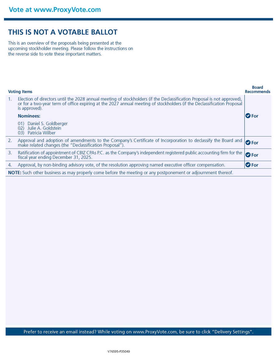 | ● | Proposal 2. To elect three Class I directors to the Board for a three-year term of office expiring at the 2028 annual meeting of stockholders (if Proposal Number 1 is not approved), or for a two-year term of office expiring at the 2027 annual meeting of stockholders (if Proposal Number 1 is approved). | |