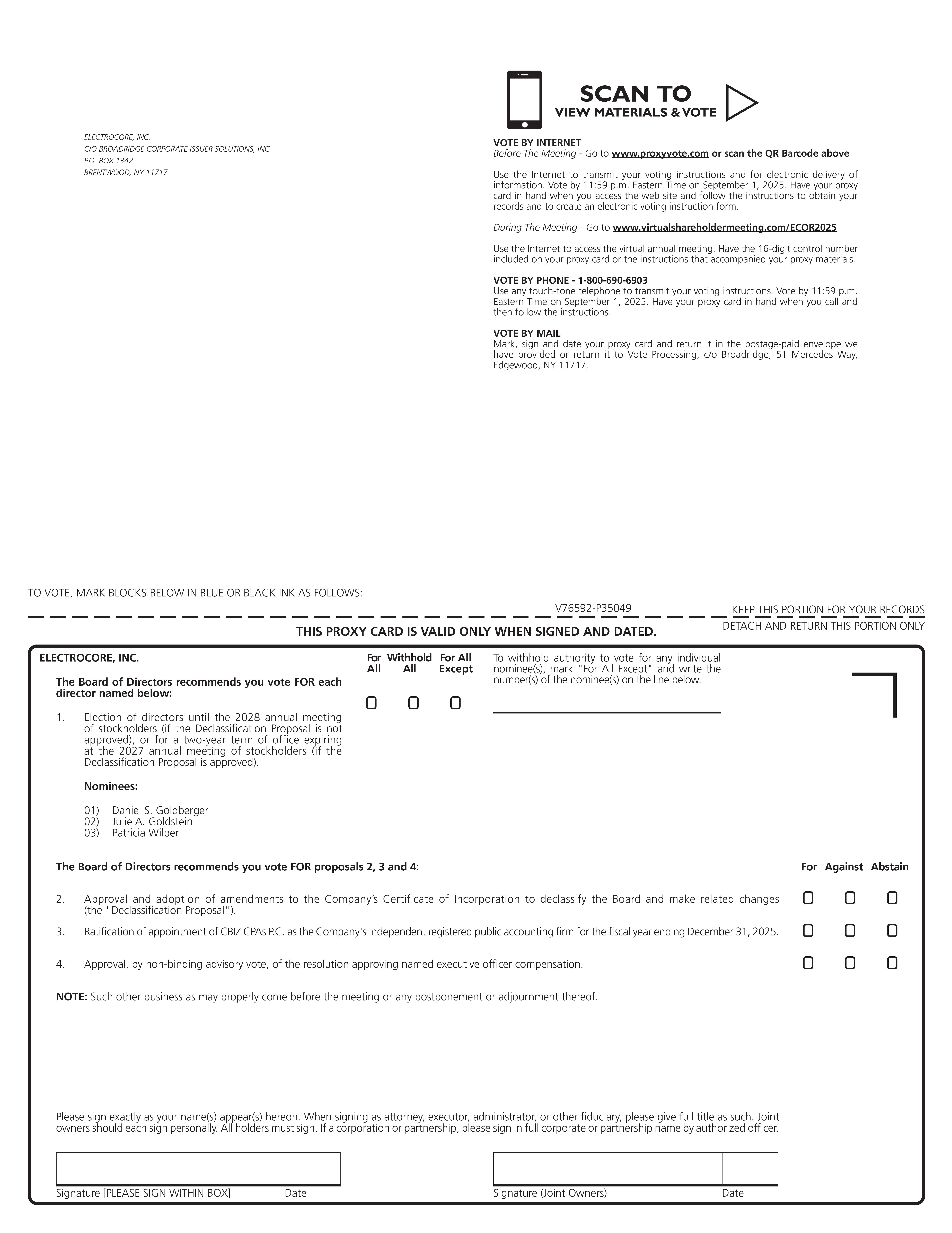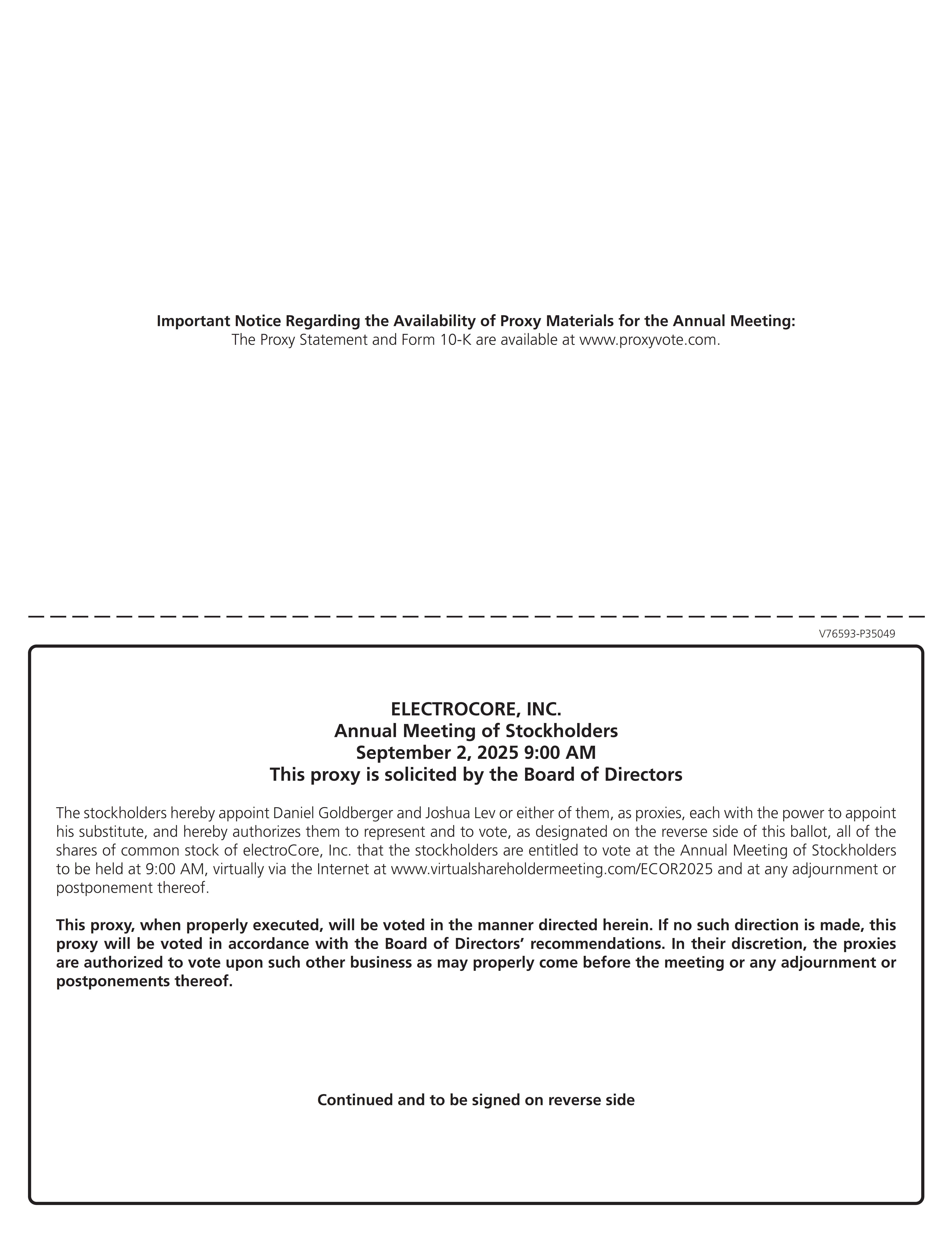 electroCore, Inc. (“electroCore”, the “Company”, we” or “us”) is sending you these proxy materials because the Board of Directors (the “Board”) of electroCore is soliciting your proxy to vote at the 2025 Annual Meeting of Stockholders (the “Annual Meeting”), including at any adjournments or postponements of the Annual Meeting. You are invited to attend the Annual Meeting virtually to vote on the proposals described in this proxy statement. However, you do not need to attend the Annual Meeting to vote your shares. Instead, you may simply complete, sign and return the related proxy card, or follow the instructions below to submit your proxy by phone or online.