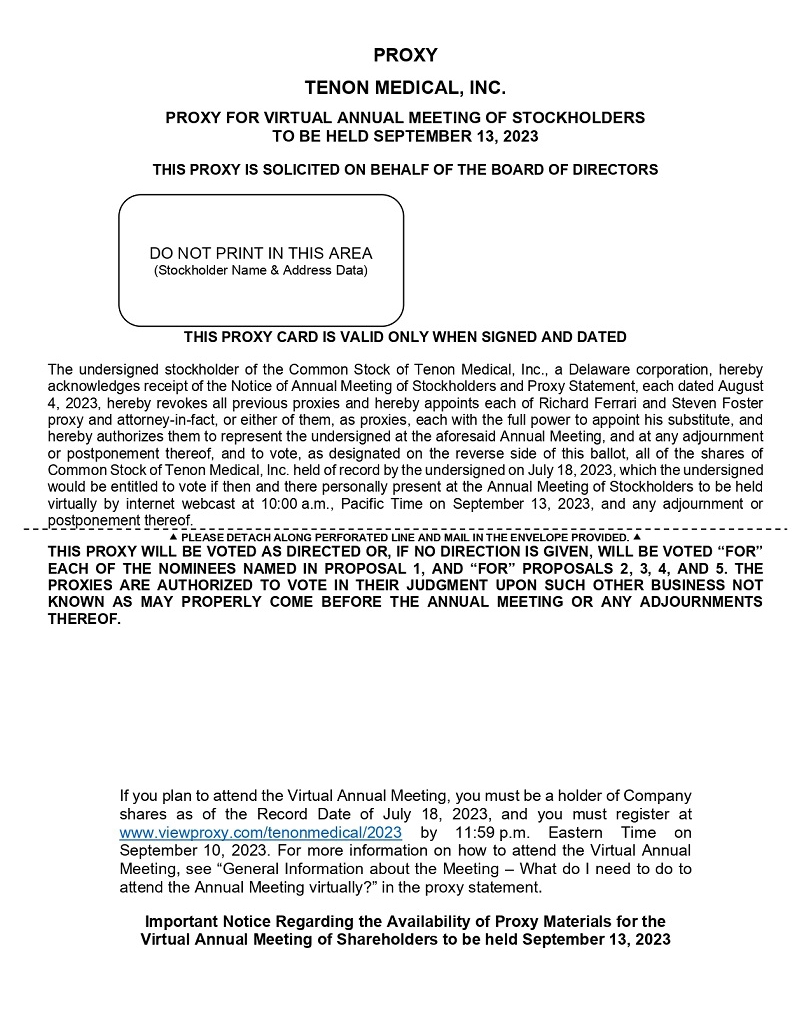 We are pleased to invite you to attend the Annual Meeting of Stockholders of Tenon Medical, Inc. (the “Annual Meeting). Due to the continuing public health impact of the COVID-19 pandemic and to protect the health and well-being of our stockholders, directors and employees, the Annual Meeting will be held virtually via live webcast on Wednesday, September 13, 2023, at 10:00 a.m. Pacific Time.