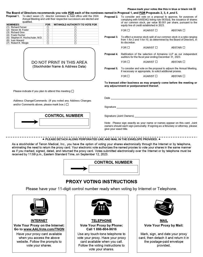 The 2023 Annual Meeting of Stockholders of Tenon Medical, Inc. will be held virtually on September 13, 2023 at 10:00 a.m. Pacific Time. As a Registered Holder, you may attend the Annual Meeting via the internet and vote your shares during the Annual Meeting by first registering at www.viewproxy.com/Tenonmedical/2023 and then using your Virtual Control Number below. Your registration must be received by 11:59 p.m. Pacific Time on September 10, 2023. On the day of the Annual Meeting, if you have properly registered, you may log in using the password you received via email in your registration confirmation and follow the instructions to vote your shares. Please have your Virtual Control Number with you during the Annual Meeting in order to vote. Further instructions on how to attend and vote during the Annual Meeting are contained in the Proxy Statement in the sections titled “Questions and Answers About The Meeting and Voting - How do I vote at the Annual Meeting?”