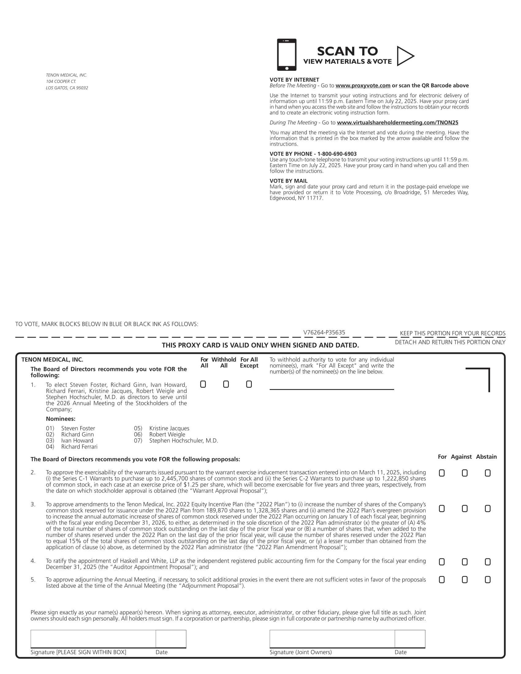 Signature [PLEASE SIGN WITHIN BOX] Date Signature (Joint Owners) Date TO VOTE, MARK BLOCKS BELOW IN BLUE OR BLACK INK AS FOLLOWS: KEEP THIS PORTION FOR YOUR RECORDS THIS PROXY CARD IS VALID ONLY WHEN SIGNED AND DATED. DETACH AND RETURN THIS PORTION ONLY V76264-P35635 Nominees: ! ! ! 5. To approve adjourning the Annual Meeting, if necessary, to solicit additional proxies in the event there are not sufficient votes in favor of the proposals listed above at the time of the Annual Meeting (the “Adjournment Proposal”). 3. To approve amendments to the Tenon Medical, Inc. 2022 Equity Incentive Plan (the “2022 Plan”) to (i) increase the number of shares of the Company’s common stock reserved for issuance under the 2022 Plan from 189,870 shares to 1,328,365 shares and (ii) amend the 2022 Plan’s evergreen provision to increase the annual automatic increase of shares of common stock reserved under the 2022 Plan occurring on January 1 of each fiscal year, beginning with the fiscal year ending December 31, 2026, to either, as determined in the sole discretion of the 2022 Plan administrator (x) the greater of (A) 4% of the total number of shares of common stock outstanding on the last day of the prior fiscal year or (B) a number of shares that, when added to the number of shares reserved under the 2022 Plan on the last day of the prior fiscal year, will cause the number of shares reserved under the 2022 Plan to equal 15% of the total shares of common stock outstanding on the last day of the prior fiscal year, or (y) a lesser number than obtained from the application of clause (x) above, as determined by the 2022 Plan administrator (the “2022 Plan Amendment Proposal”); 1. To elect Steven Foster, Richard Ginn, Ivan Howard, Richard Ferrari, Kristine Jacques, Robert Weigle and Stephen Hochschuler, M.D. as directors to serve until the 2026 Annual Meeting of the Stockholders of the Company; 2. To approve the exercisability of the warrants issued pursuant to the warrant exercise inducement transaction entered into on March 11, 2025, including (i) the Series C-1 Warrants to purchase up to 2,445,700 shares of common stock and (ii) the Series C-2 Warrants to purchase up to 1,222,850 shares of common stock, in each case at an exercise price of $1.25 per share, which will become exercisable for five years and three years, respectively, from the date on which stockholder approval is obtained (the “Warrant Approval Proposal”); 4. To ratify the appointment of Haskell and White, LLP as the independent registered public accounting firm for the Company for the fiscal year ending December 31, 2025 (the “Auditor Appointment Proposal”); and 01) Steven Foster 02) Richard Ginn 03) Ivan Howard 04) Richard Ferrari 05) Kristine Jacques 06) Robert Weigle 07) Stephen Hochschuler, M.D. For All Withhold All For All Except For Against Abstain ! ! ! ! ! ! ! ! ! TENON MEDICAL, INC. To withhold authority to vote for any individual nominee(s), mark "For All Except" and write the The Board of Directors recommends you vote FOR the number(s) of the nominee(s) on the line below. following: The Board of Directors recommends you vote FOR the following proposals: TENON MEDICAL, INC. 104 COOPER CT. LOS GATOS, CA 95032 Please sign exactly as your name(s) appear(s) hereon. When signing as attorney, executor, administrator, or other fiduciary, please give full title as such. Joint owners should each sign personally. All holders must sign. If a corporation or partnership, please sign in full corporate or partnership name by authorized officer. ! ! ! VOTE BY INTERNET Before The Meeting - Go to www.proxyvote.com or scan the QR Barcode above Use the Internet to transmit your voting instructions and for electronic delivery of information up until 11:59 p.m. Eastern Time on July 22, 2025. Have your proxy card in hand when you access the web site and follow the instructions to obtain your records and to create an electronic voting instruction form. During The Meeting - Go to www.virtualshareholdermeeting.com/TNON25 You may attend the meeting via the Internet and vote during the meeting. Have the information that is printed in the box marked by the arrow available and follow the instructions. VOTE BY PHONE - 1-800-690-6903 Use any touch-tone telephone to transmit your voting instructions up until 11:59 p.m. Eastern Time on July 22, 2025. Have your proxy card in hand when you call and then follow the instructions. VOTE BY MAIL Mark, sign and date your proxy card and return it in the postage-paid envelope we have provided or return it to Vote Processing, c/o Broadridge, 51 Mercedes Way, Edgewood, NY 11717. SCAN TO VIEW MATERIALS & VOTE w